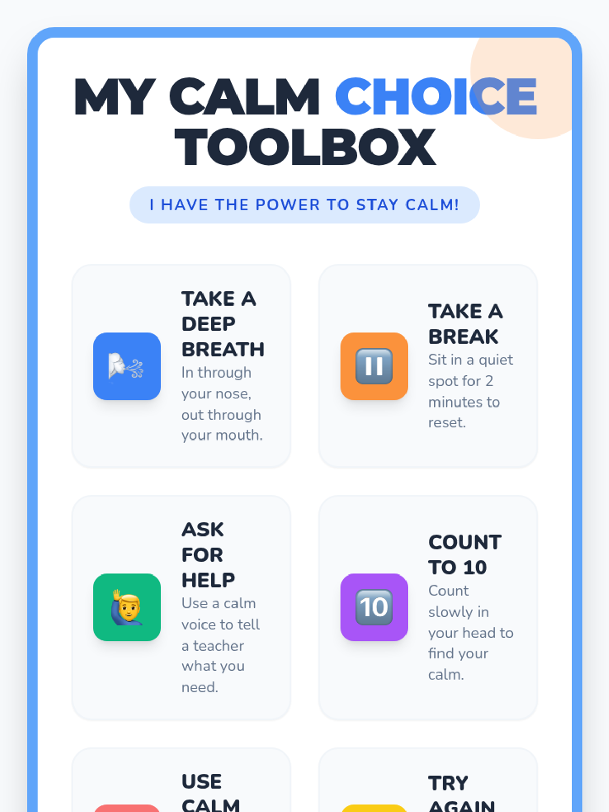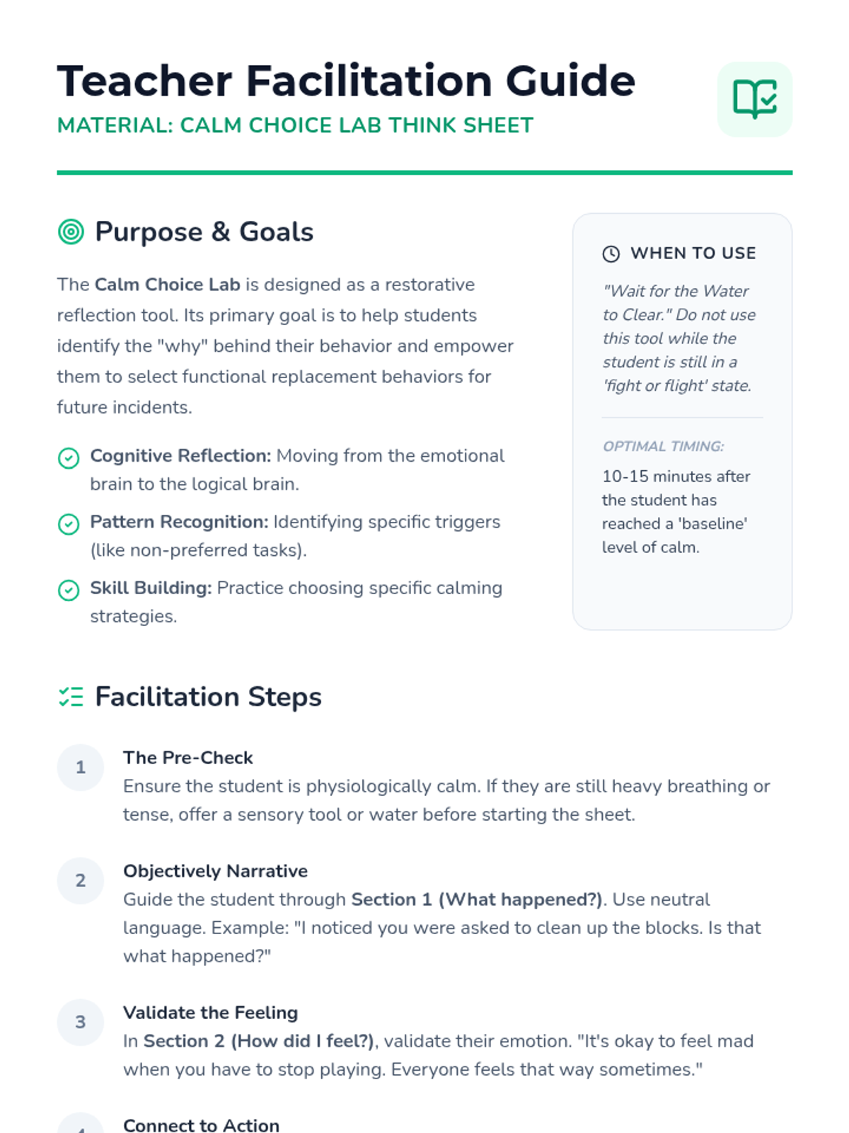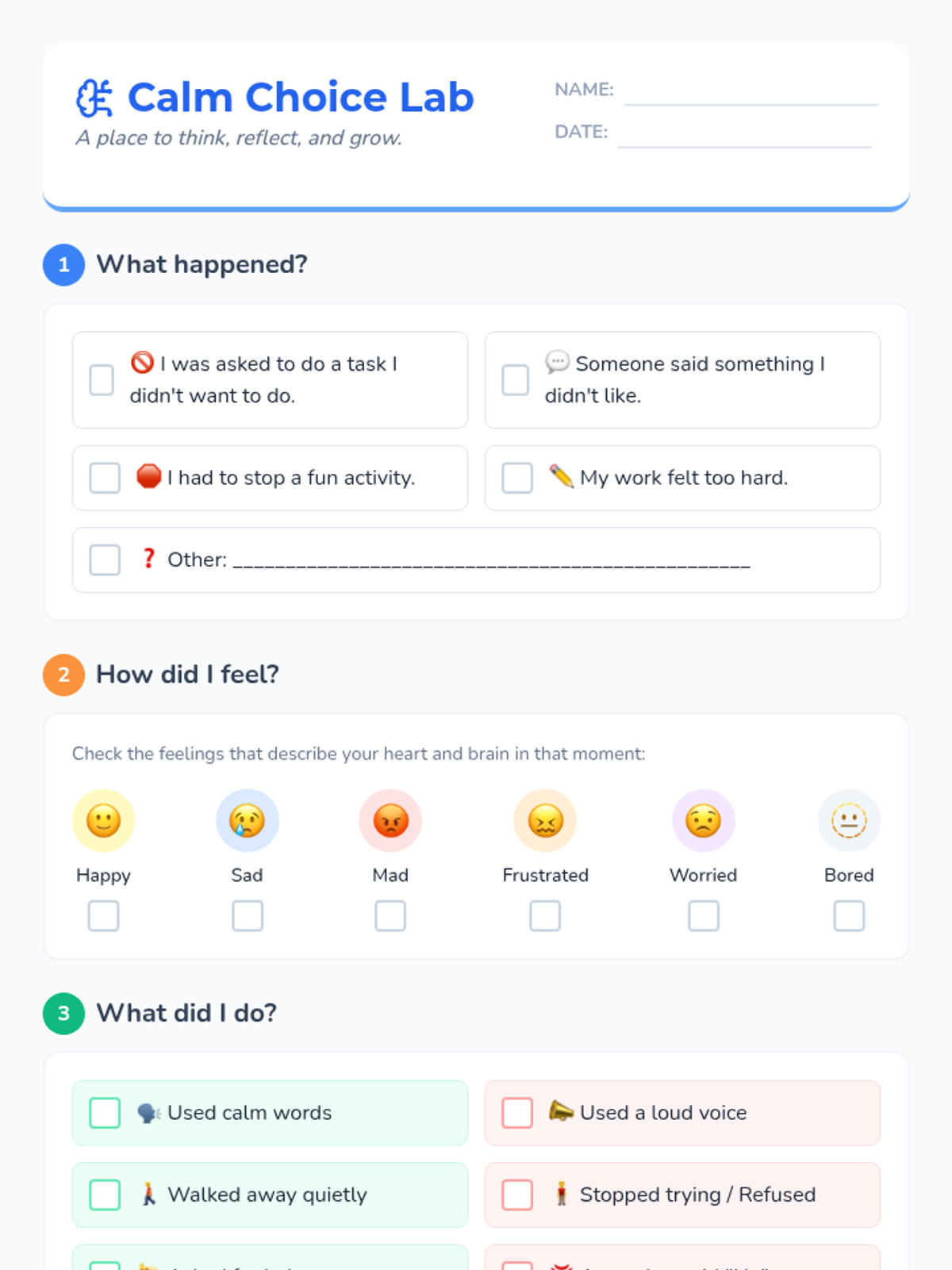 A lesson focused on self-reflection and emotional regulation, helping students process their actions and plan for better choices in the future, especially when facing tasks they find difficult or undesirable.