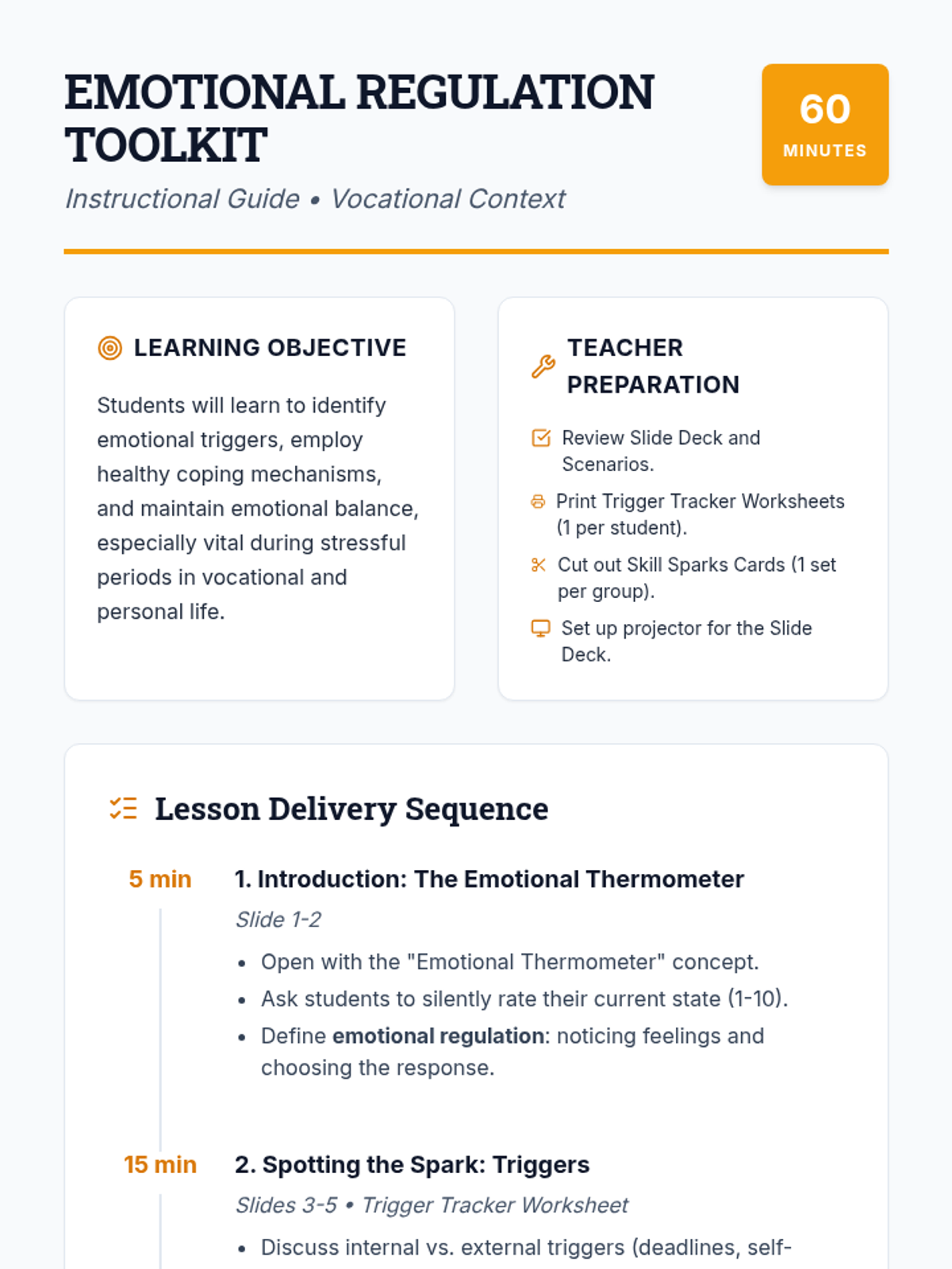 This lesson equips middle and high school students in vocational settings with practical strategies to identify emotional triggers and employ healthy coping mechanisms. Students will explore their own emotional patterns through interactive activities, scenario analysis, and a skill-building toolkit.