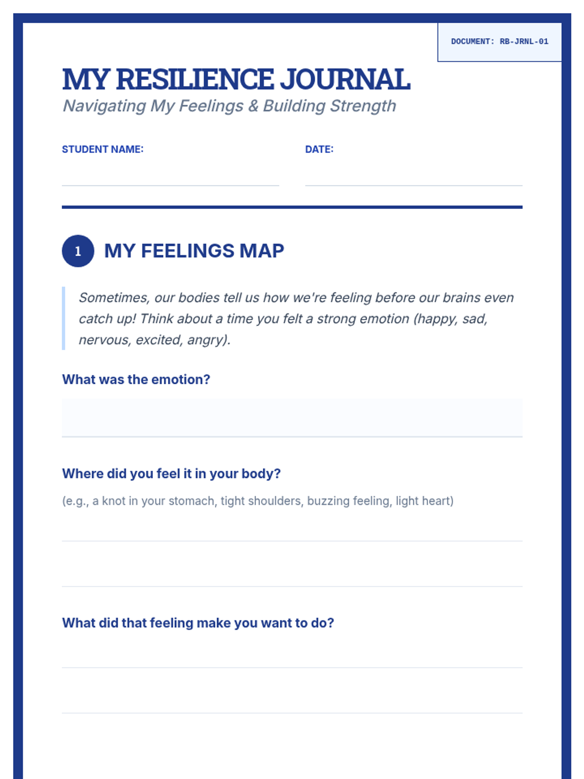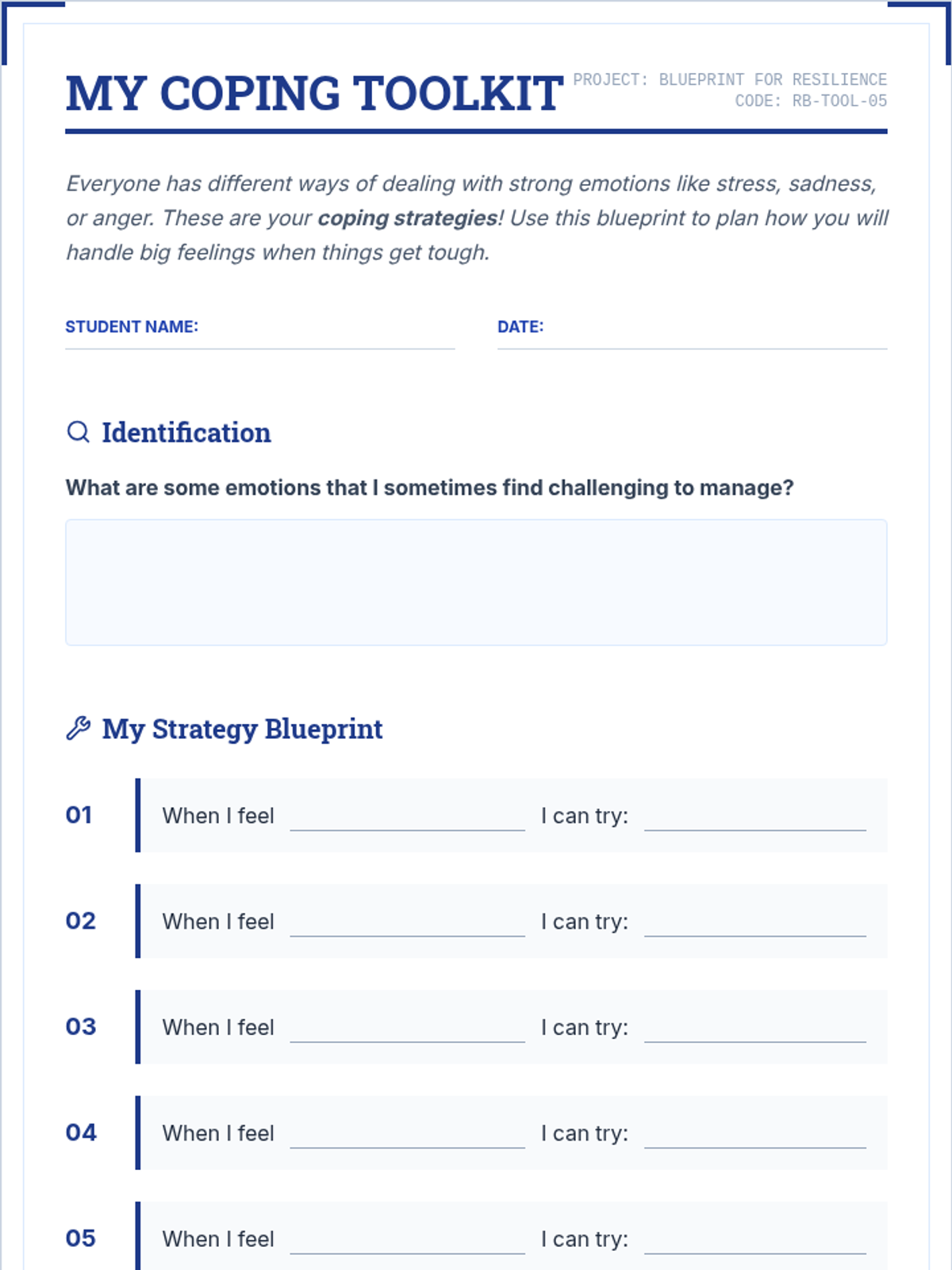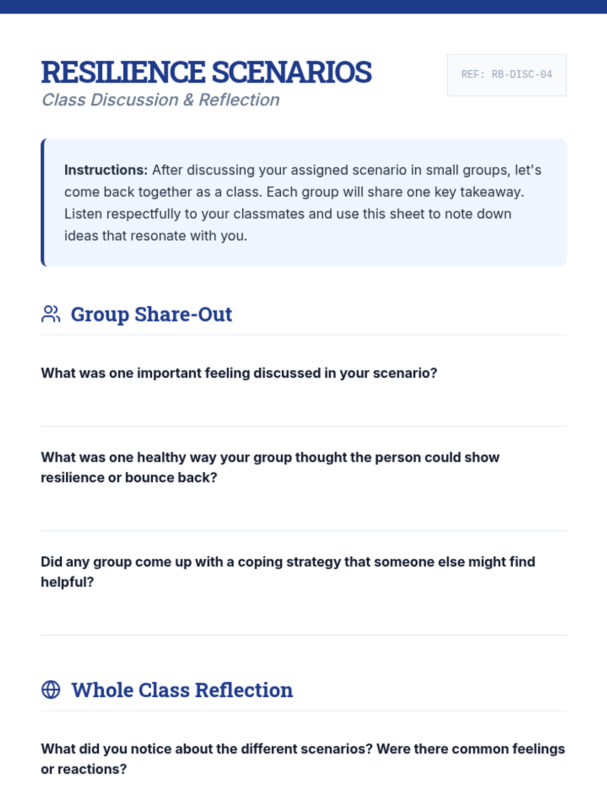 A comprehensive lesson for grades 4-8 that provides a 'blueprint' for building emotional resilience through reflection, scenario analysis, and personal coping strategy development.