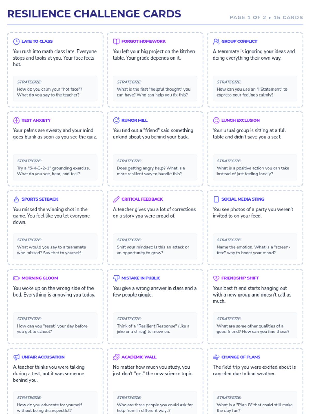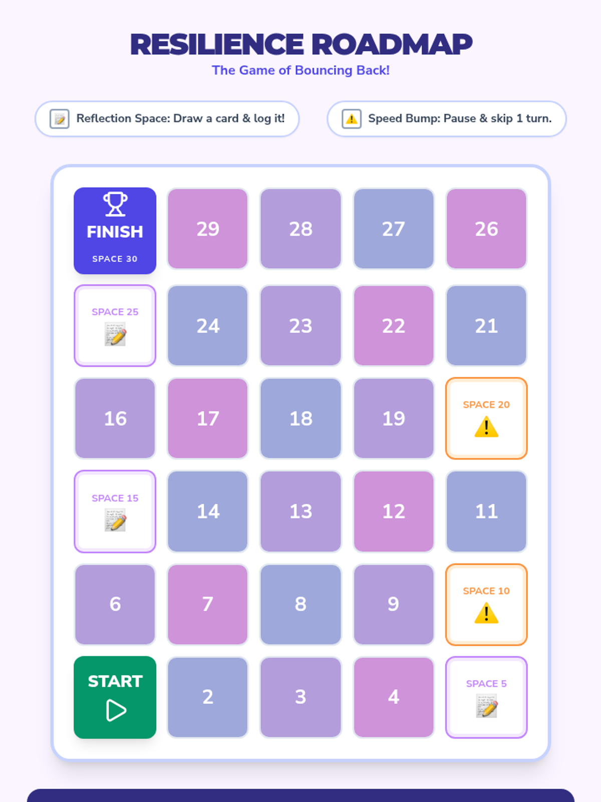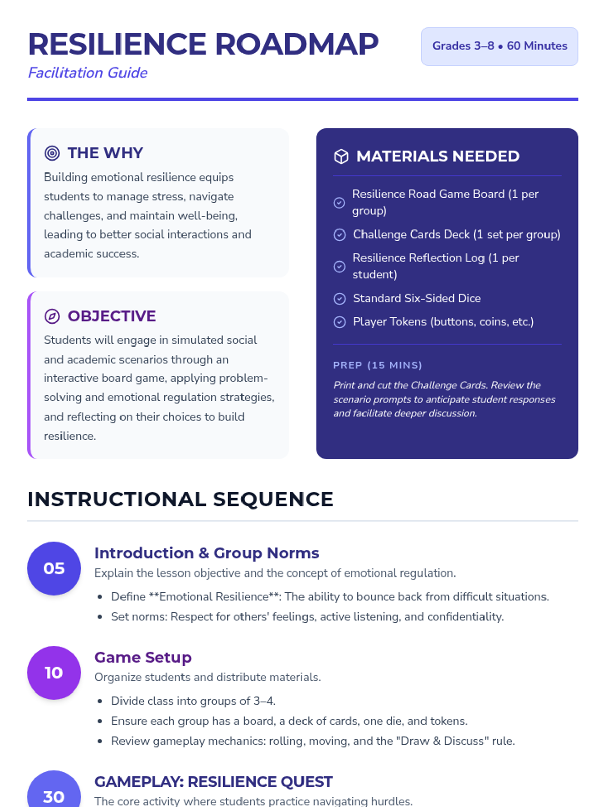 A fun, interactive lesson where students in grades 3–8 play a board game to practice navigating social and academic hurdles using emotional regulation and problem-solving strategies.
