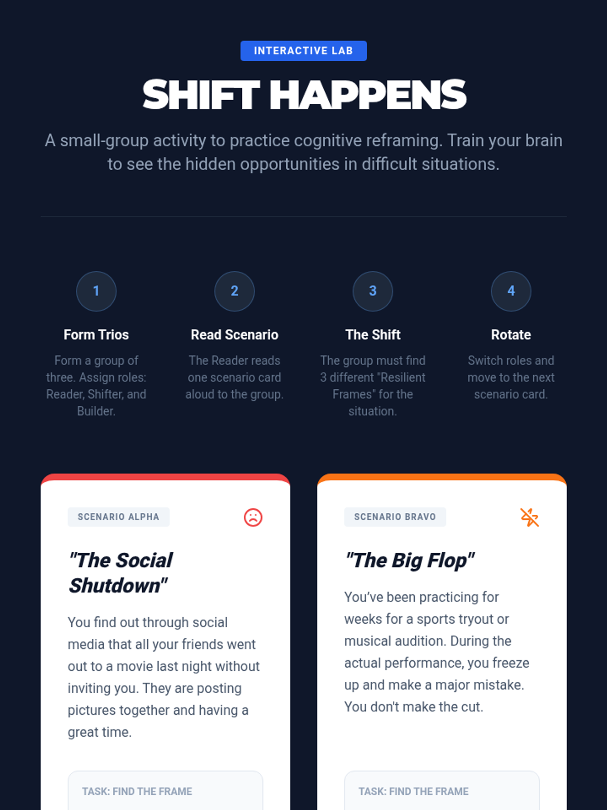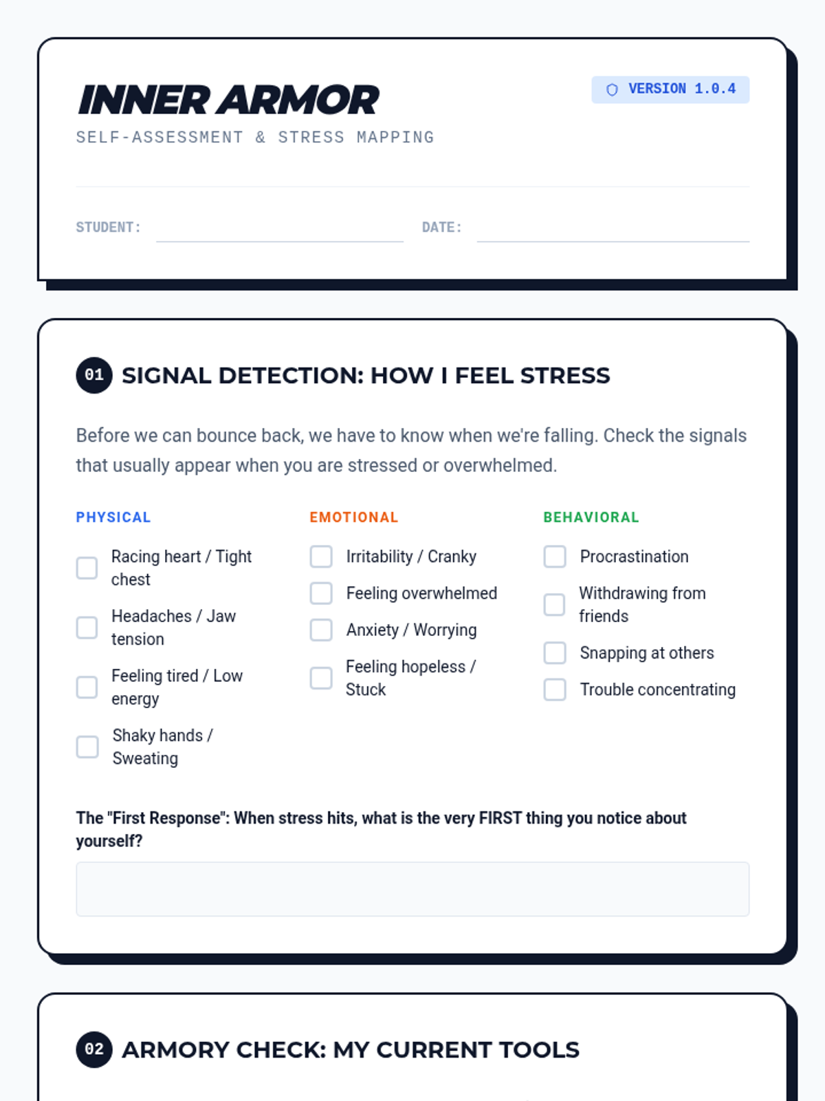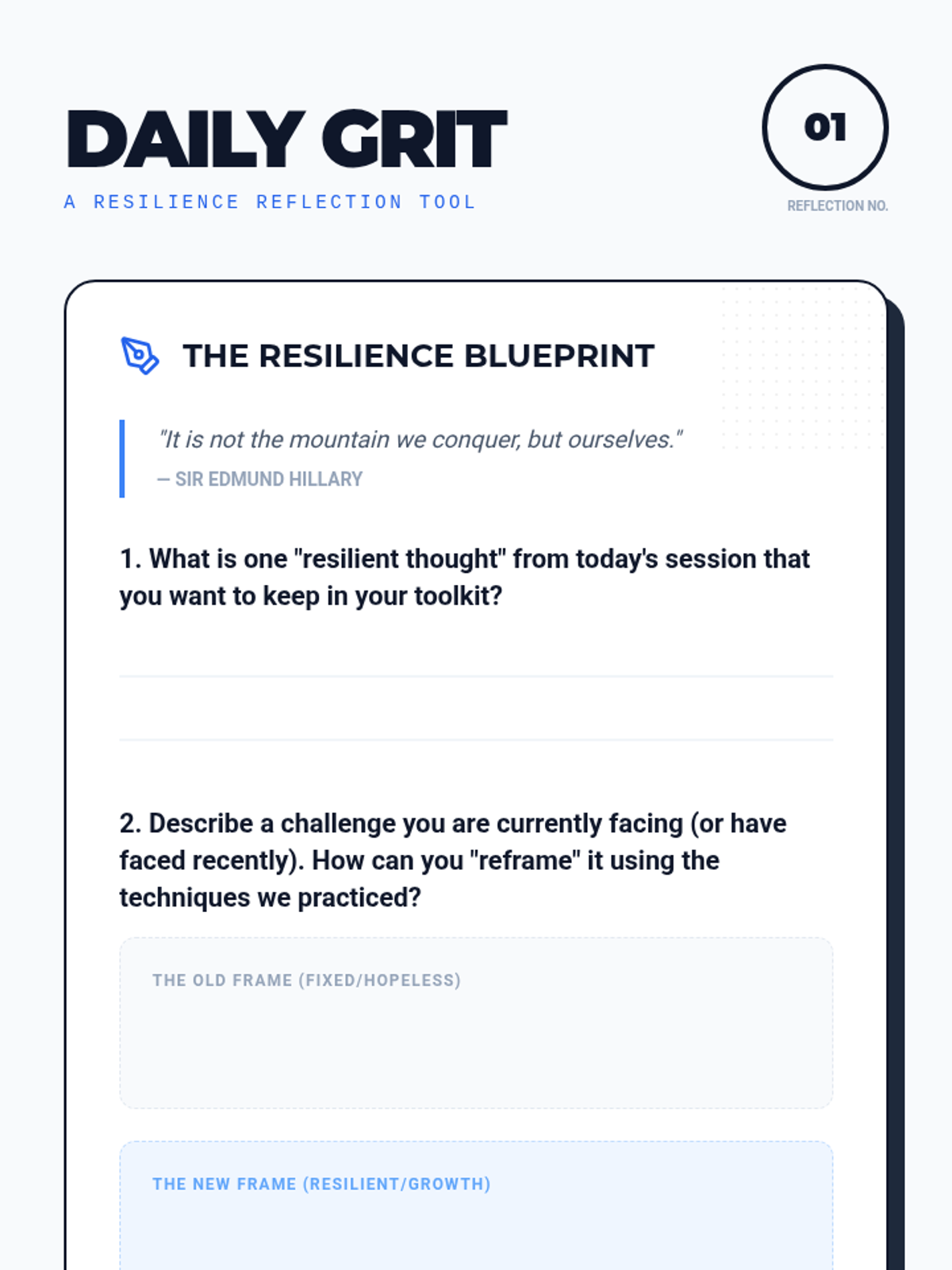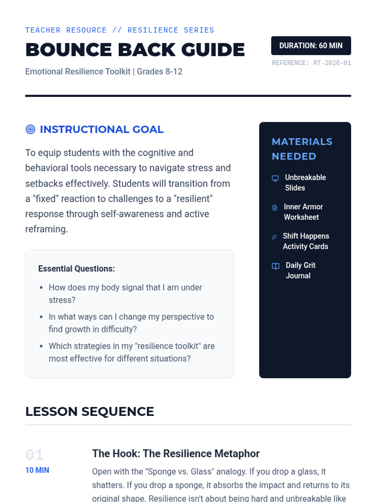 A comprehensive lesson for grades 8-12 on building emotional resilience, featuring self-assessment, cognitive reframing techniques, and personalized coping strategies through a 'blueprint' thematic lens.