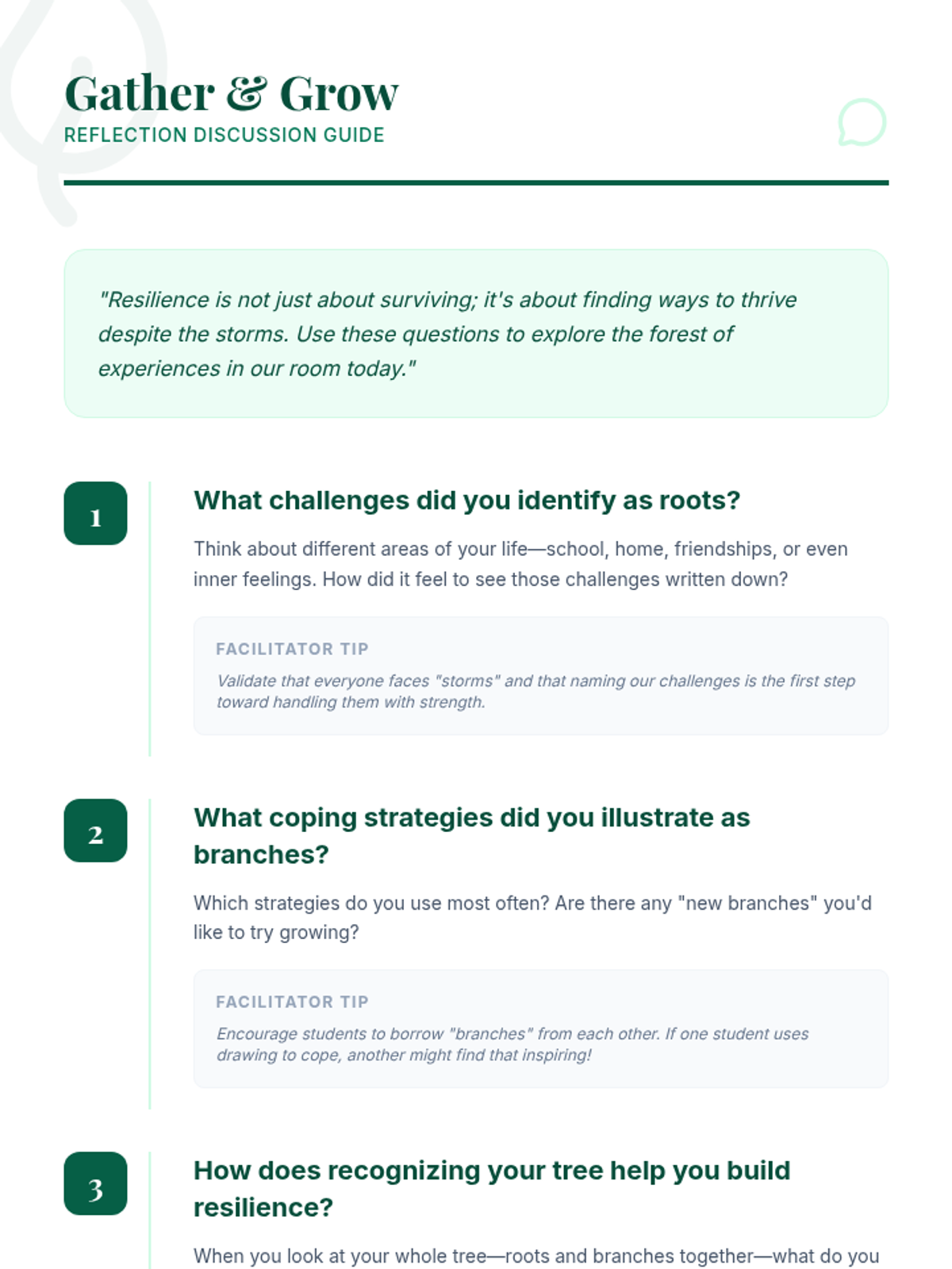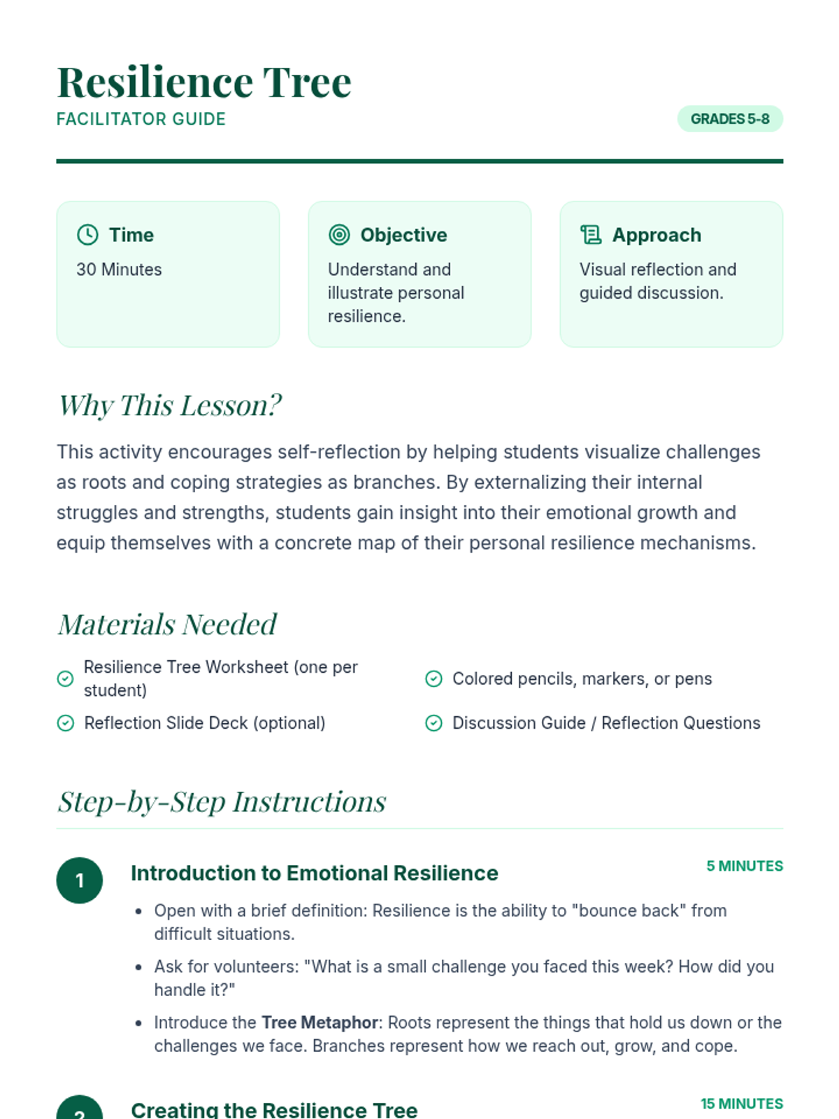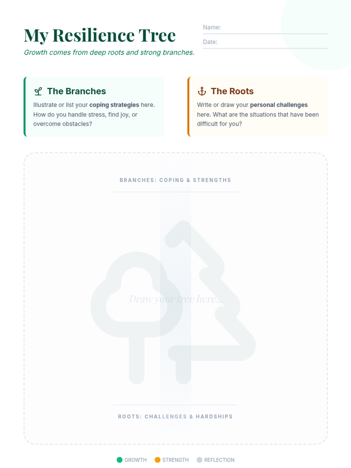 A lesson where students visualize their personal challenges as roots and coping strategies as branches of a tree to understand and build emotional resilience.