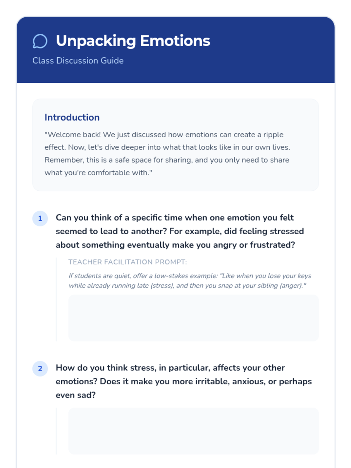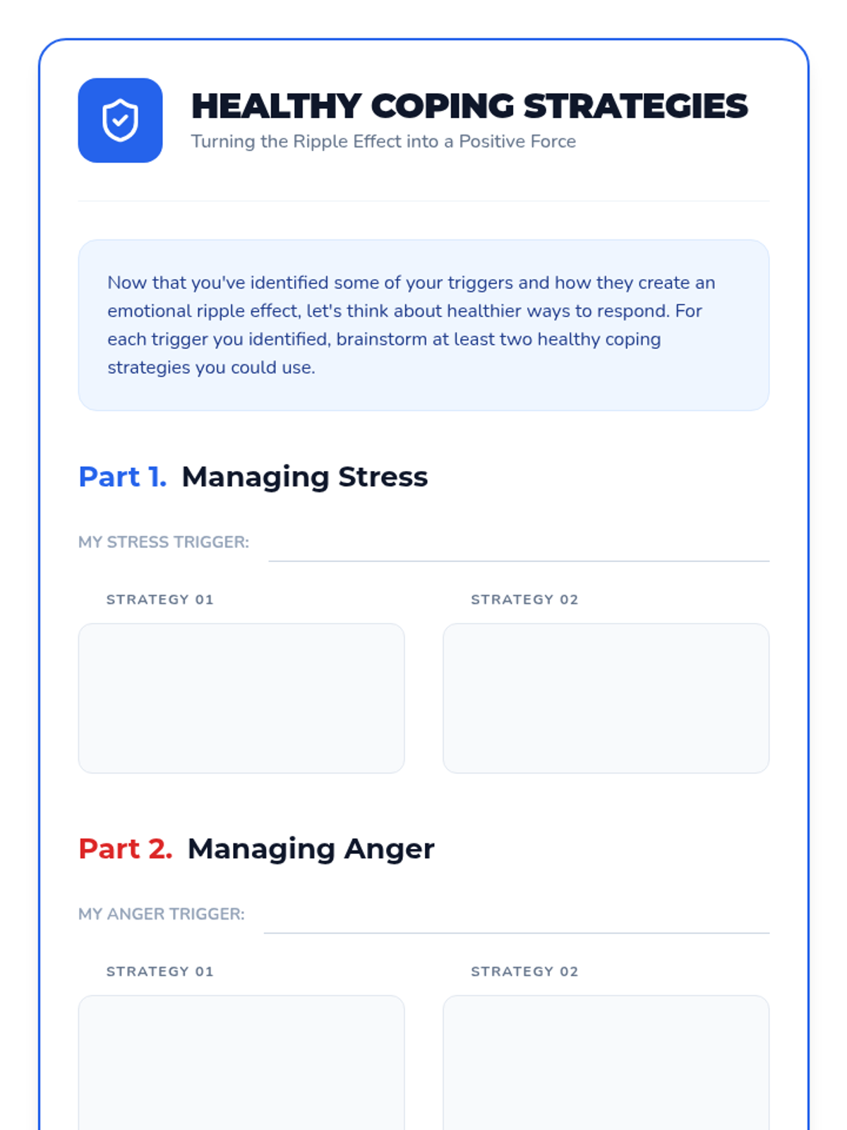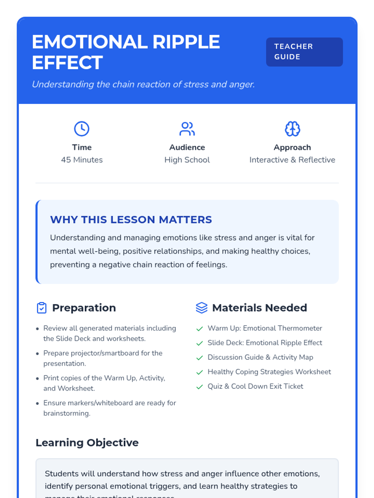 A single 45-minute session for high schoolers exploring how stress and anger trigger other emotions and how to manage these 'ripples' with healthy coping strategies.