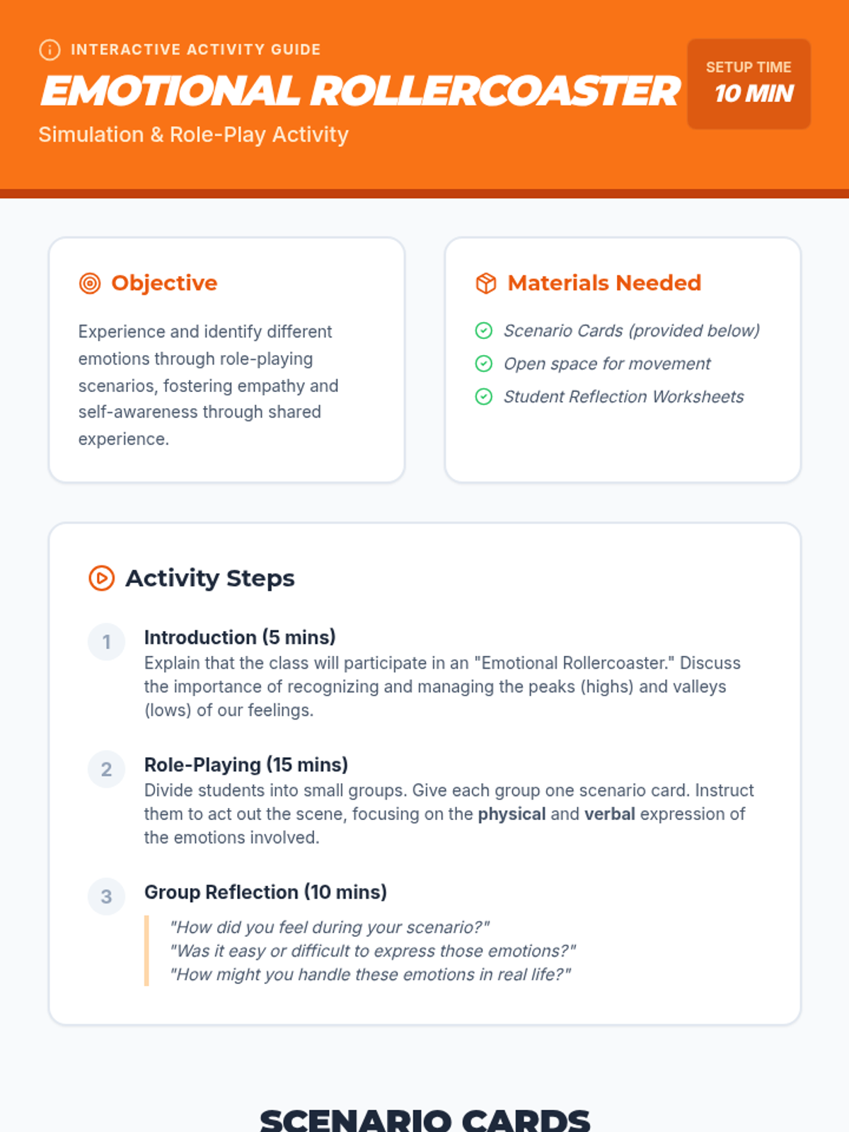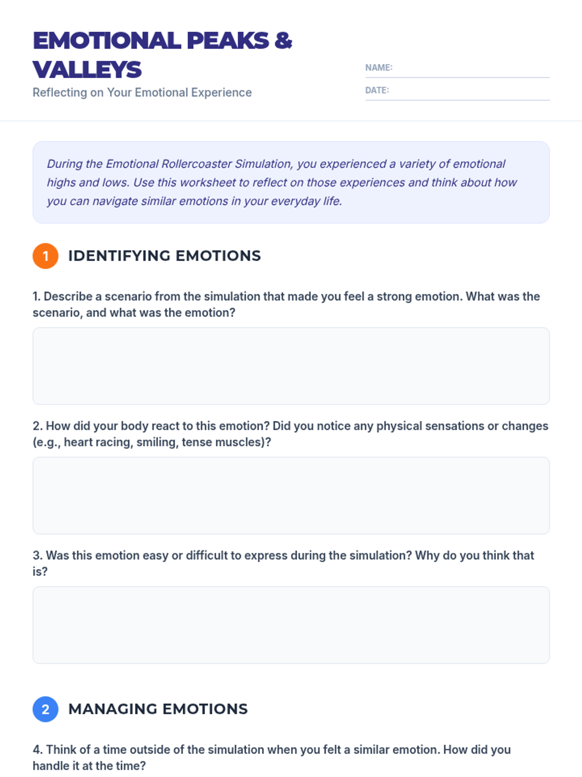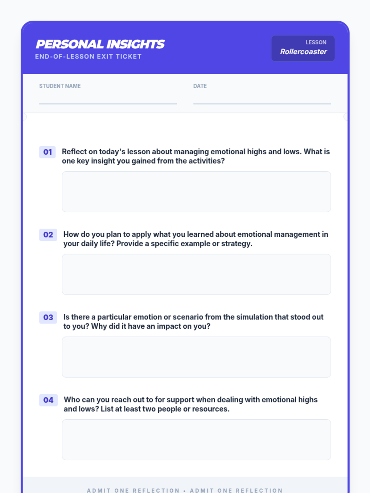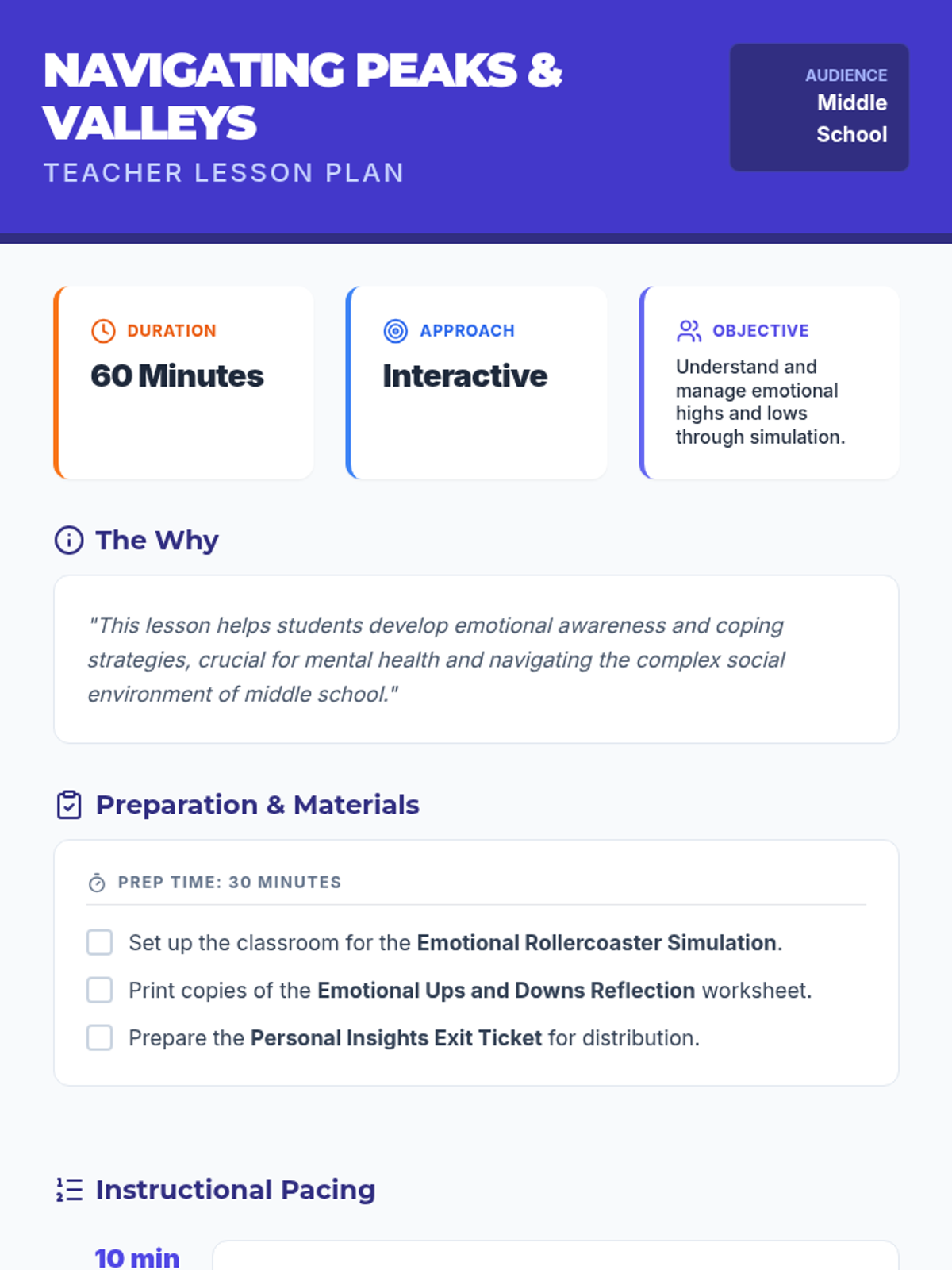 An interactive middle school lesson exploring emotional highs and lows through a simulation activity, individual reflection, and peer discussion.