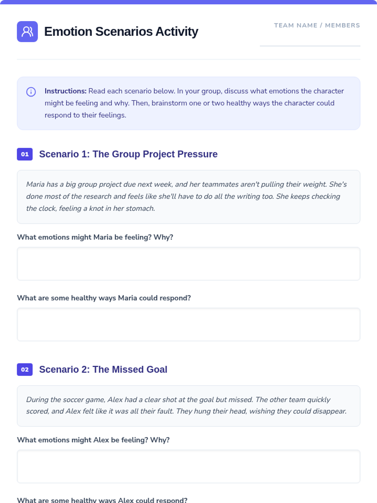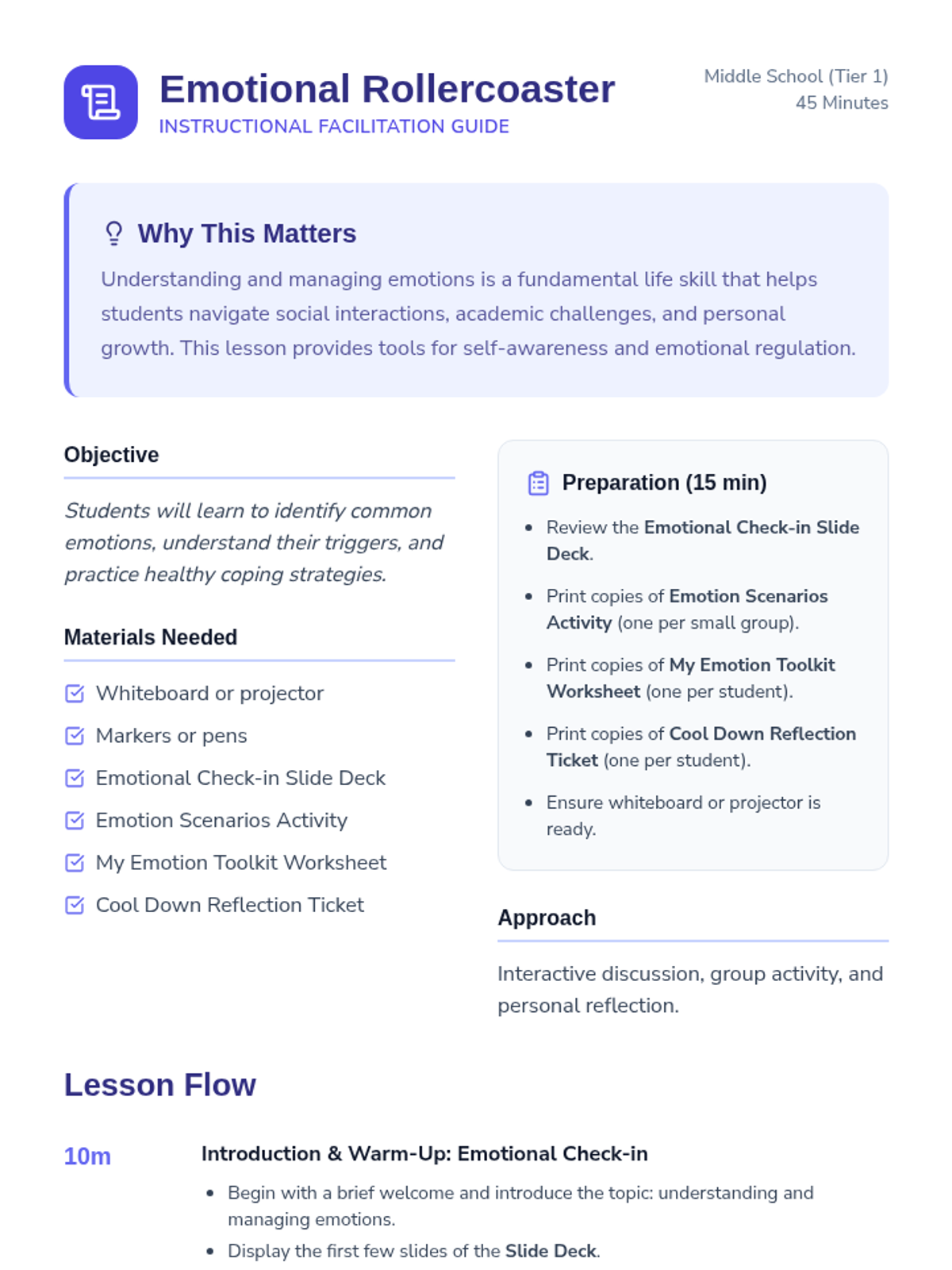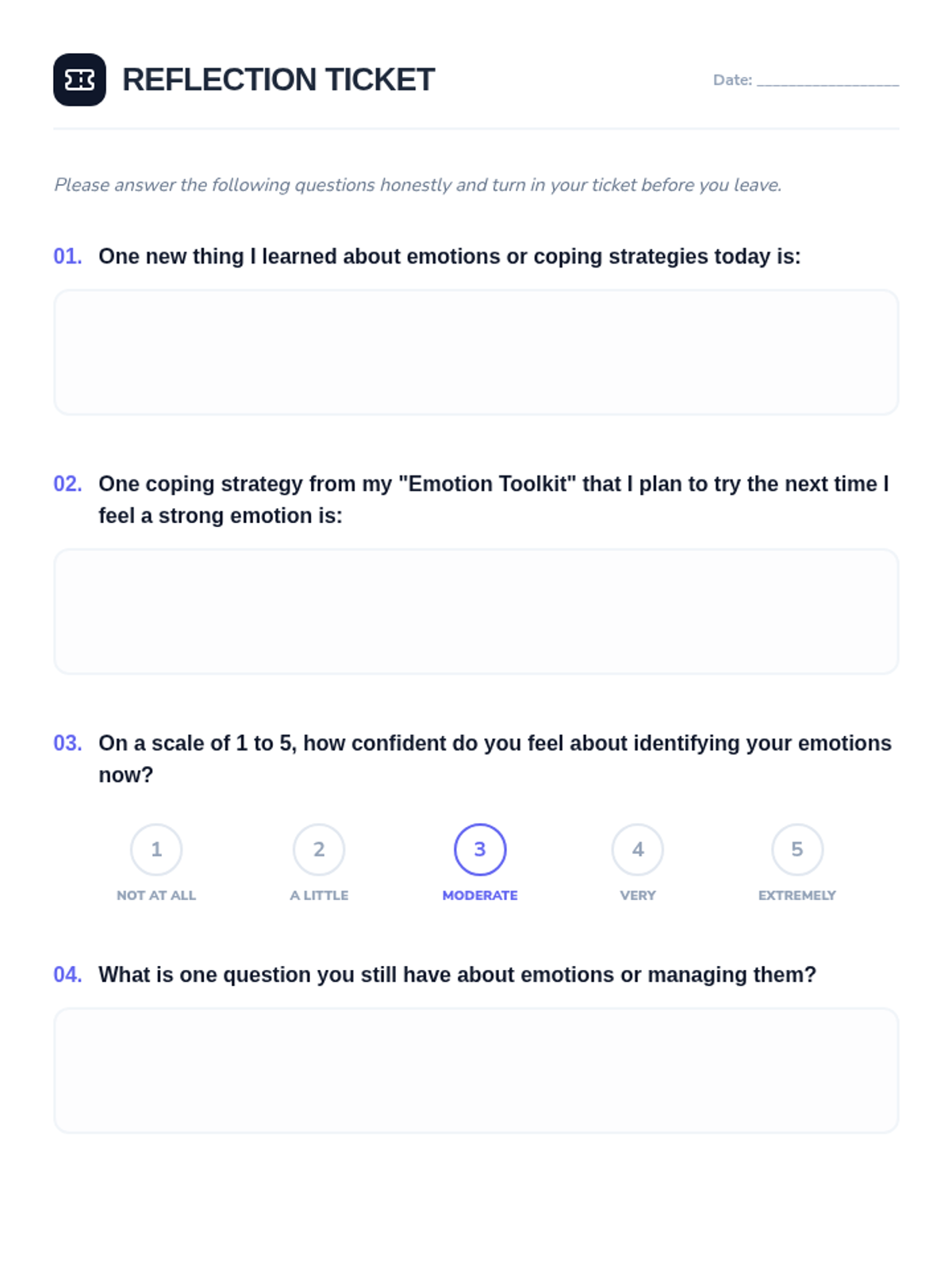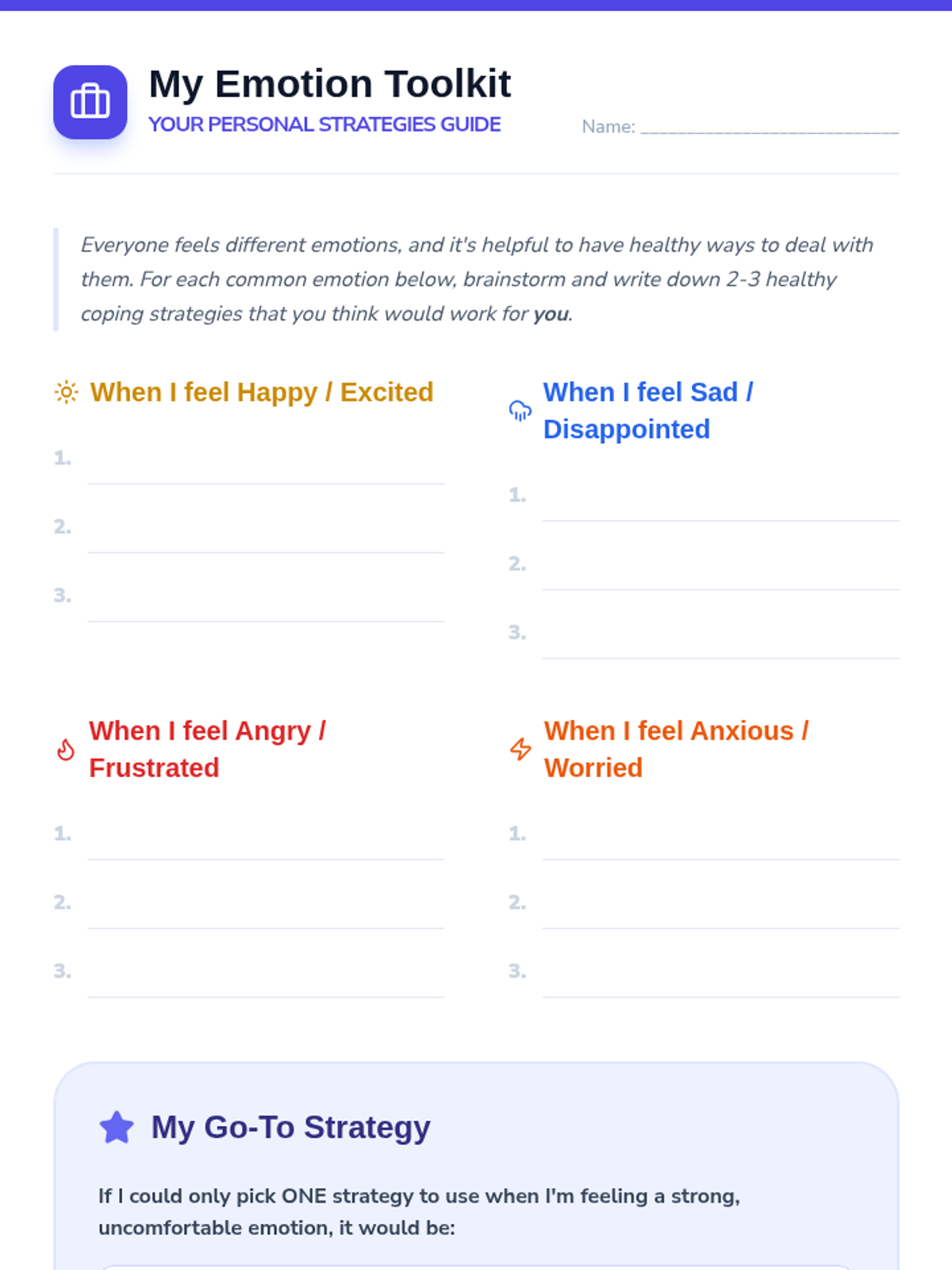 This lesson helps students understand the range of human emotions, identify personal triggers, and develop a personalized toolkit of healthy coping strategies.