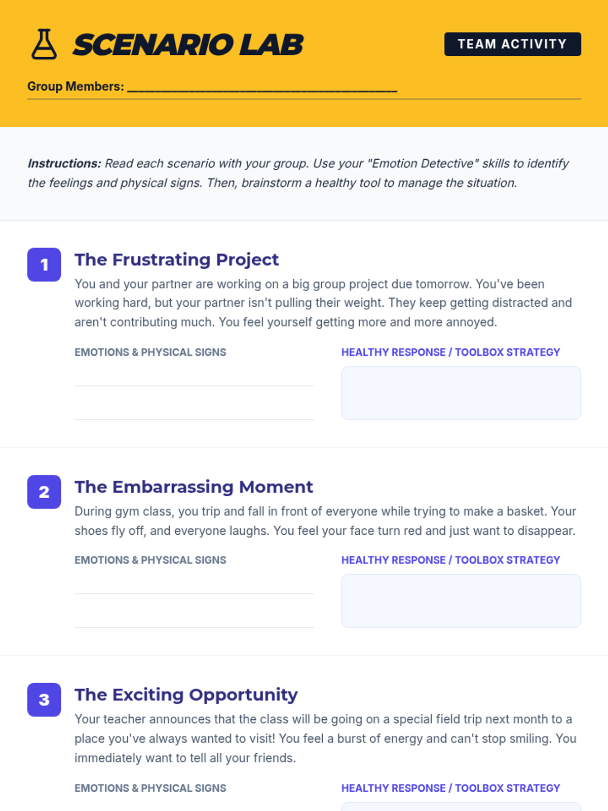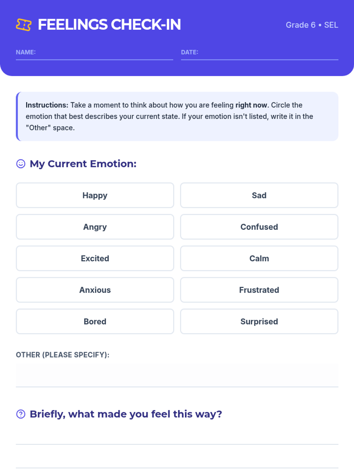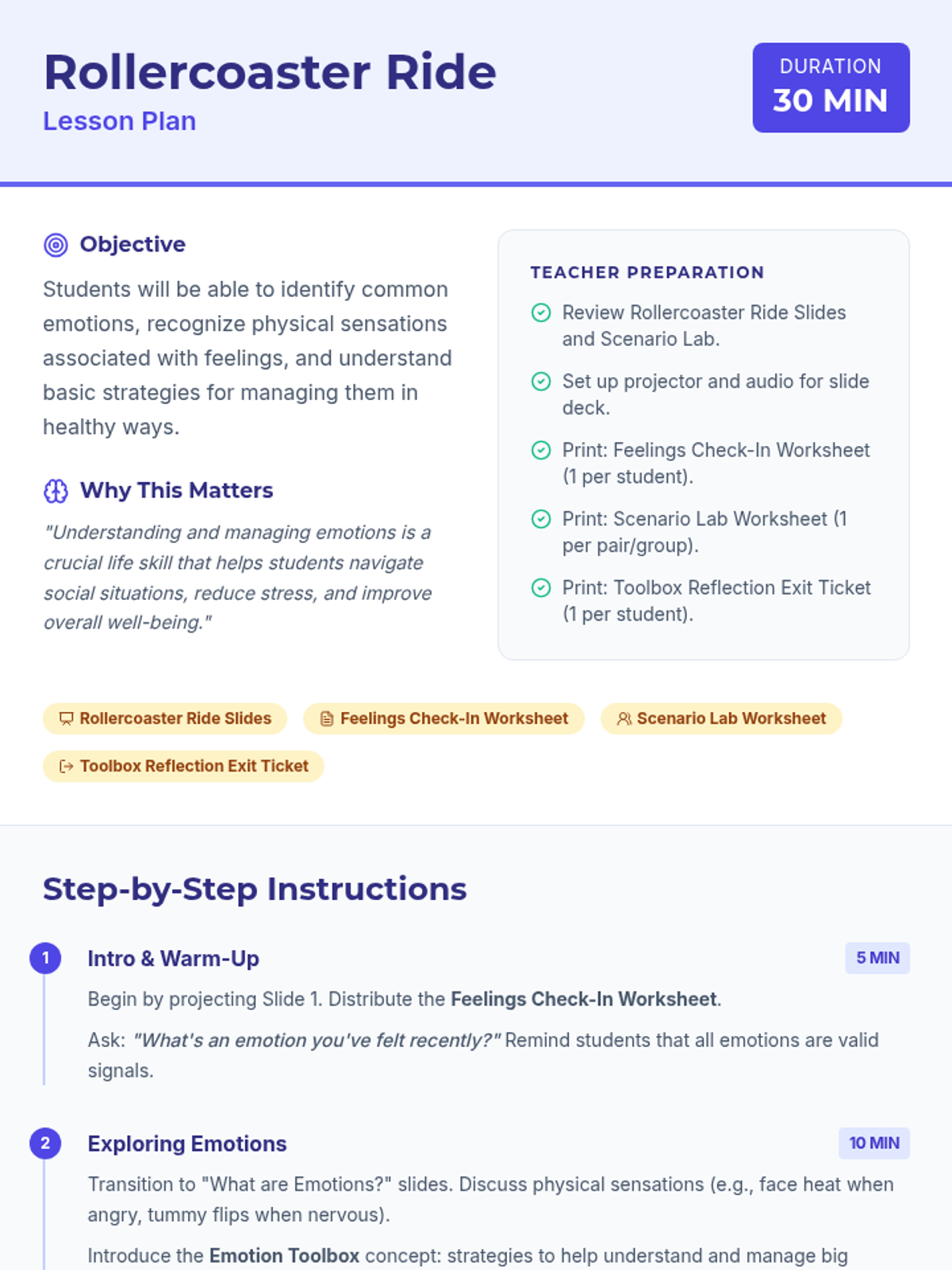 A 30-minute lesson for 6th graders to identify common emotions, understand physical sensations of feelings, and build a 'toolbox' of regulation strategies.