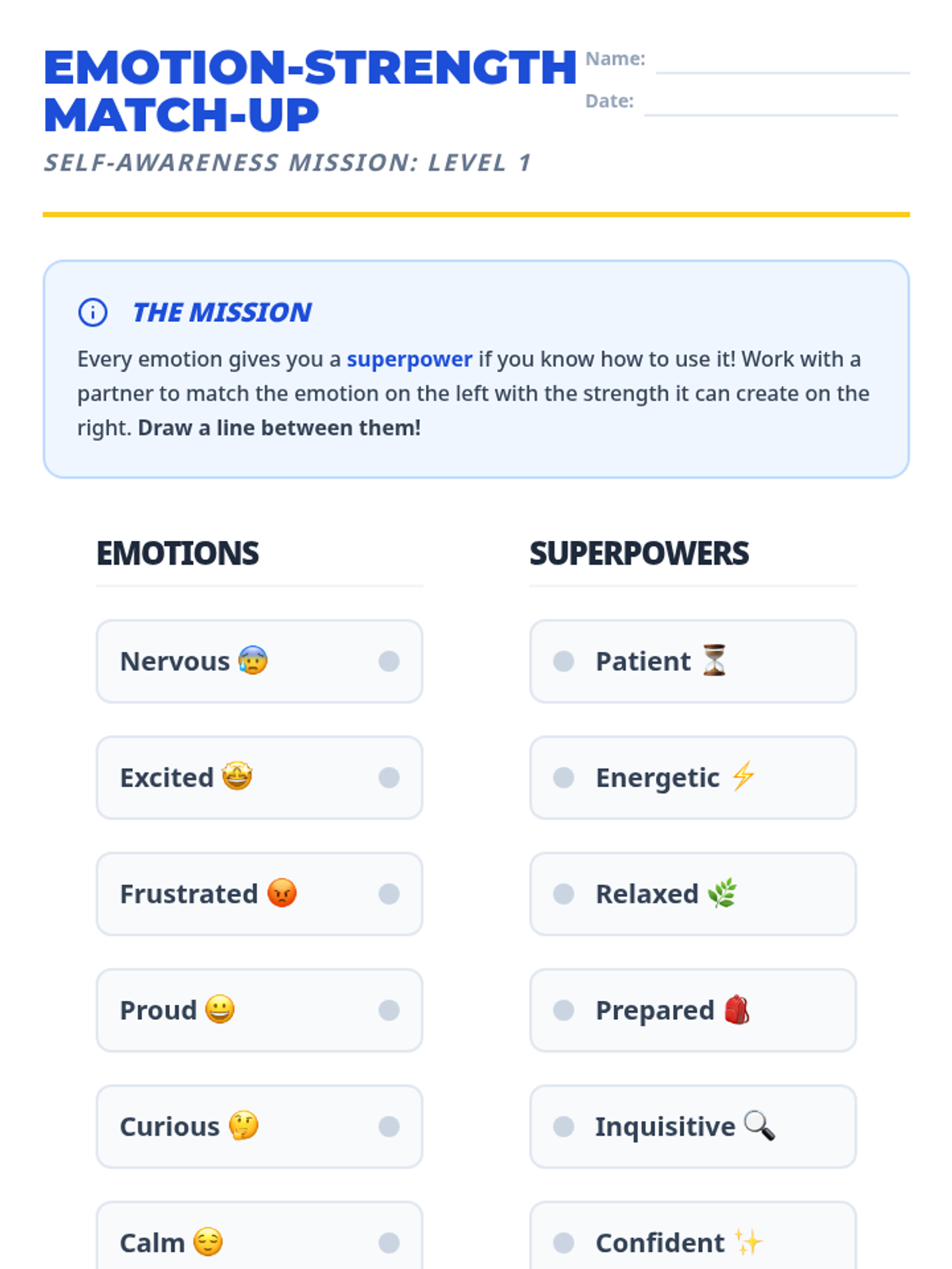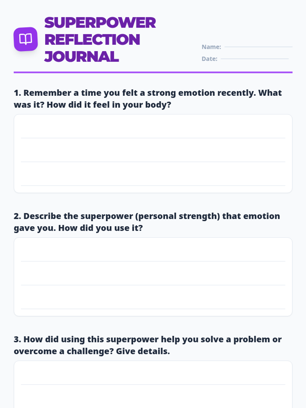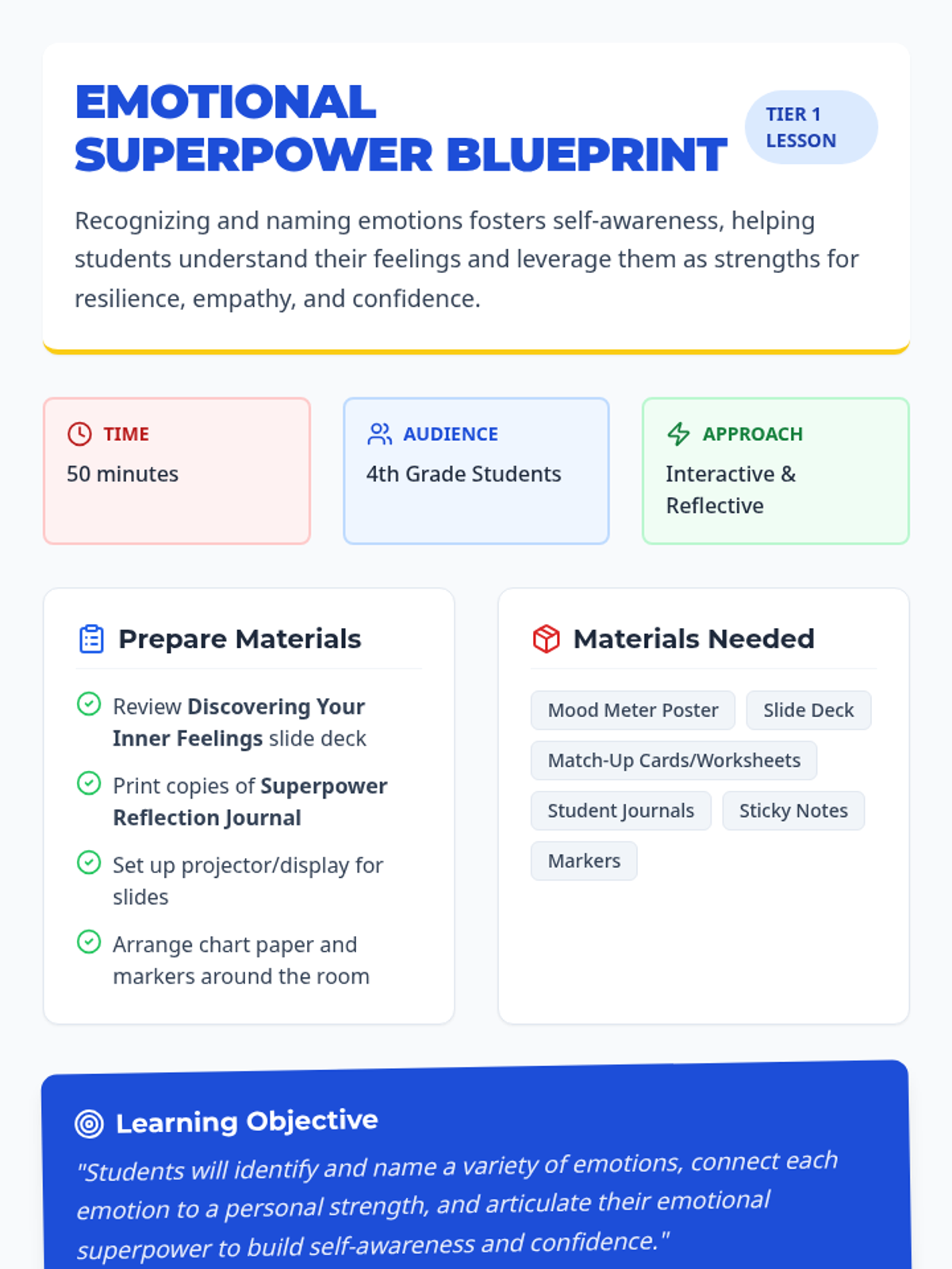 A 50-minute Tier 1 SEL lesson for 4th graders that teaches students to recognize emotions as personal strengths or 'superpowers' to build self-awareness and confidence.