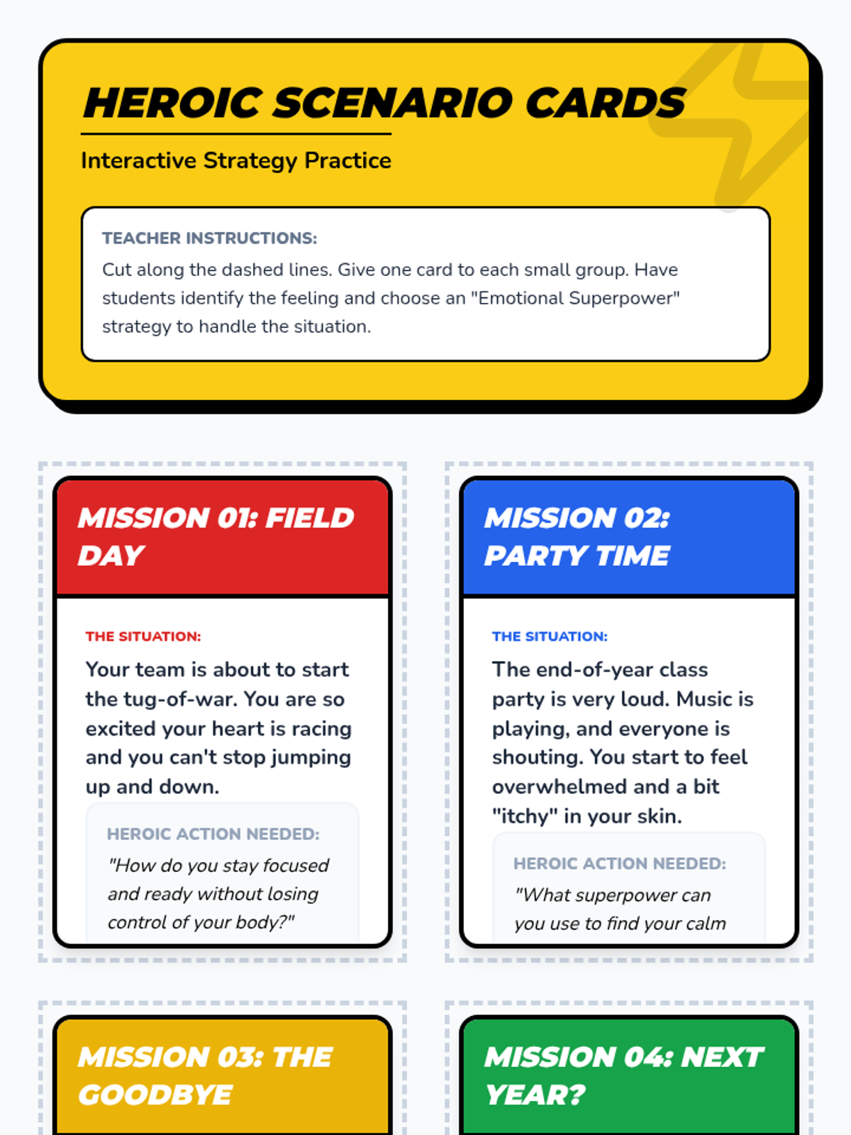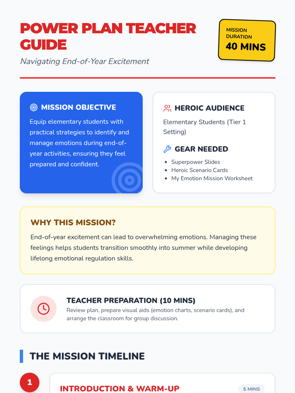 A 40-minute Tier 1 lesson designed to help elementary students manage the high emotions of the end-of-year season using 'emotional superpower' strategies.