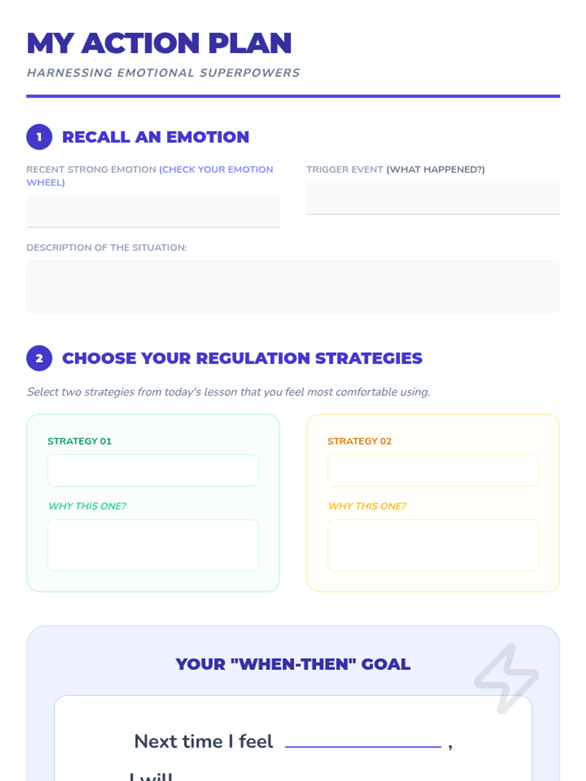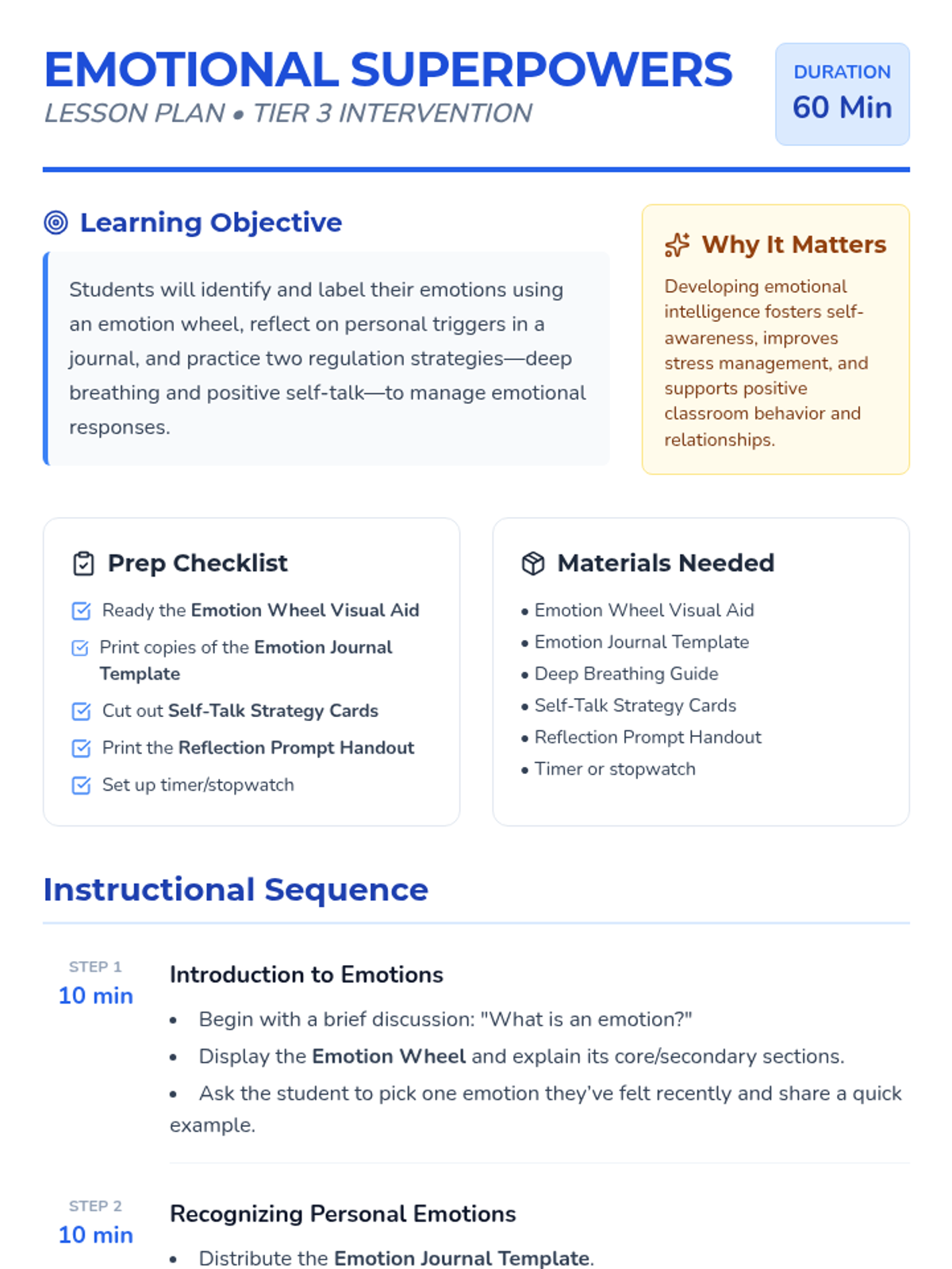 In this targeted one-on-one session, 7th-grade students develop self-awareness and regulation skills by identifying emotional triggers, practicing deep breathing, and utilizing positive self-talk strategies.