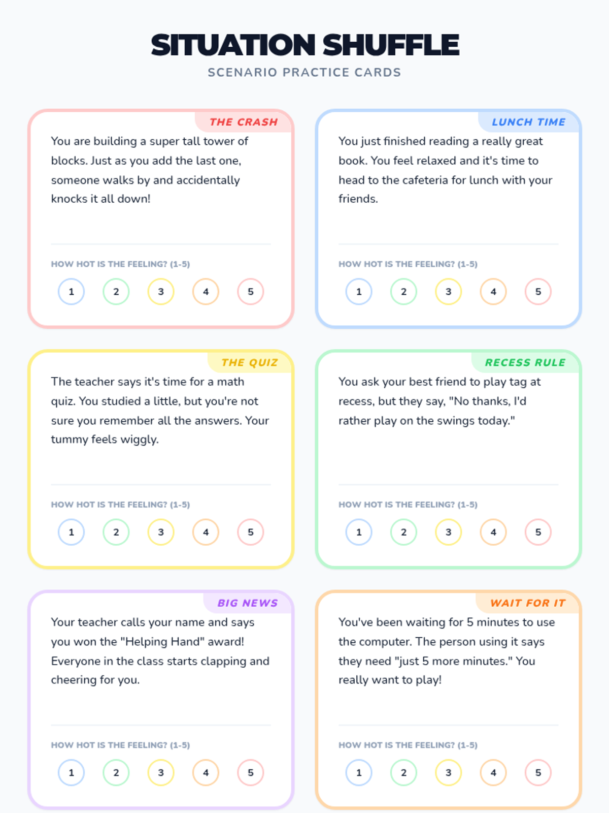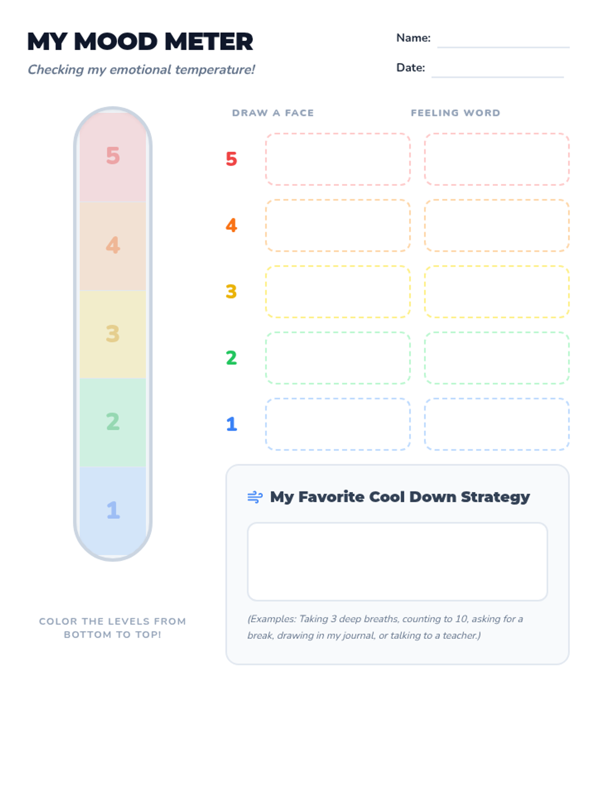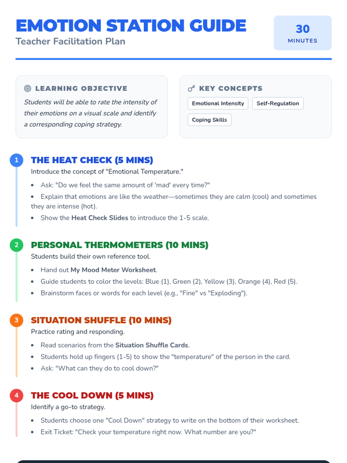 A 30-minute social-emotional learning lesson where students learn to identify and rate the intensity of their emotions using a 'Feelings Thermometer' and match them with appropriate coping strategies.
