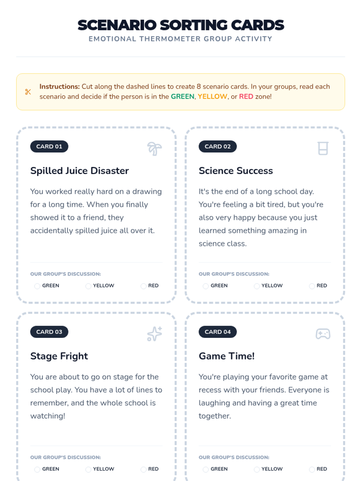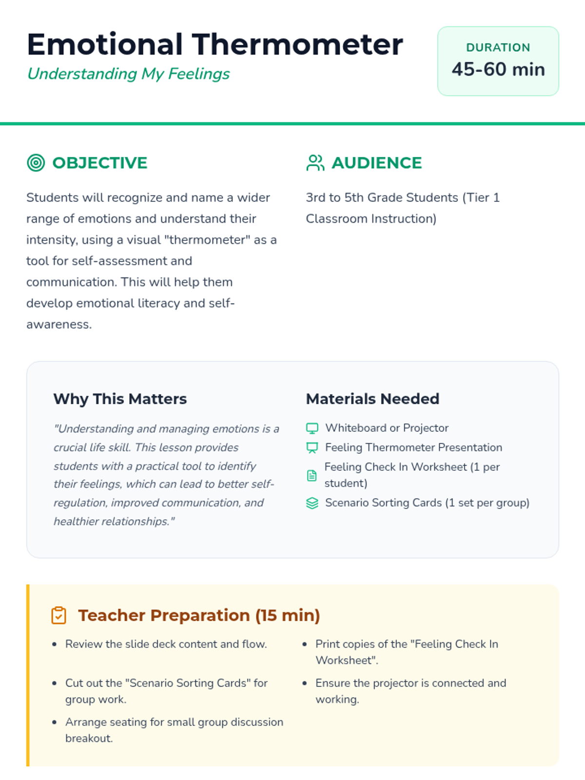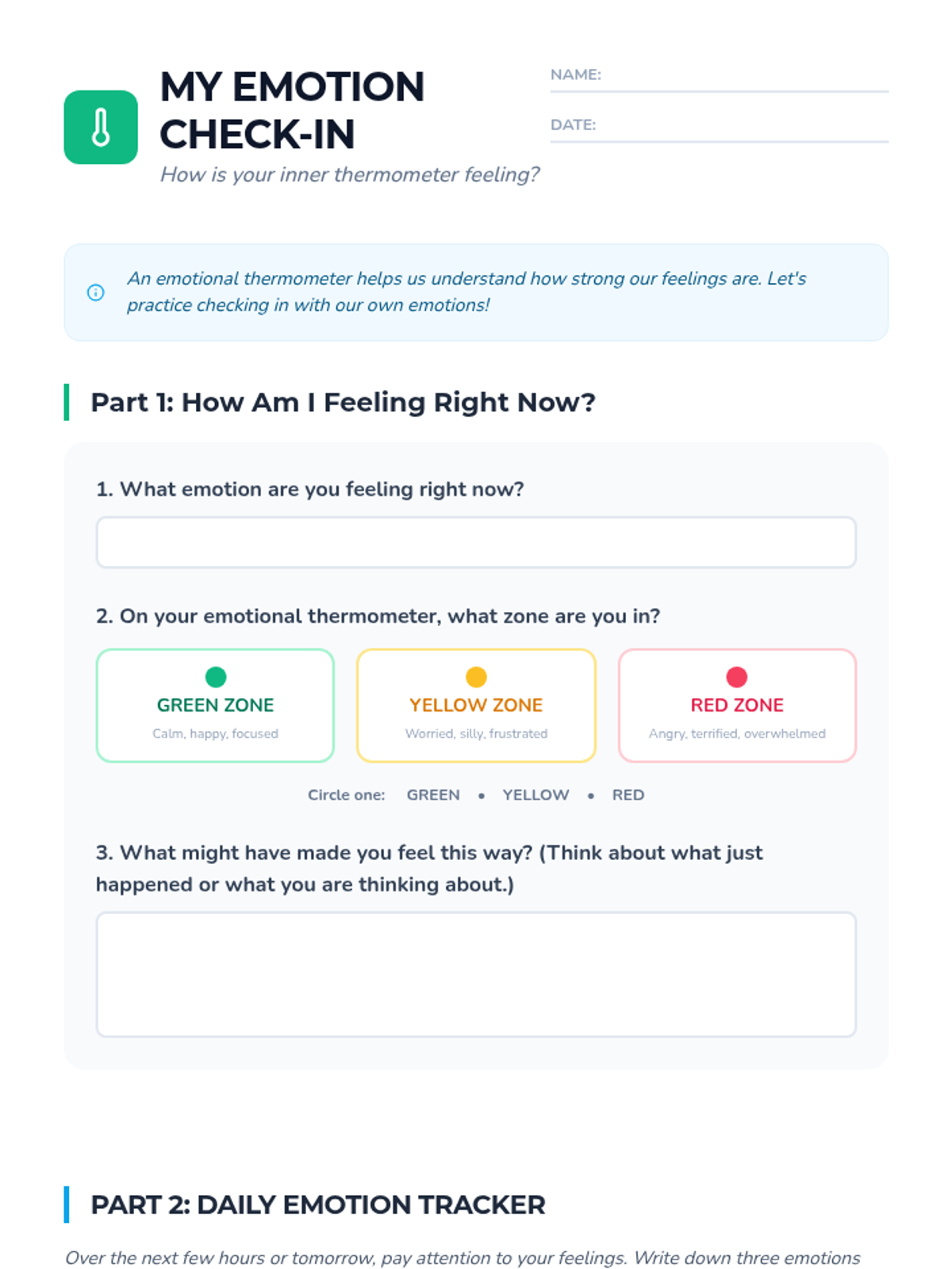 A comprehensive Social-Emotional Learning lesson for 3rd-5th graders to identify, name, and gauge the intensity of their emotions using a visual thermometer metaphor. Students learn to categorize feelings into Green, Yellow, and Red zones to improve self-awareness and regulation.