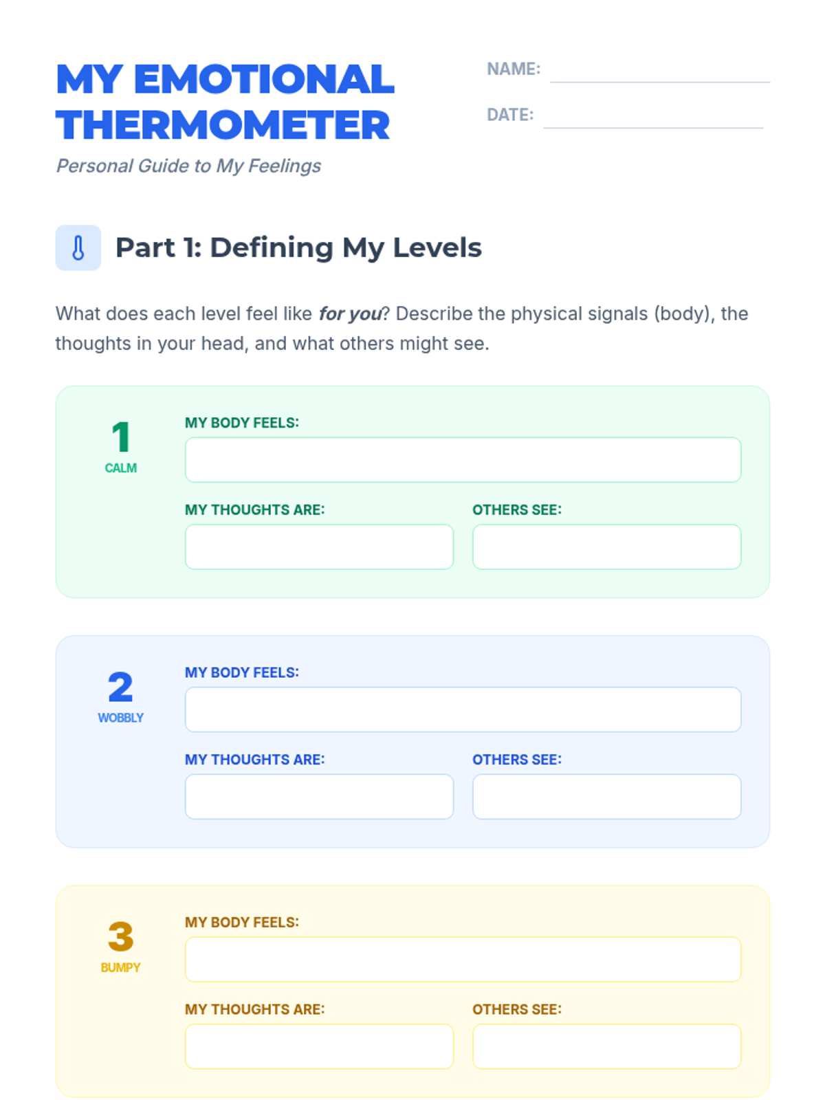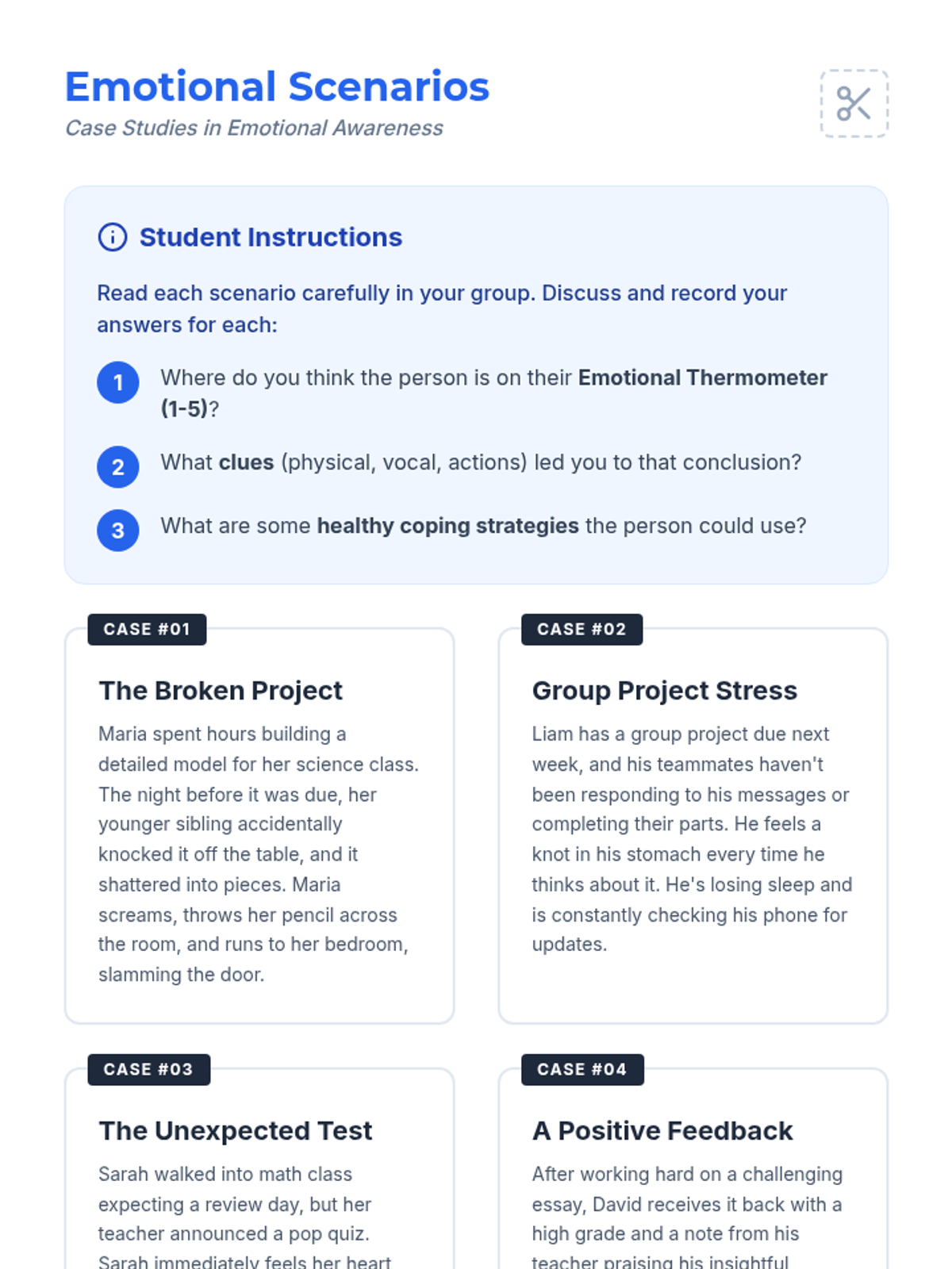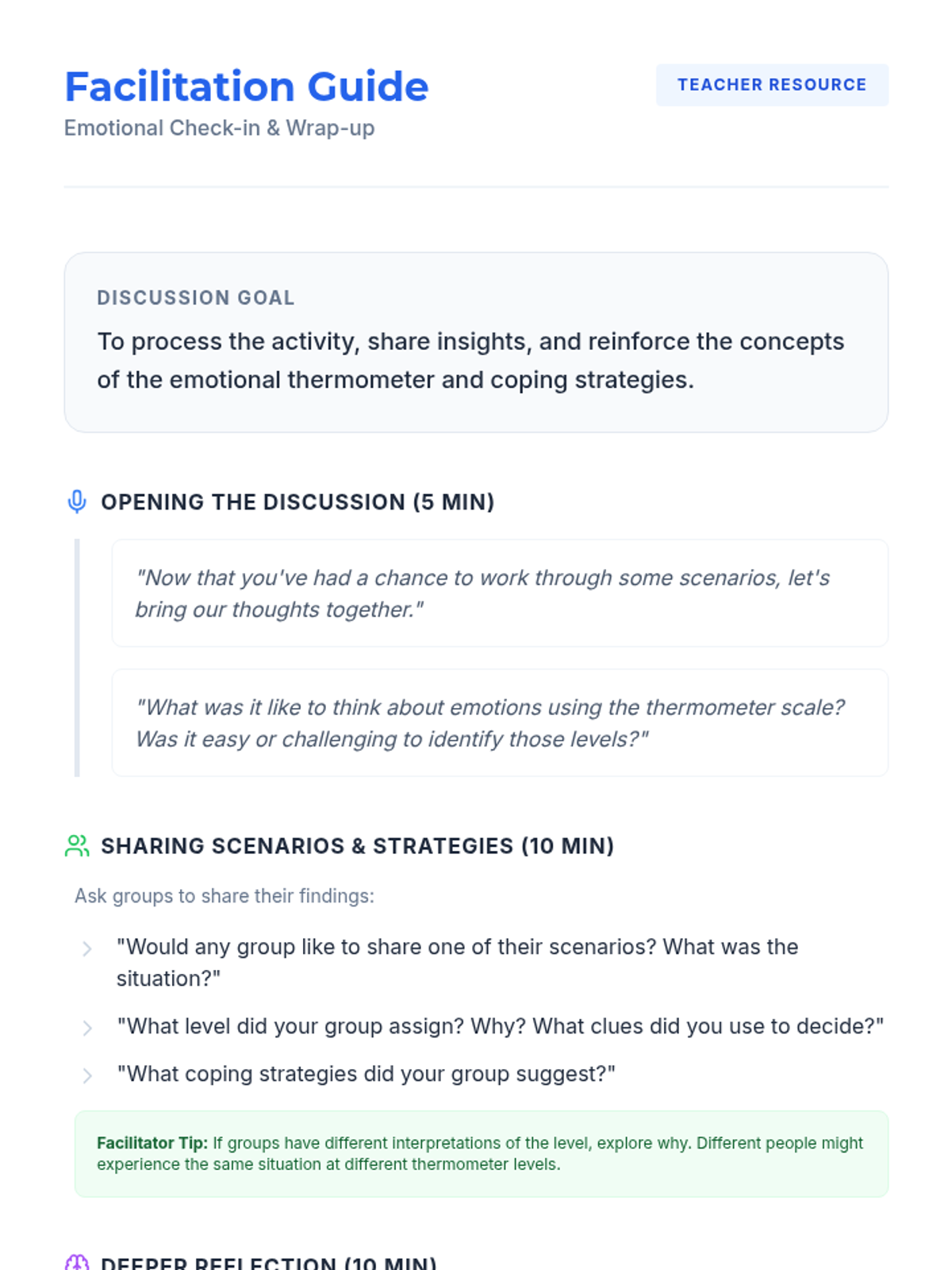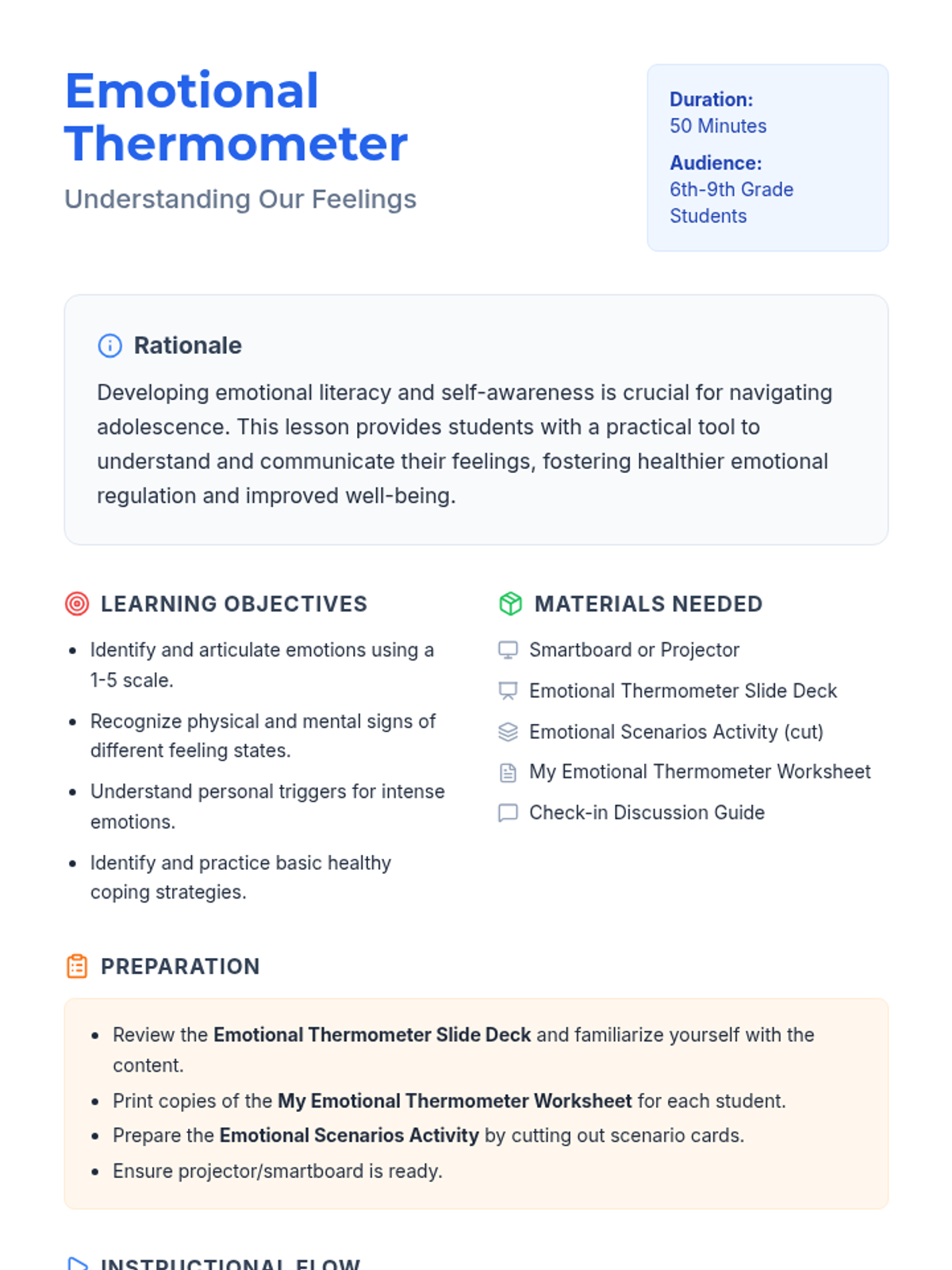 A comprehensive lesson for 6th-9th grade students to develop emotional literacy using the 'Emotional Thermometer' framework. Students will identify feeling states, recognize triggers, and practice coping strategies.