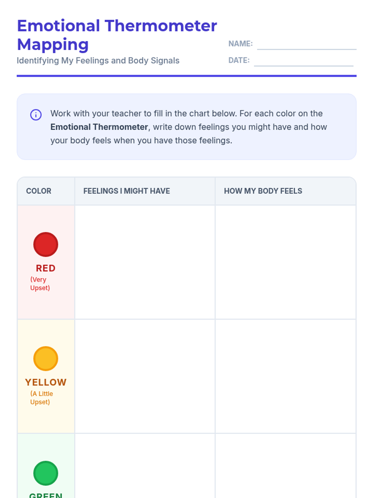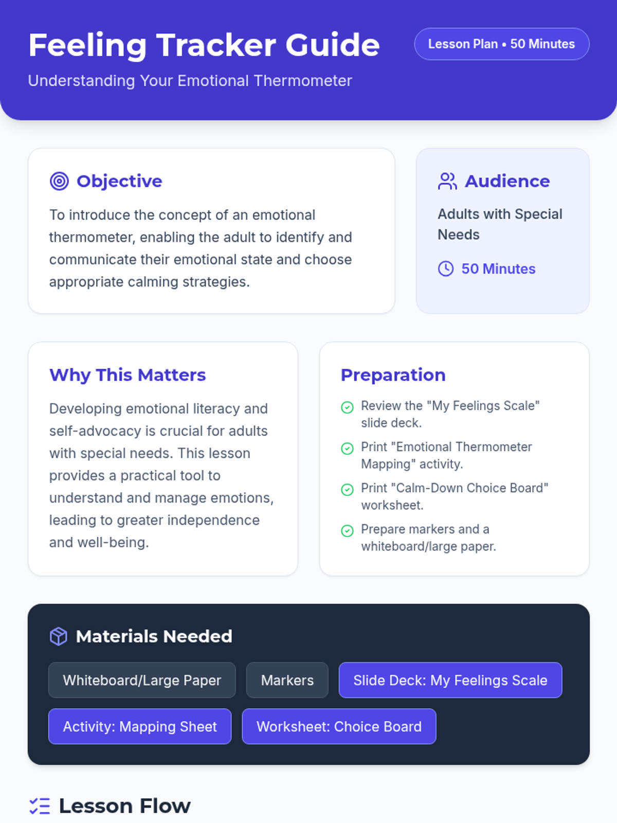 A comprehensive session for adults with special needs focused on identifying emotional states using an emotional thermometer and selecting personalized calming strategies.
