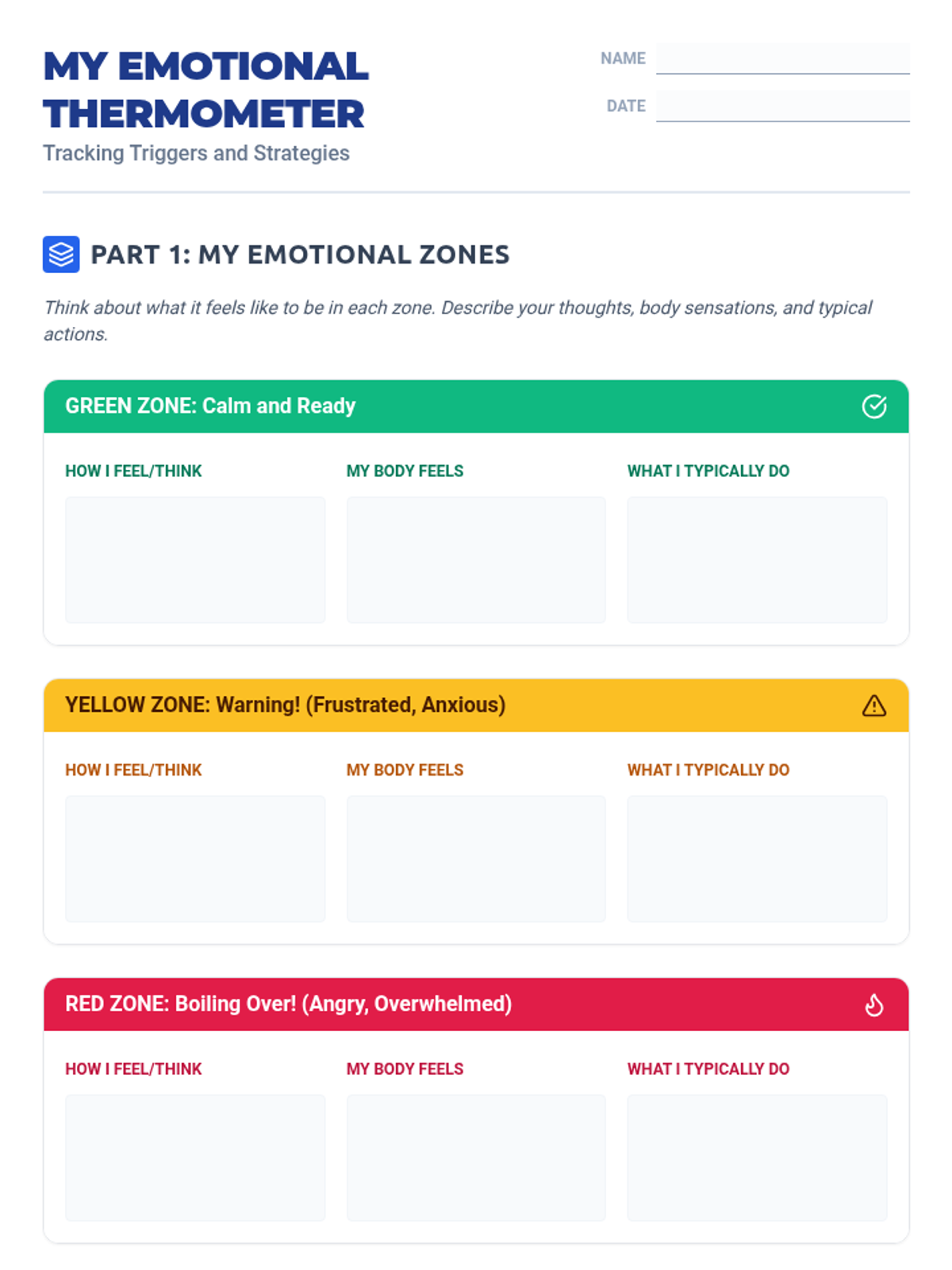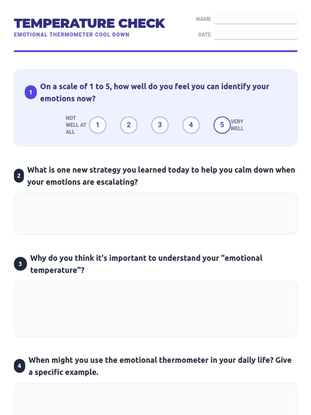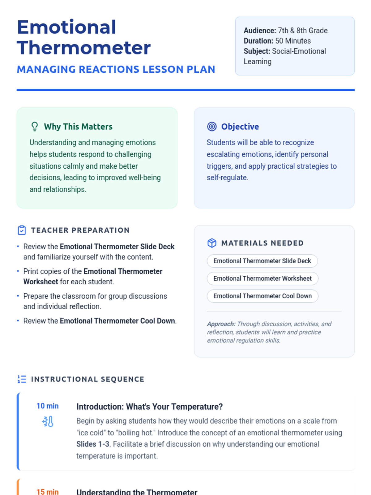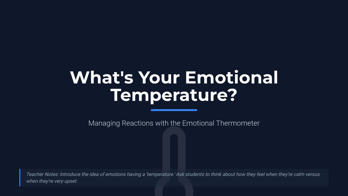 A comprehensive 50-minute lesson for 7th and 8th graders on emotional regulation using the thermometer metaphor. Students identify triggers and practice self-regulation strategies to manage escalating emotions effectively.
