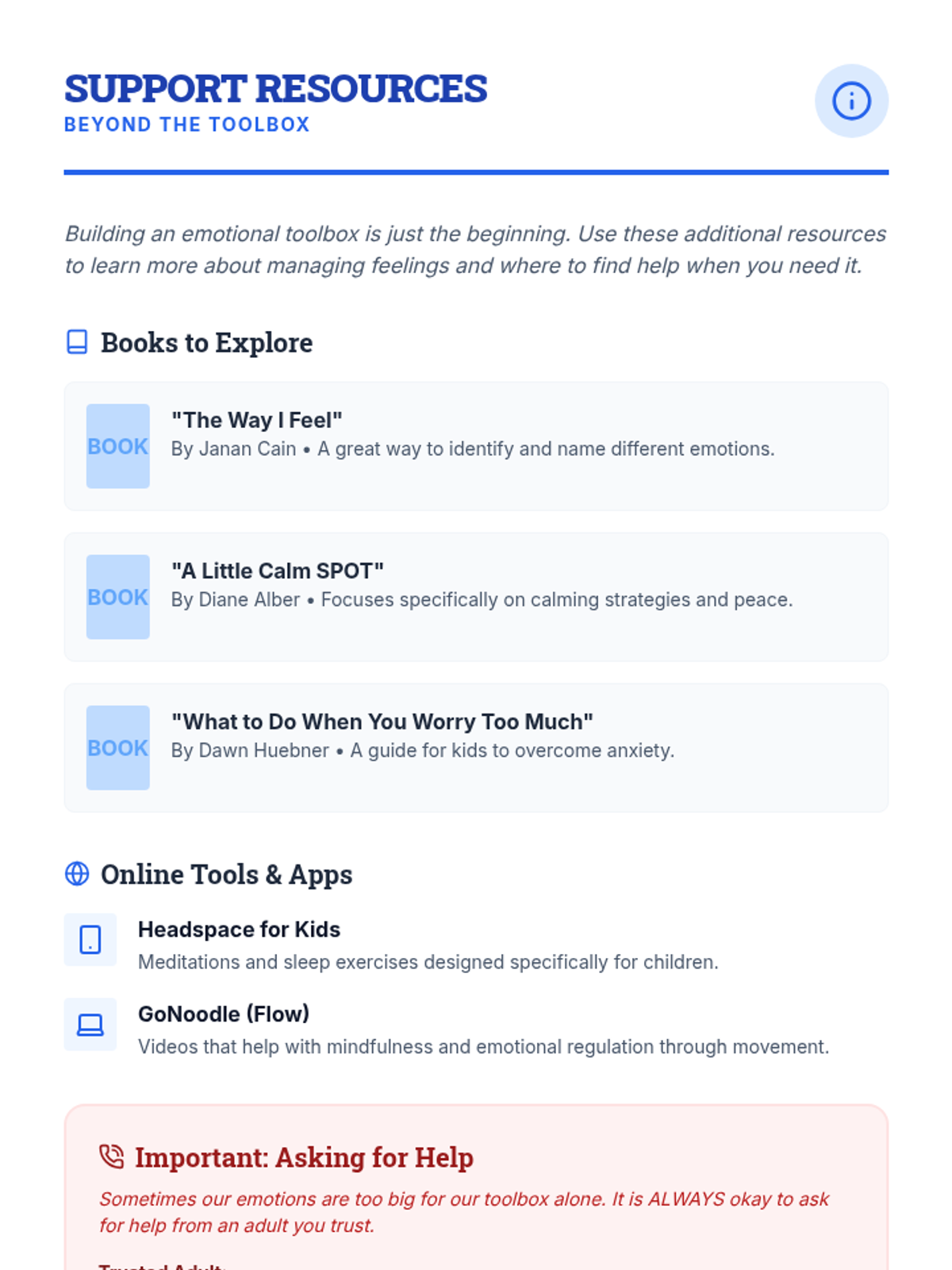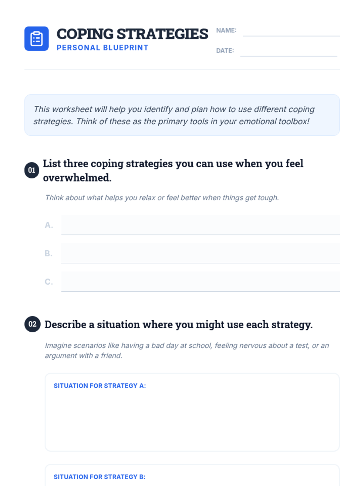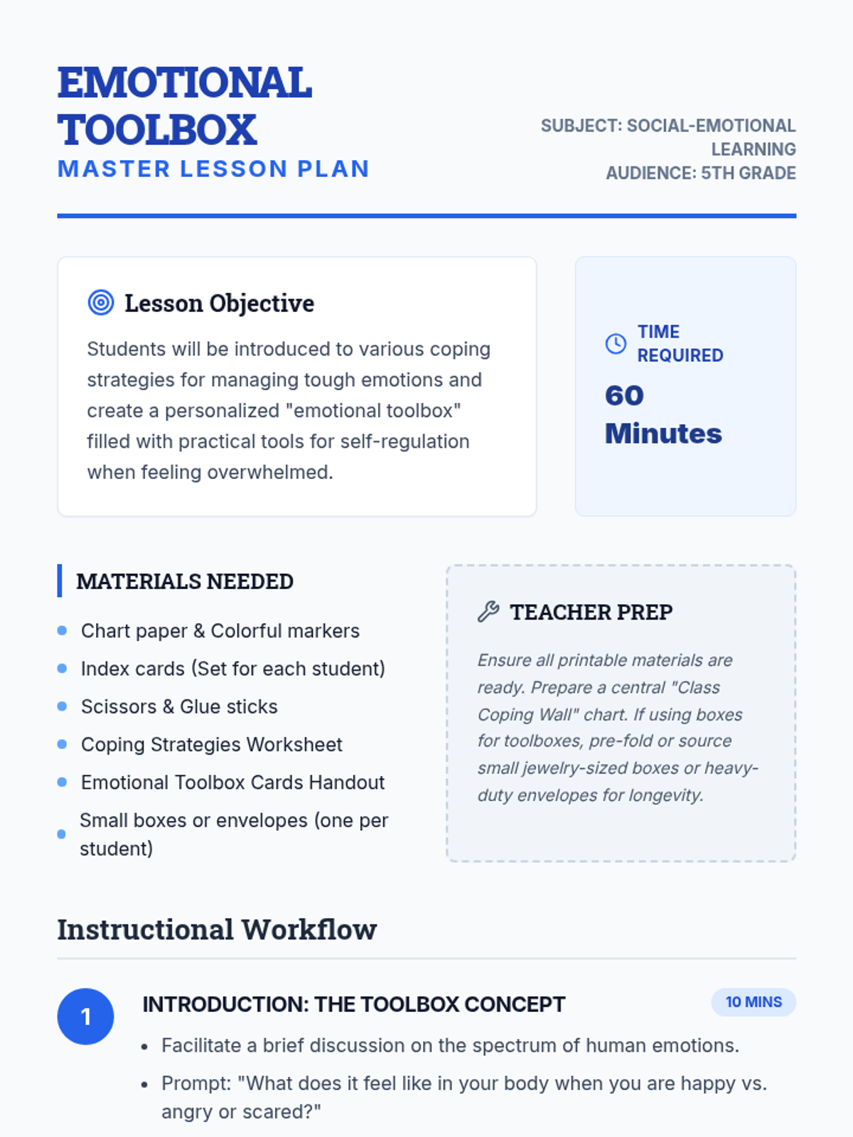 Equips students with practical skills to handle stress and emotions healthily and constructively through the creation of a personalized 'emotional toolbox'.