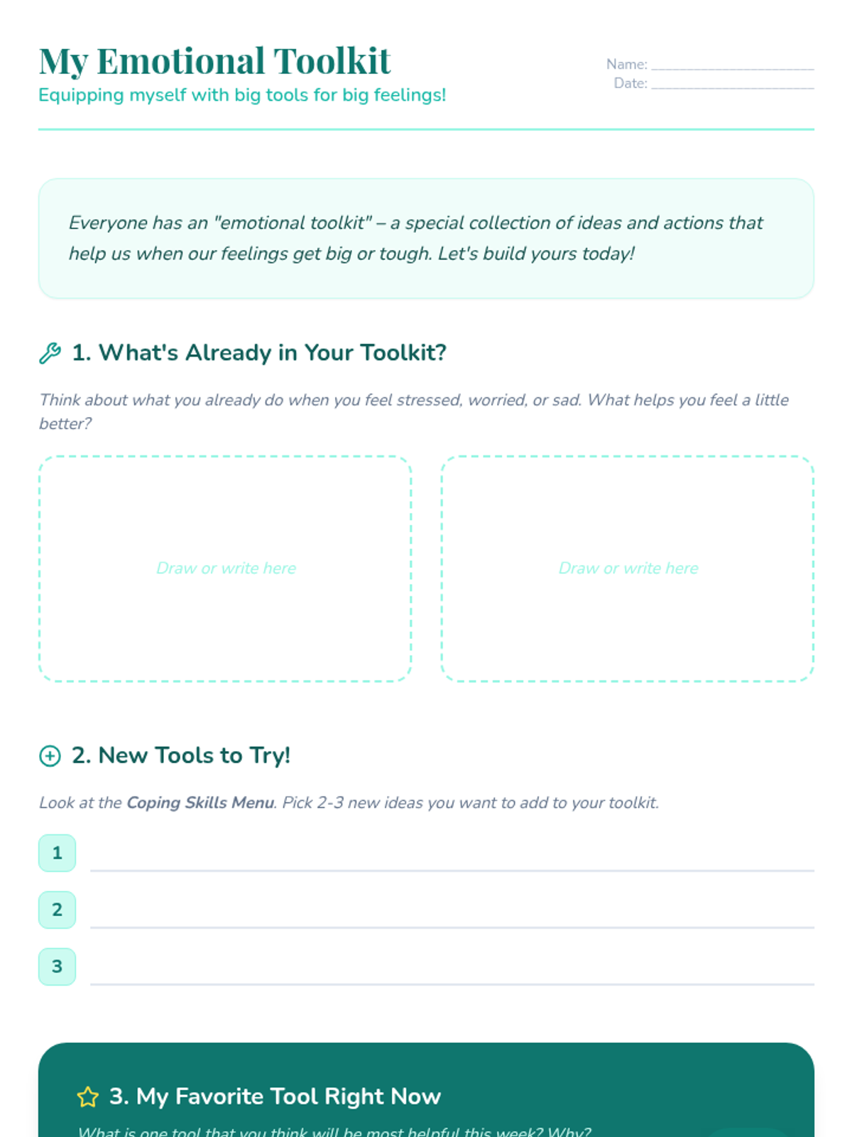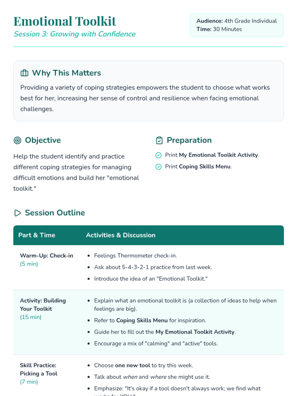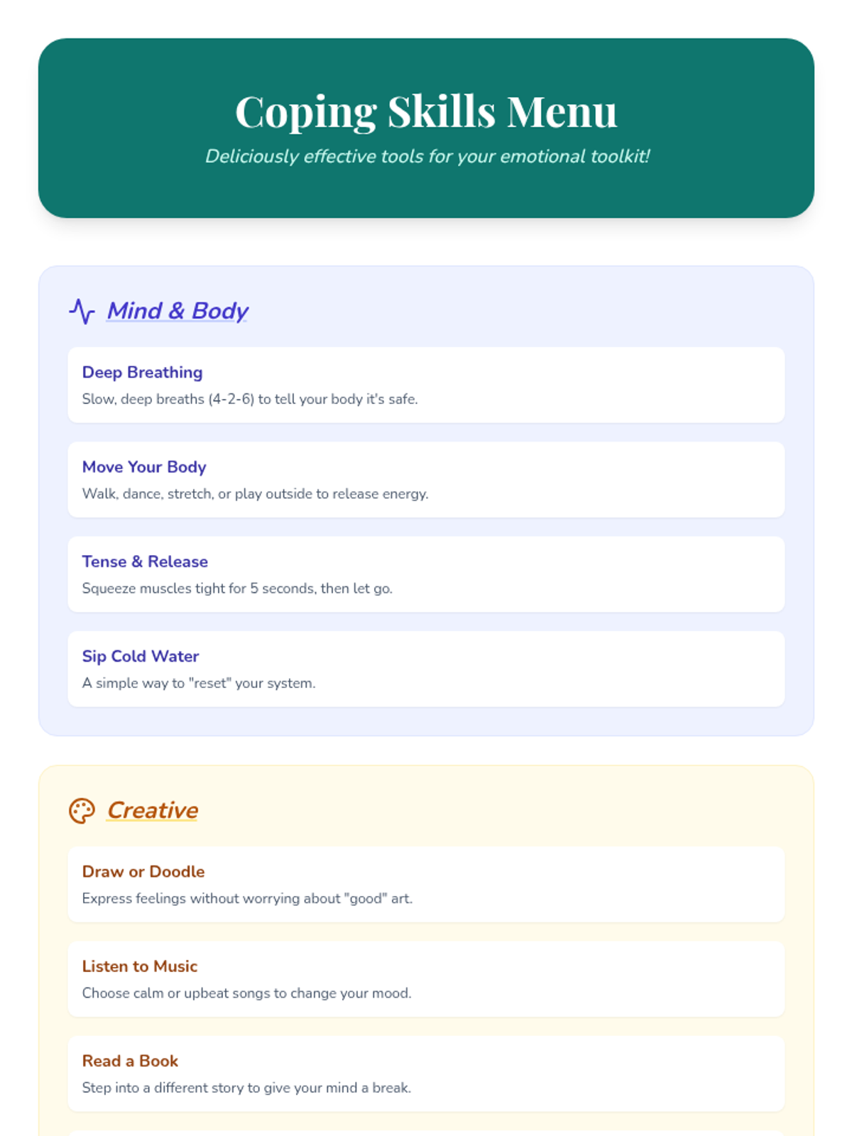 Providing a variety of coping strategies empowers the student to choose what works best for her, increasing her sense of control and resilience when facing emotional challenges.