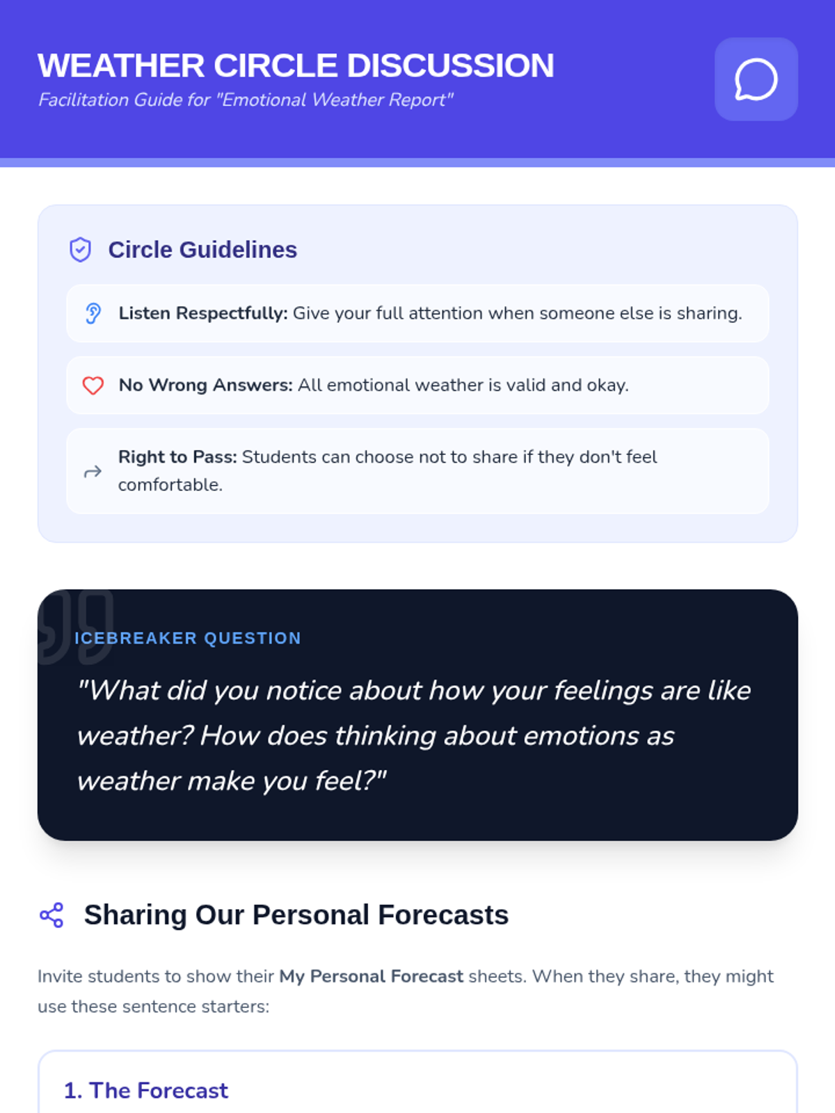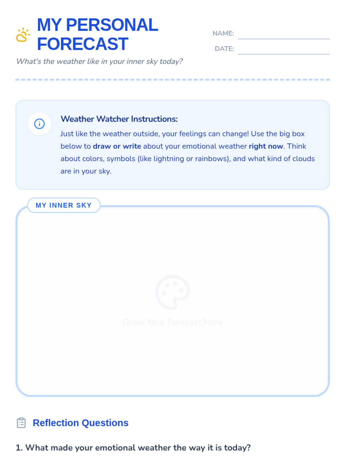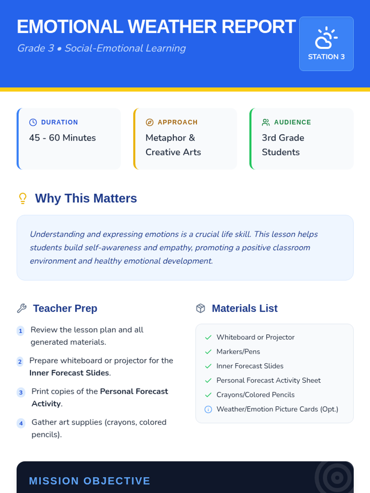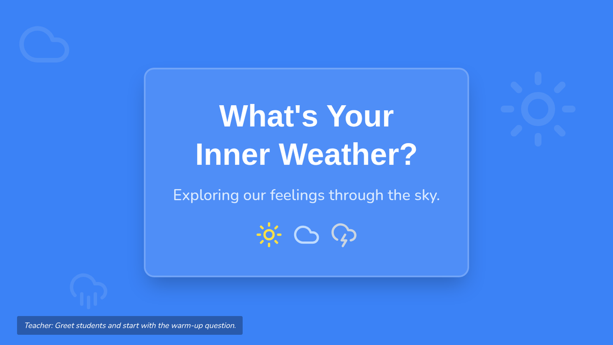 Students will learn to identify and express their current feelings by creating a 'personal weather report,' understanding that emotions, like weather, can change and are all valid. Through discussing different emotional 'weather' scenarios, drawing their own internal 'forecast,' and sharing in a safe circle, 3rd graders will expand their emotional vocabulary and practice healthy self-expression.