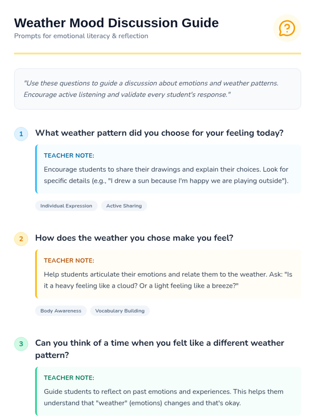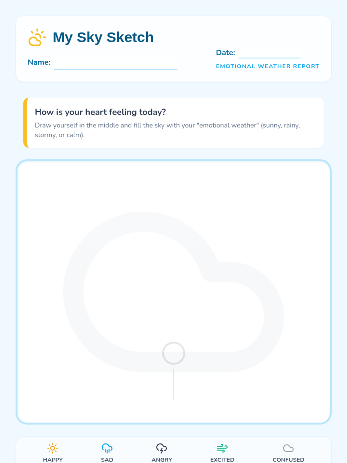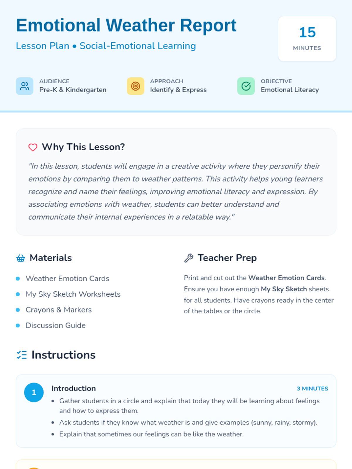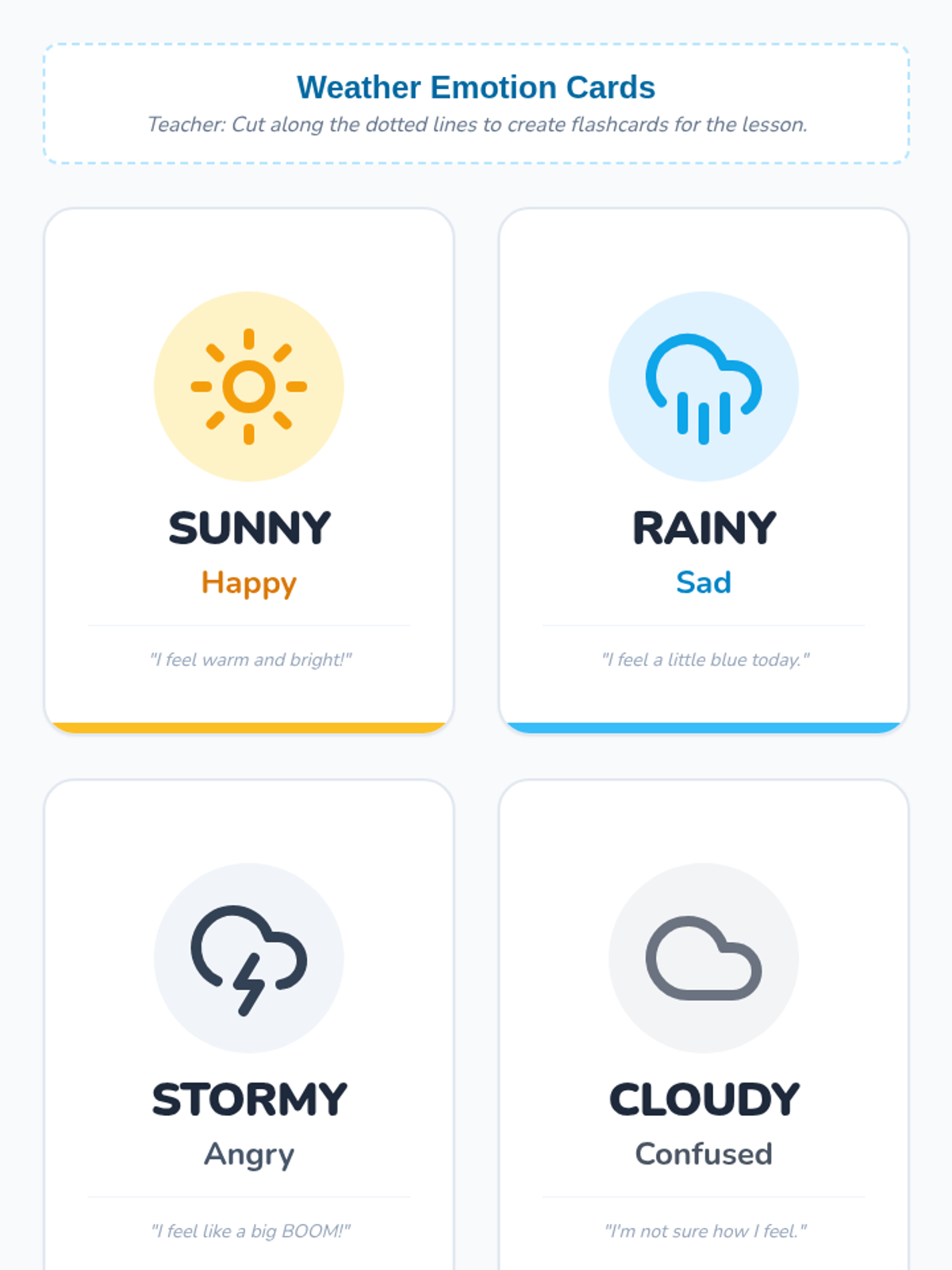 A creative emotional literacy lesson for Pre-K and Kindergarten students where they learn to identify and express their feelings by comparing them to different weather patterns.