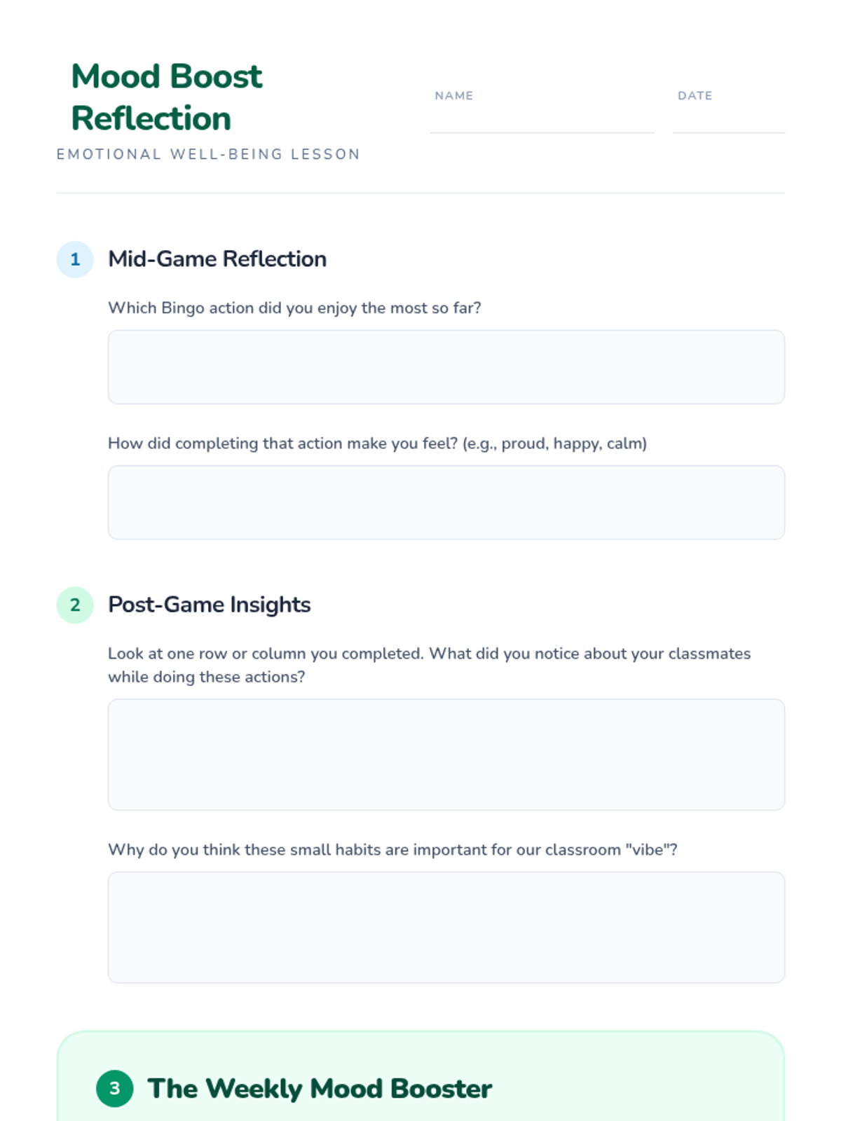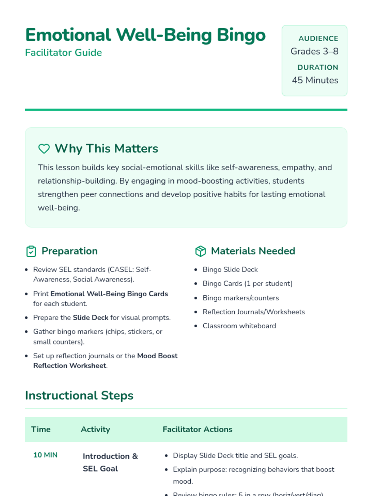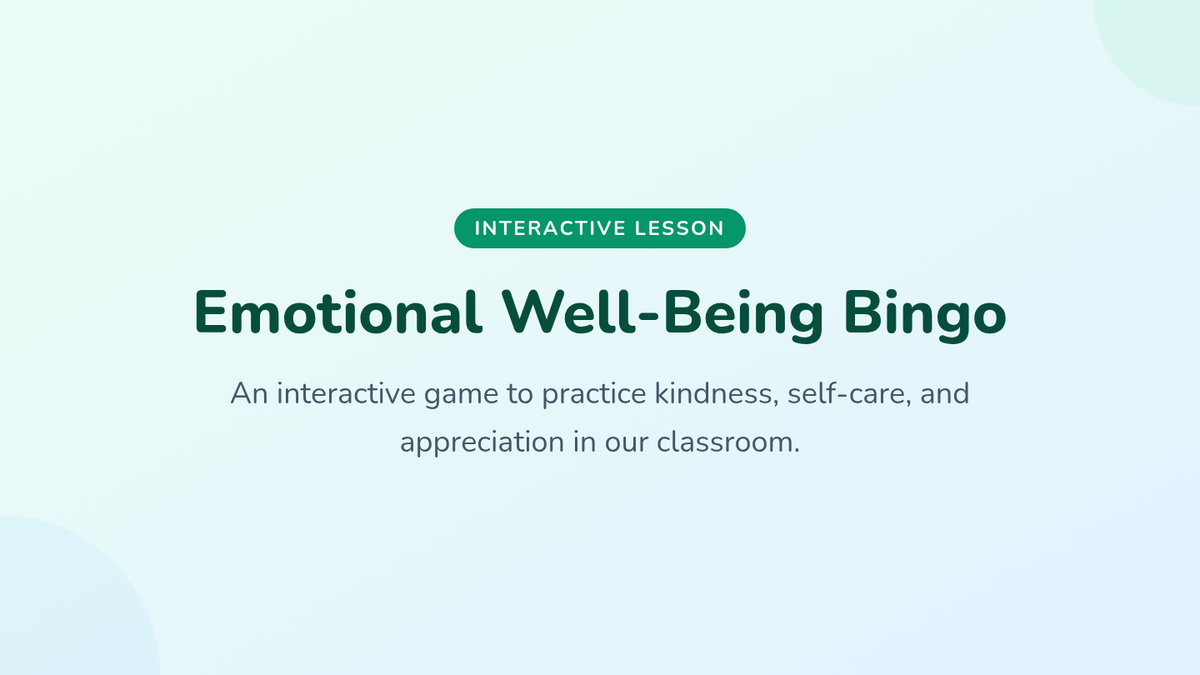 An interactive lesson for Grades 3-8 that uses a bingo format to help students recognize and practice positive behaviors, habits, and peer connections to improve mood and classroom well-being.