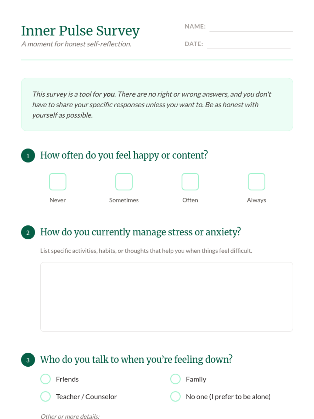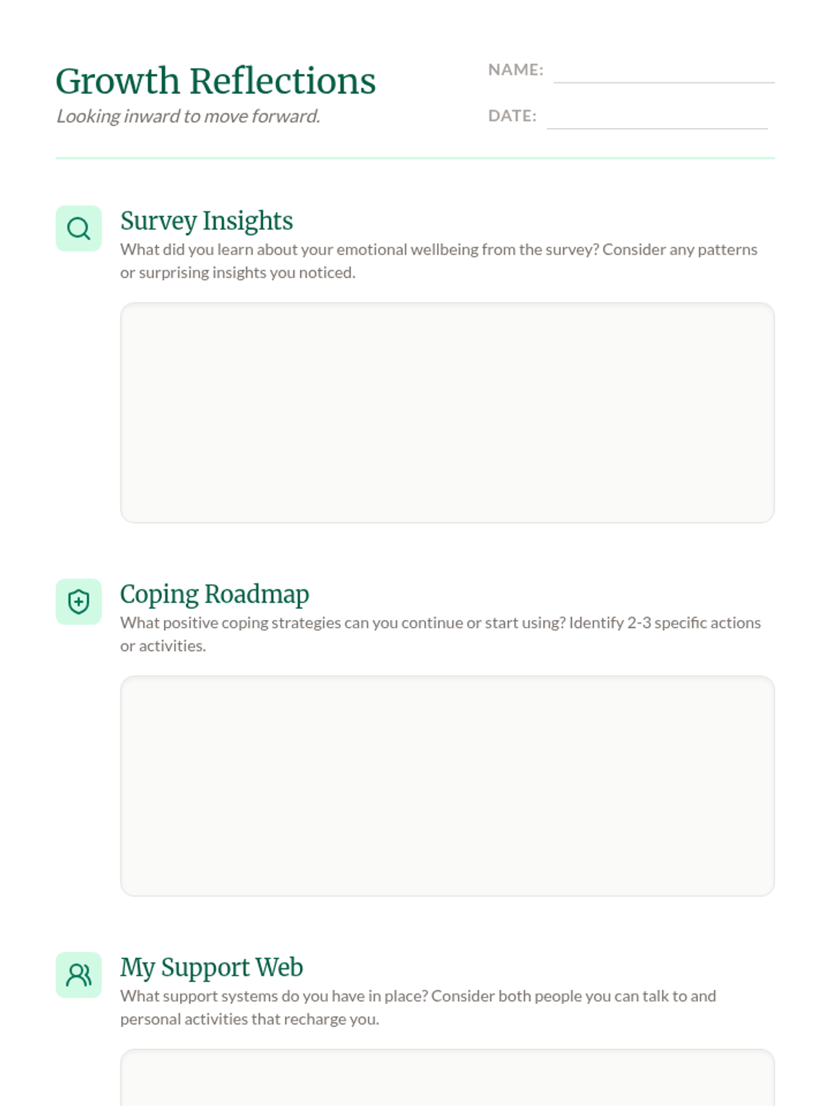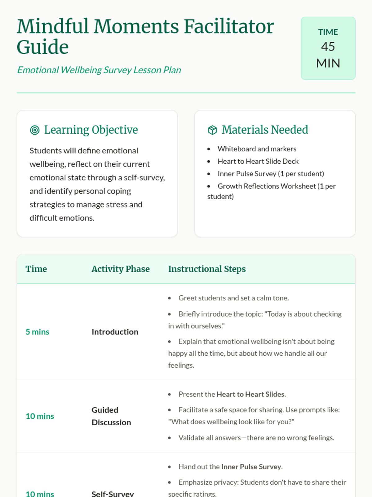 Students will learn about emotional wellbeing through guided discussions, self-reflection surveys, and coping strategy identification. This lesson fosters self-awareness and emotional literacy in a supportive, mindful environment.