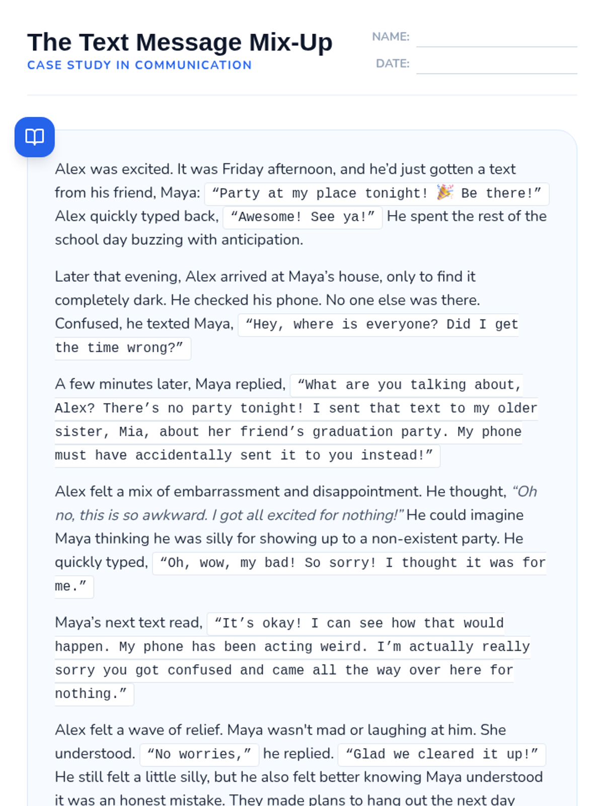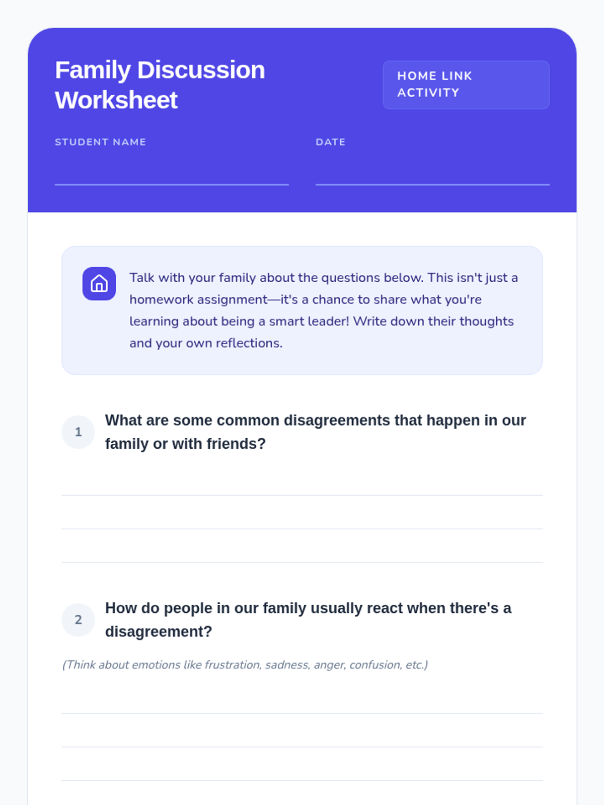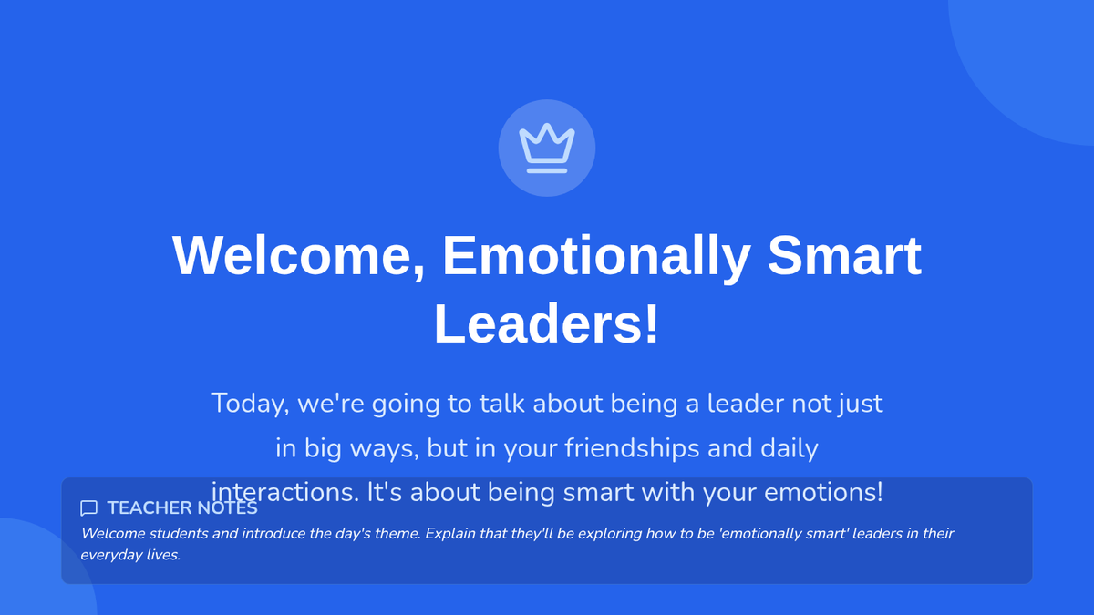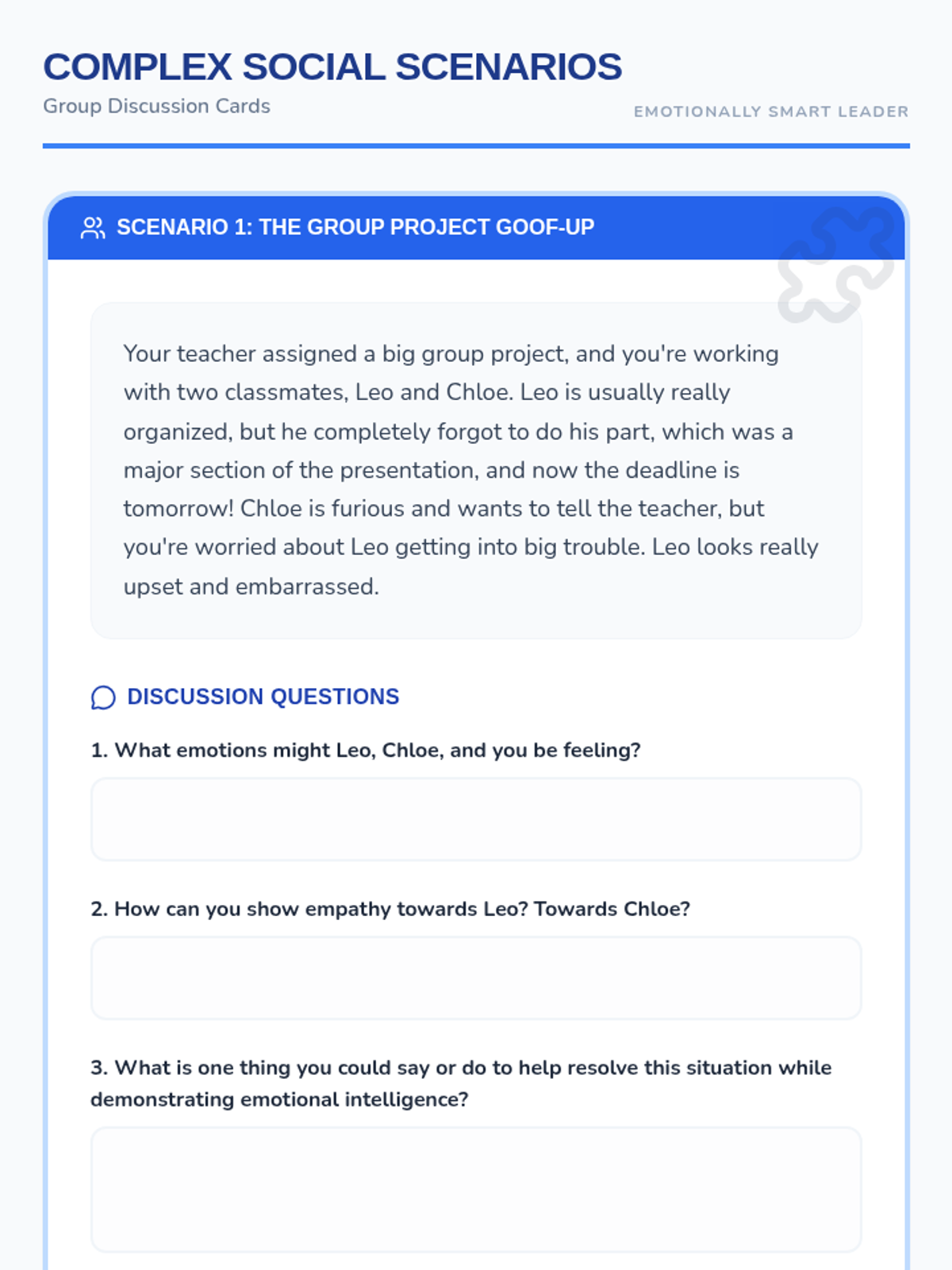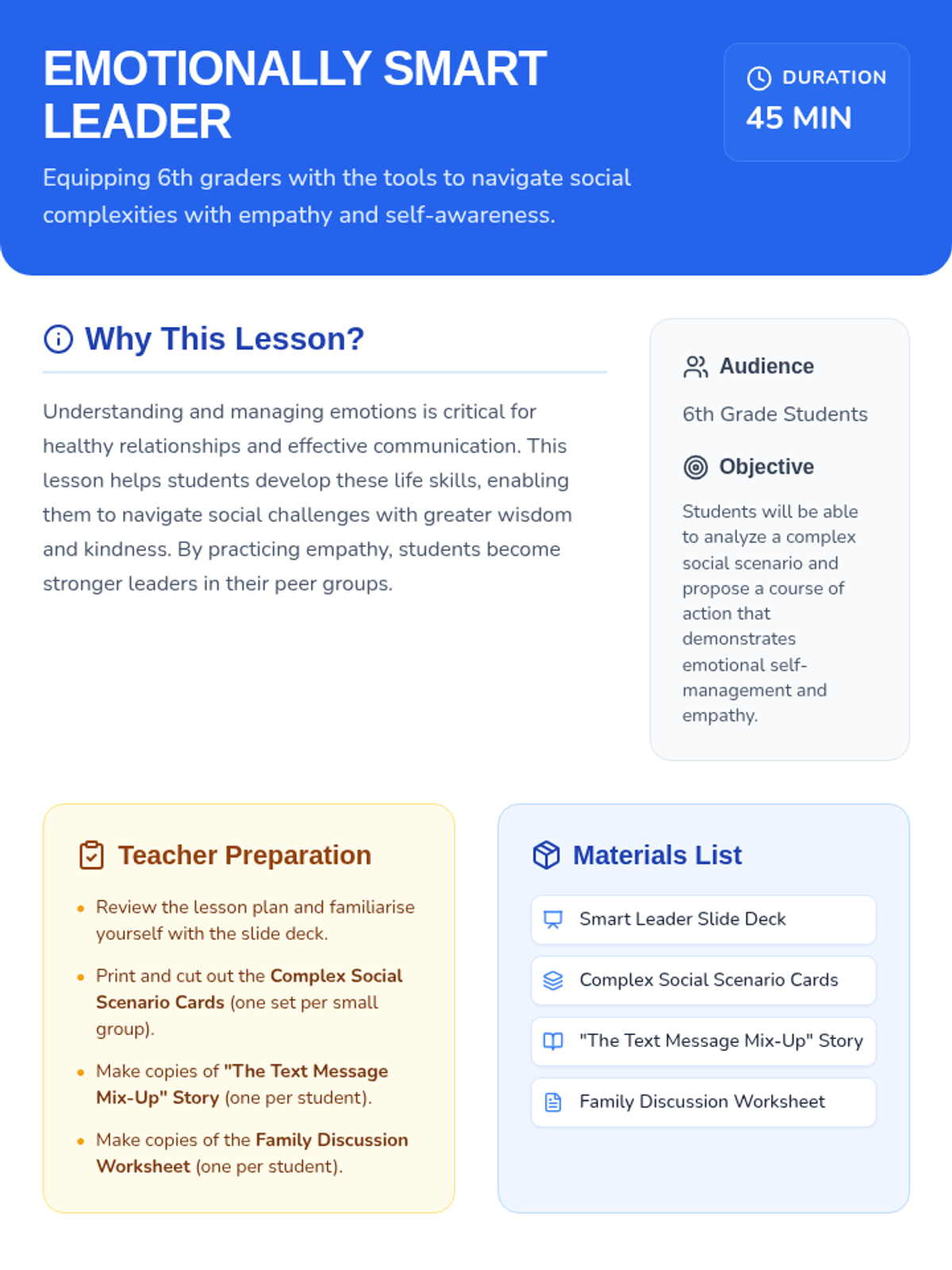 A 45-minute lesson for 6th-grade students focused on developing emotional intelligence, empathy, and social leadership through scenario analysis and role-playing.