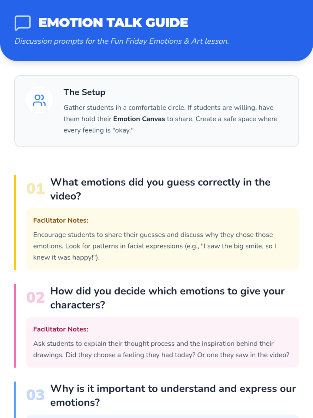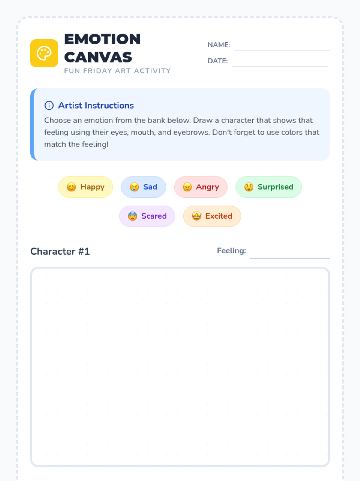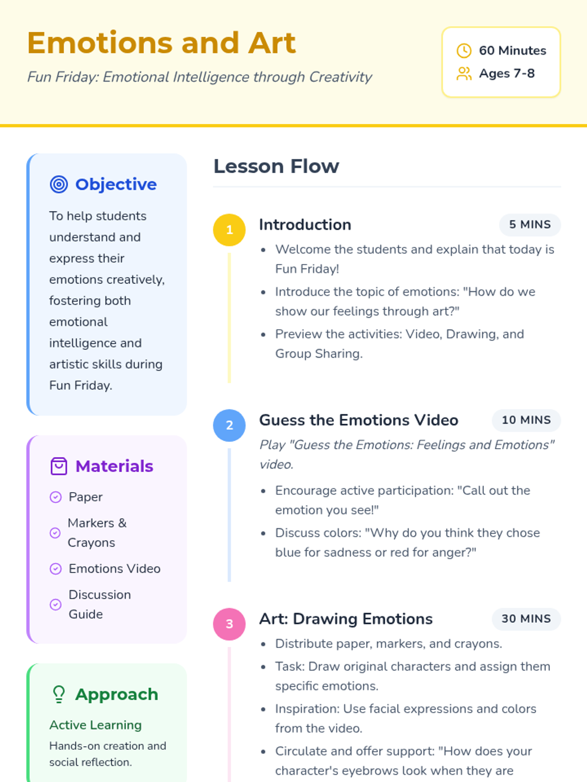 A vibrant Fun Friday lesson exploring emotional intelligence through interactive video, creative character drawing, and reflective discussion. students learn to identify, express, and celebrate feelings through art.