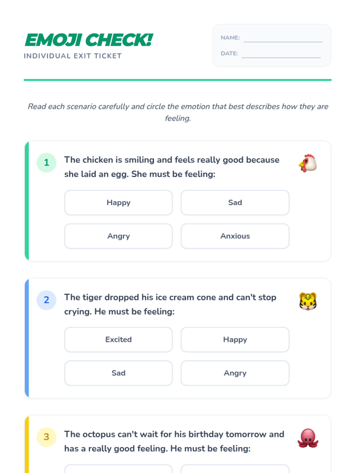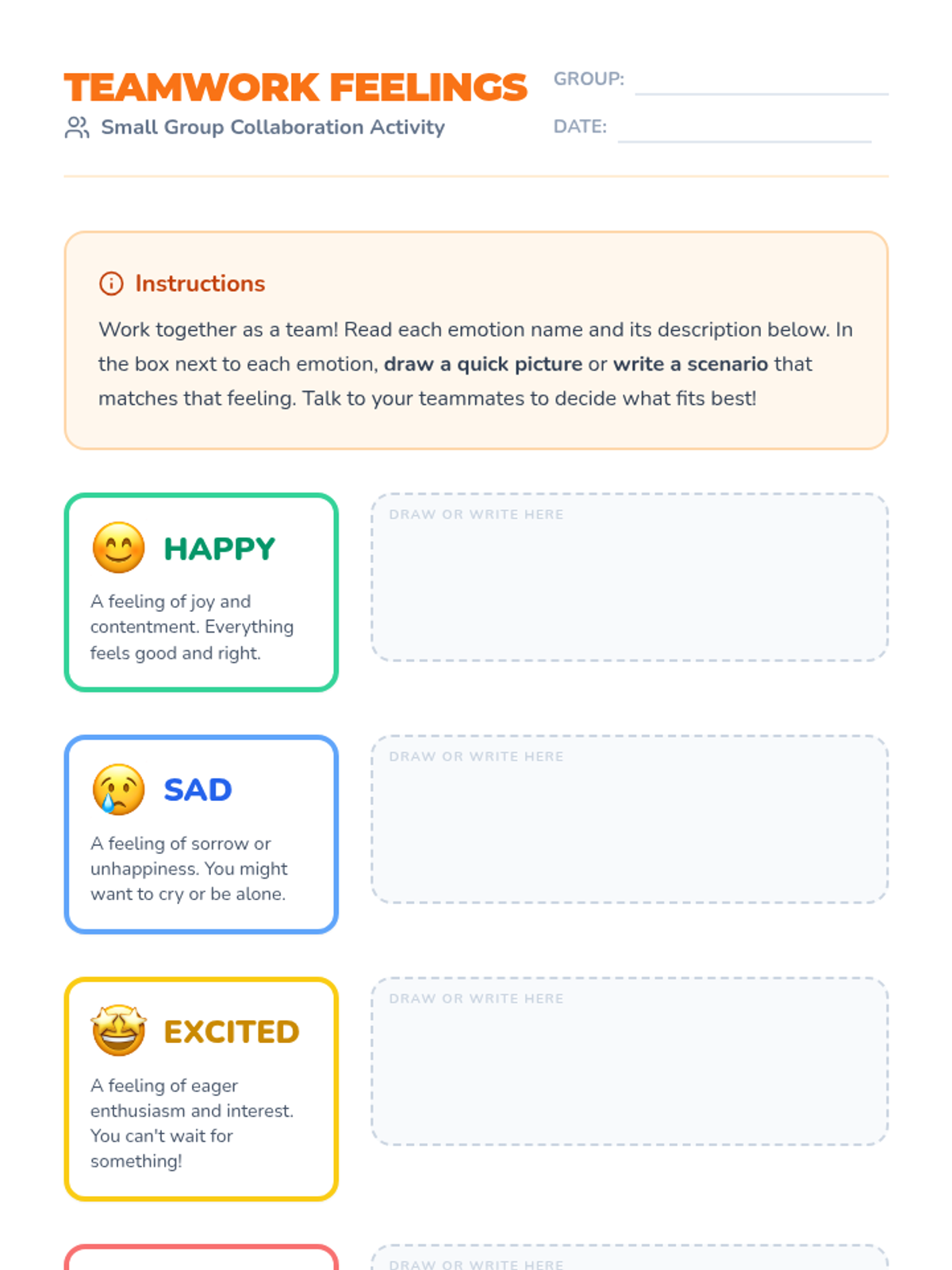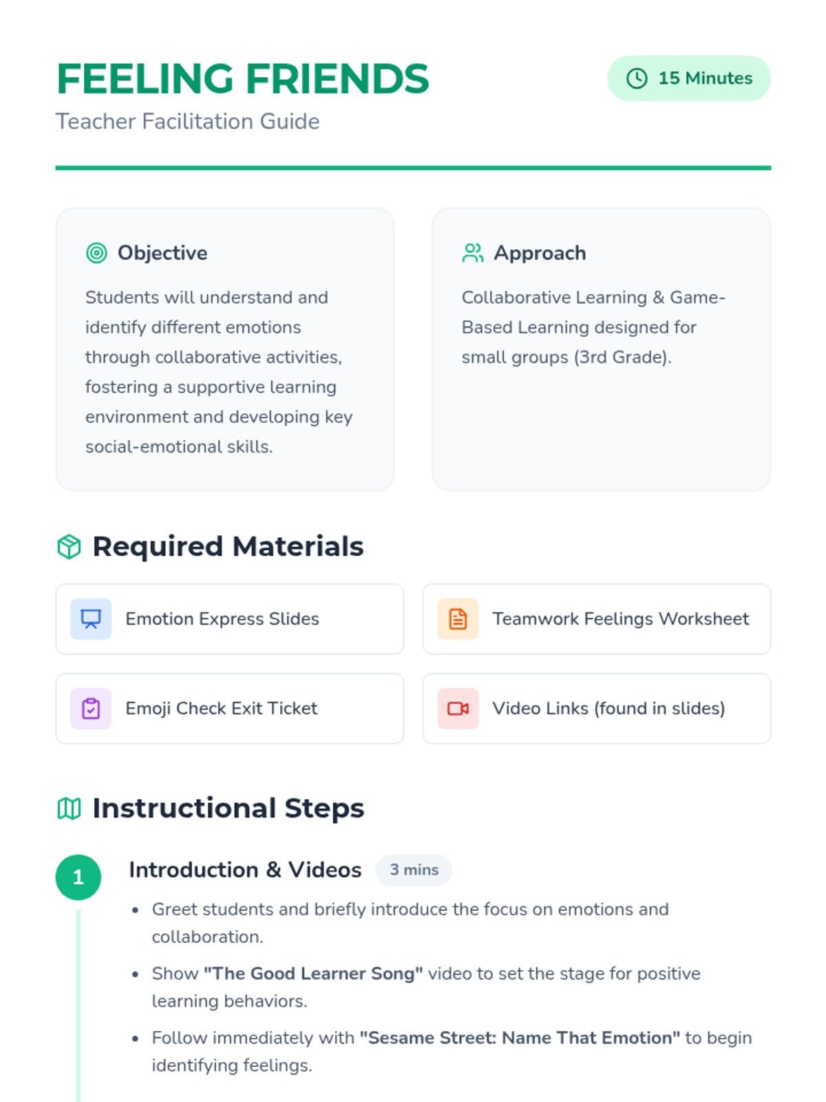 A social-emotional learning lesson for 3rd graders focused on identifying emotions through collaboration and fun video content. Students will work together to match emotions to descriptions and complete an individual exit ticket assessment.