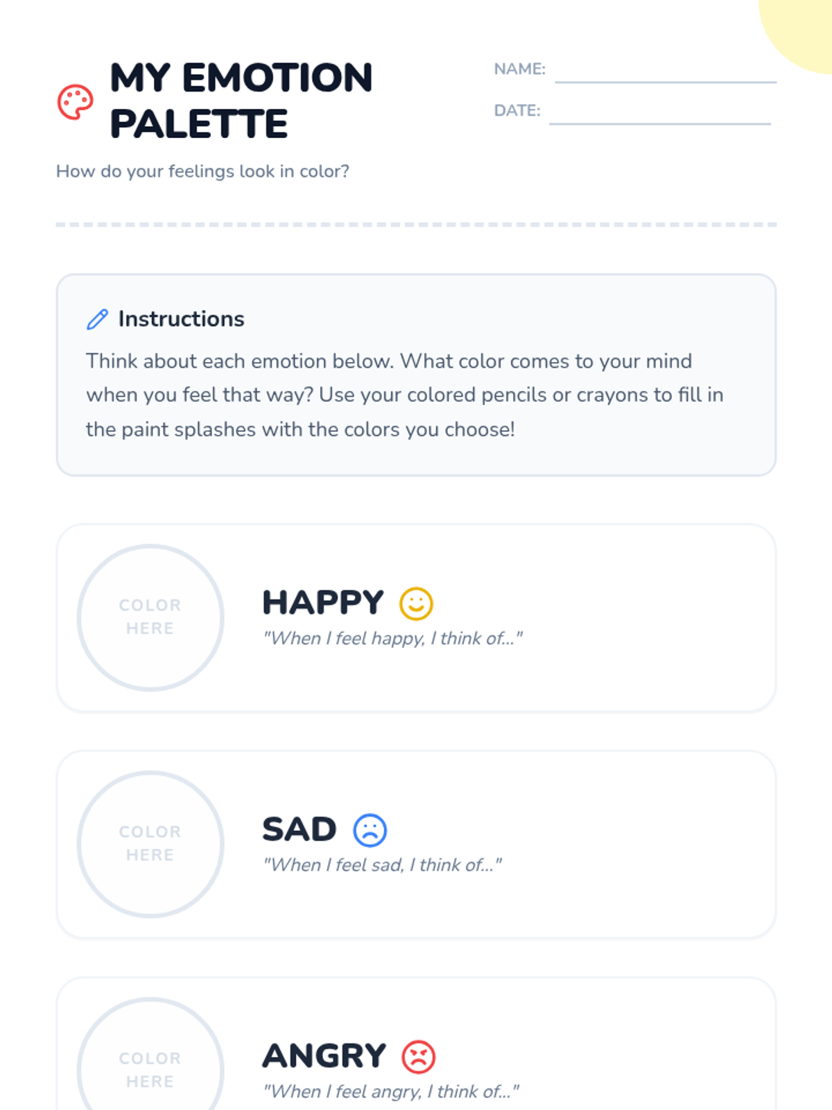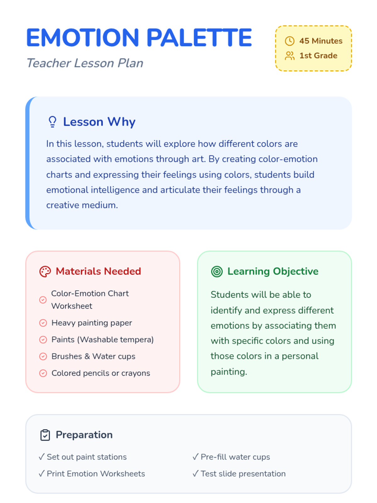 Students explore the connection between colors and emotions through discussion, a color-matching worksheet, and a creative painting activity designed to build emotional intelligence and artistic expression.