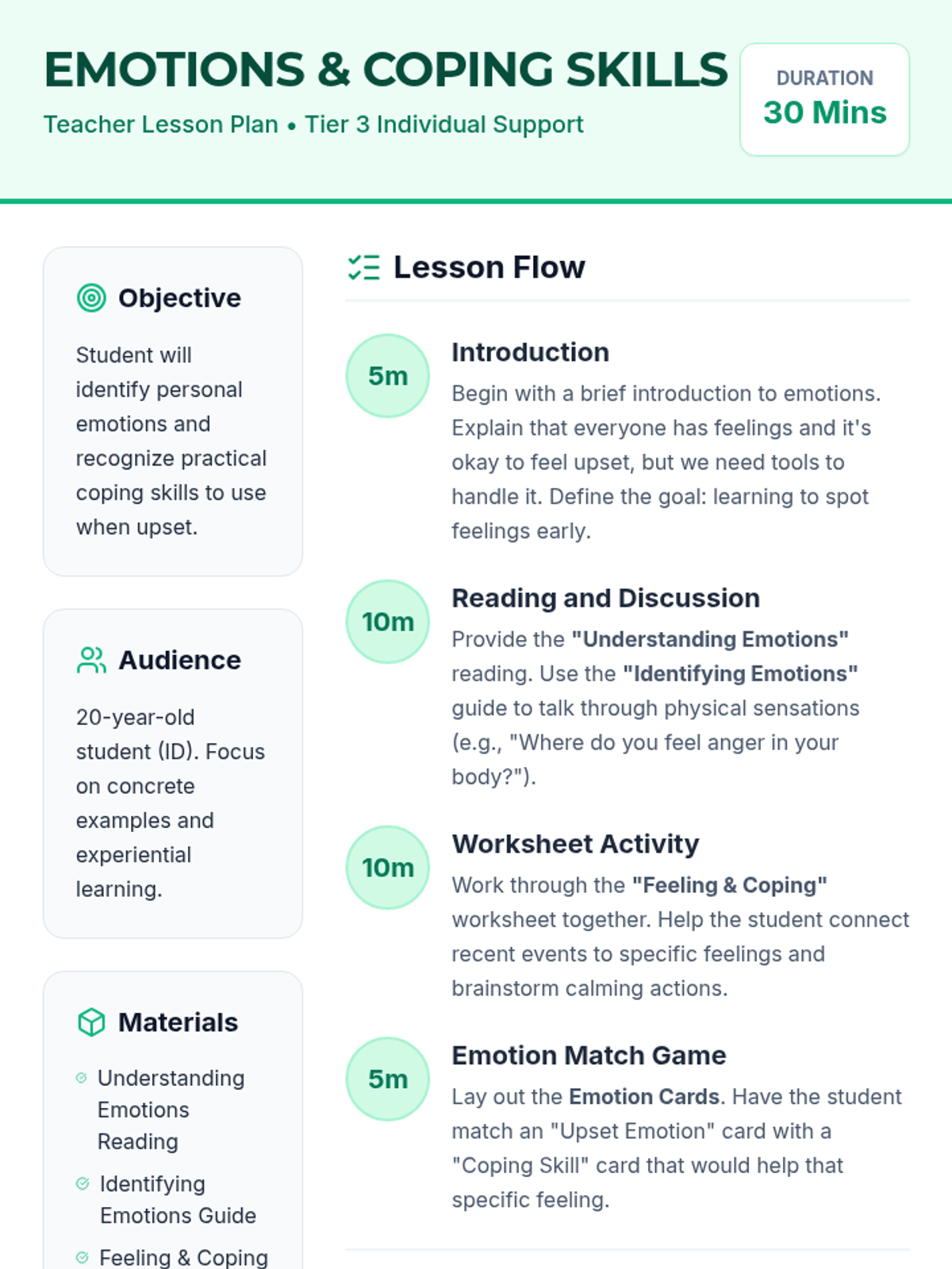 A specialized Tier 3 lesson for a 20-year-old student focused on identifying personal emotions and developing practical coping strategies through experiential and game-based learning.