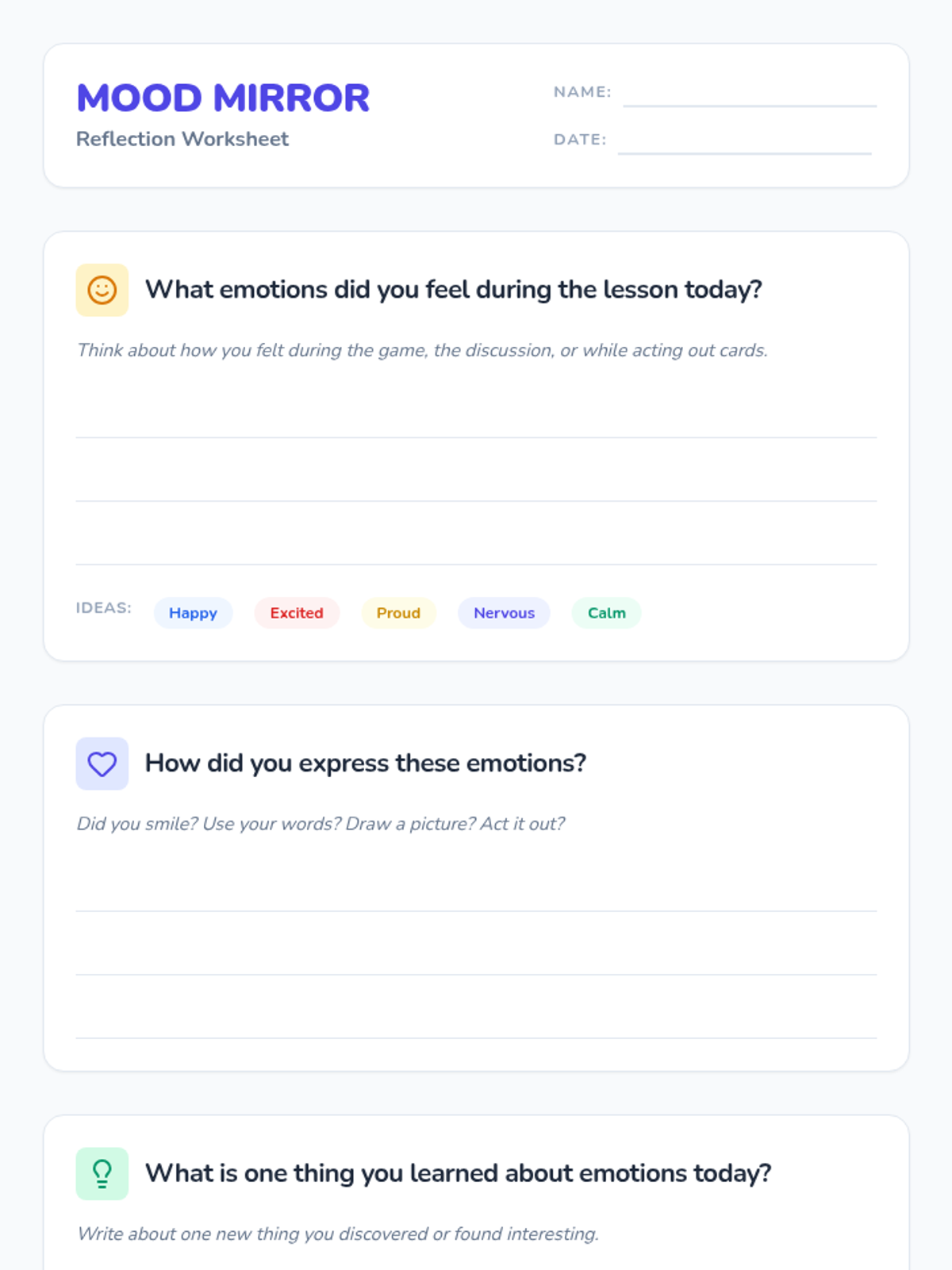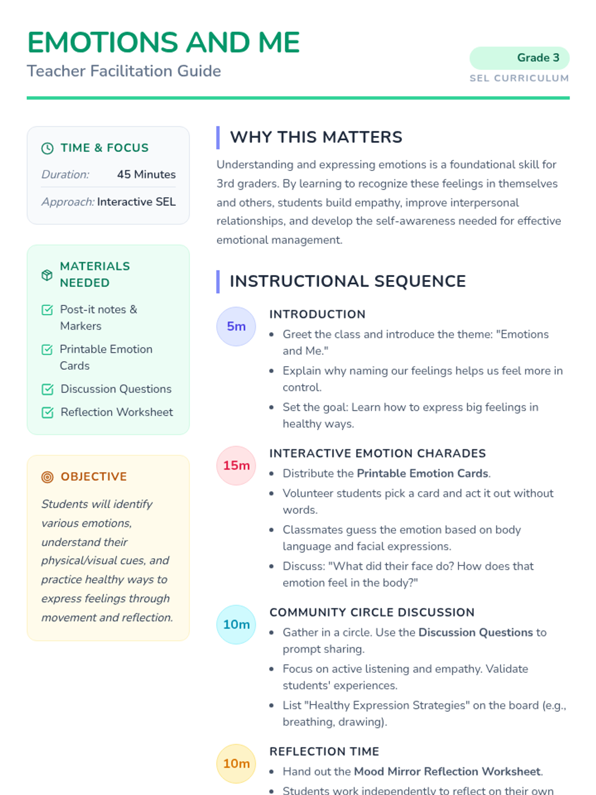 A lesson designed for Grade 3 students to explore, identify, and express their emotions in healthy and constructive ways through interactive activities and reflection.