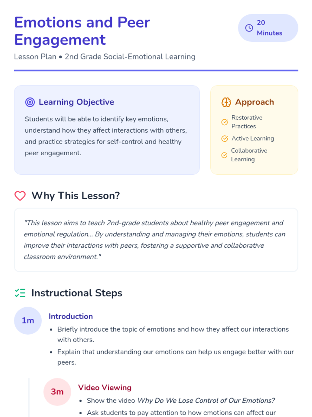 This lesson helps 2nd-grade students understand emotional regulation and healthy peer engagement through video, role-play, and mindfulness. Students will learn to identify emotions in themselves and others to build a more collaborative classroom environment.