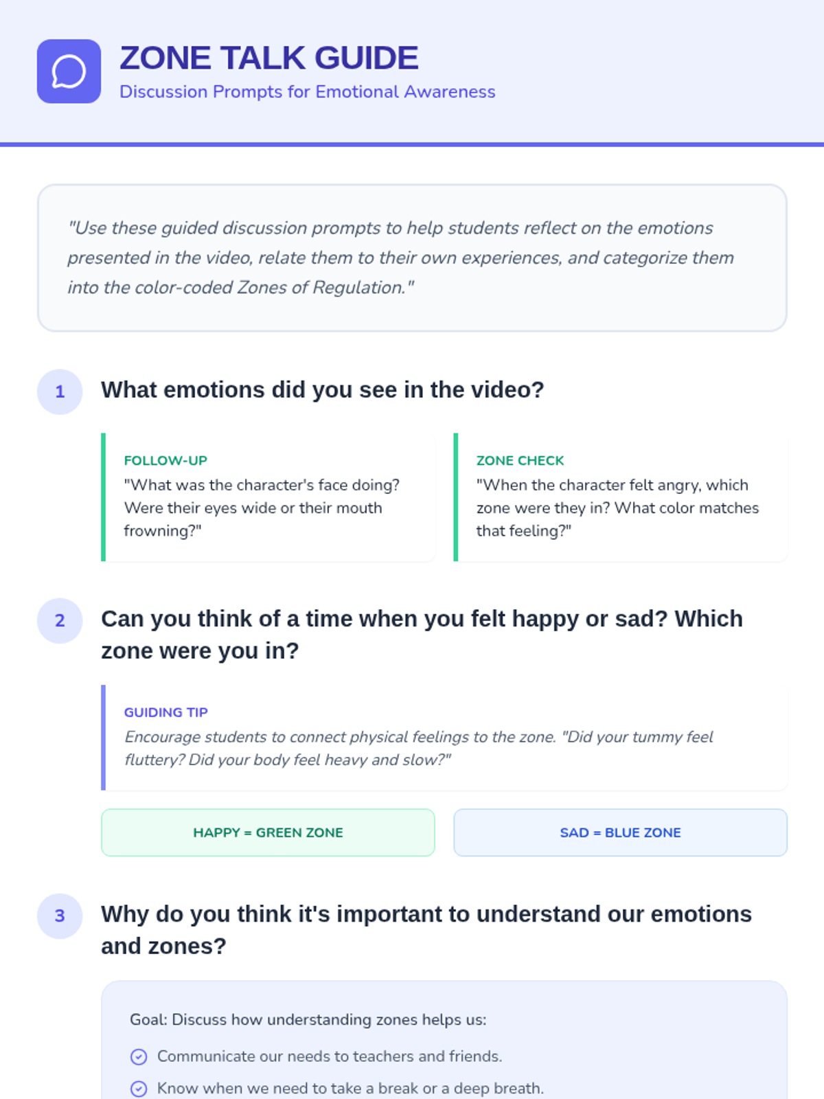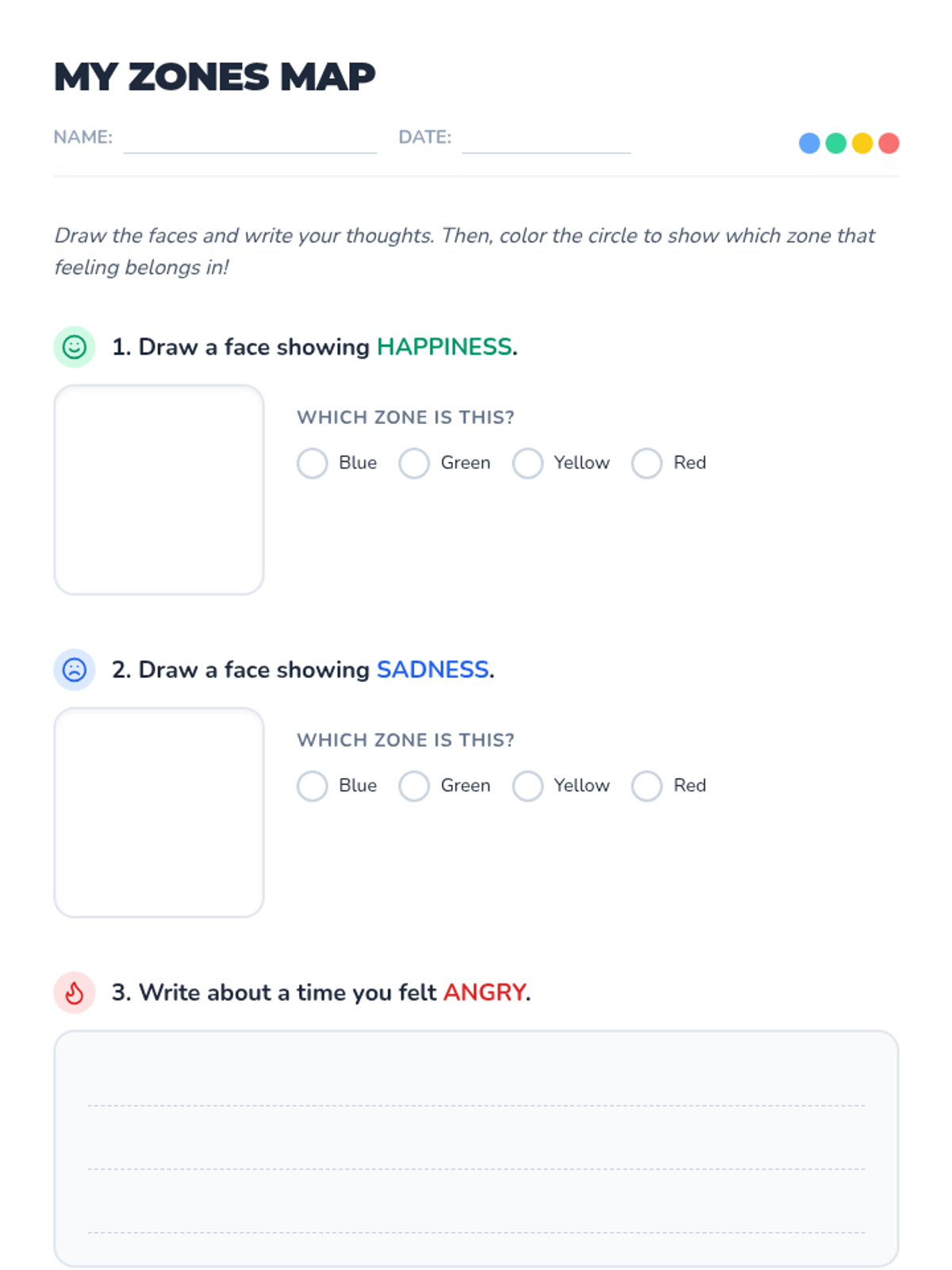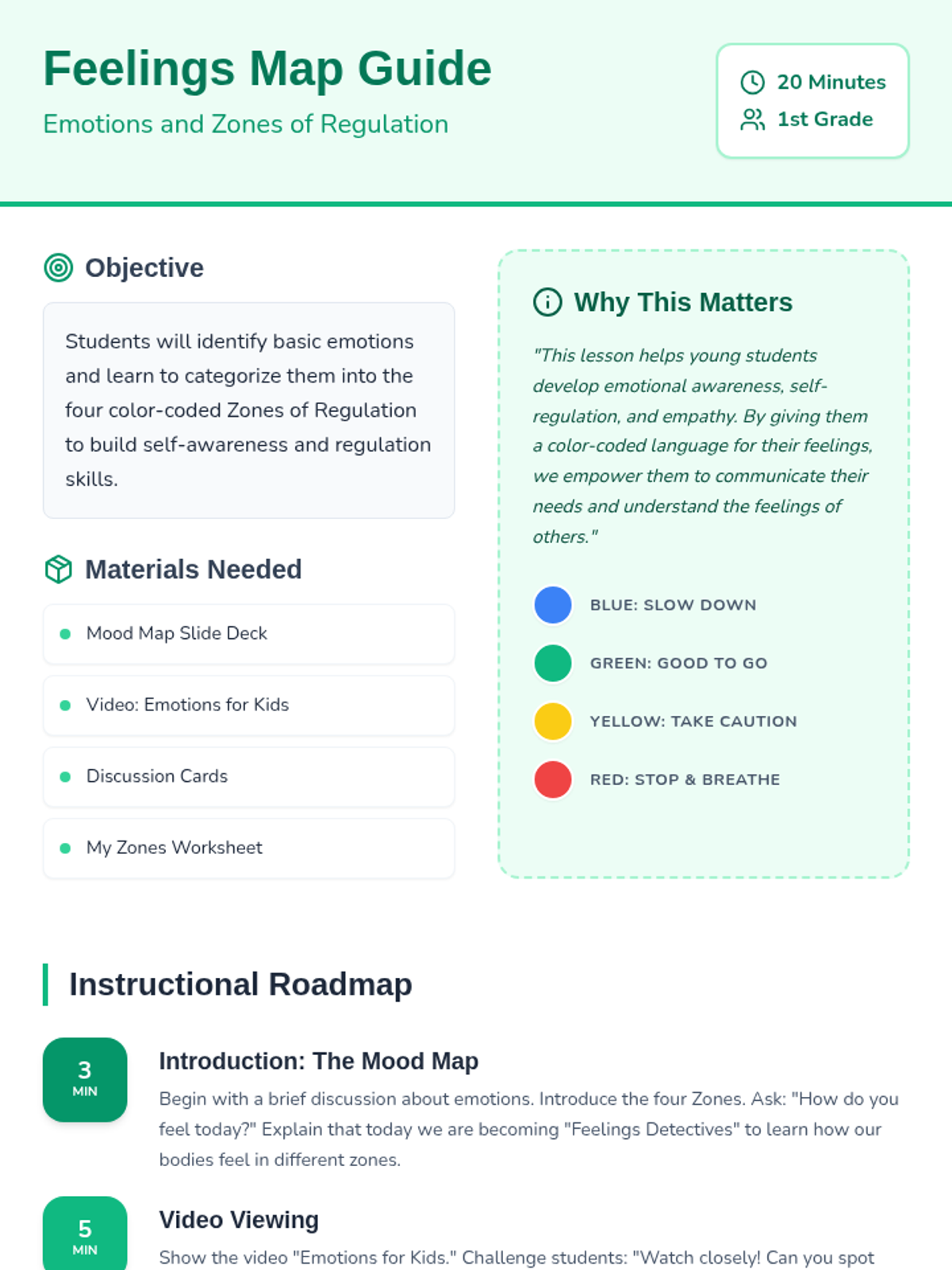 A foundational lesson for 1st graders to identify emotions and categorize them into the four Zones of Regulation (Blue, Green, Yellow, and Red) to build self-awareness and regulation skills.
