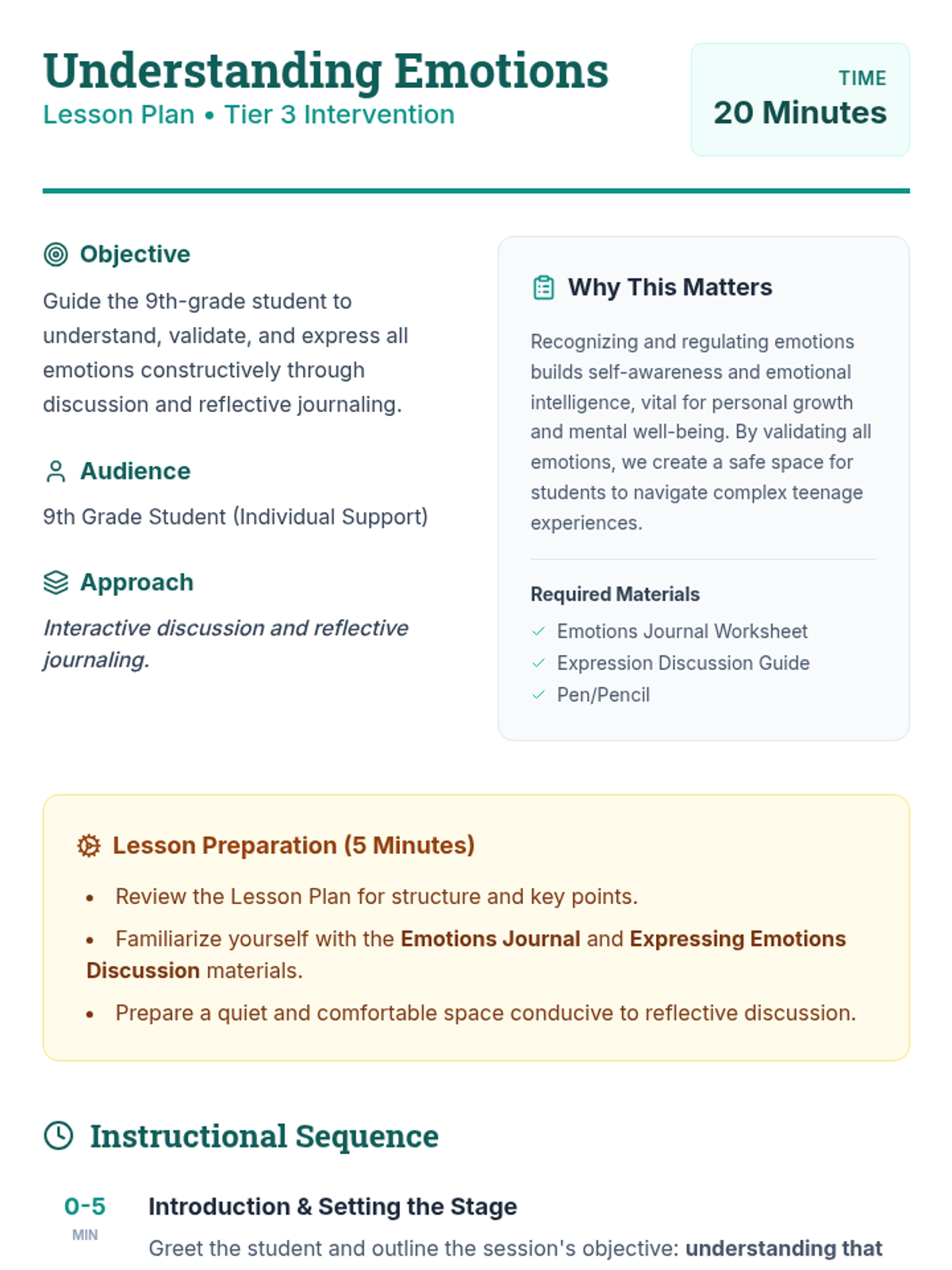A 20-minute Tier 3 intervention for 9th-grade students to build emotional intelligence, validate their feelings, and practice constructive expression.
