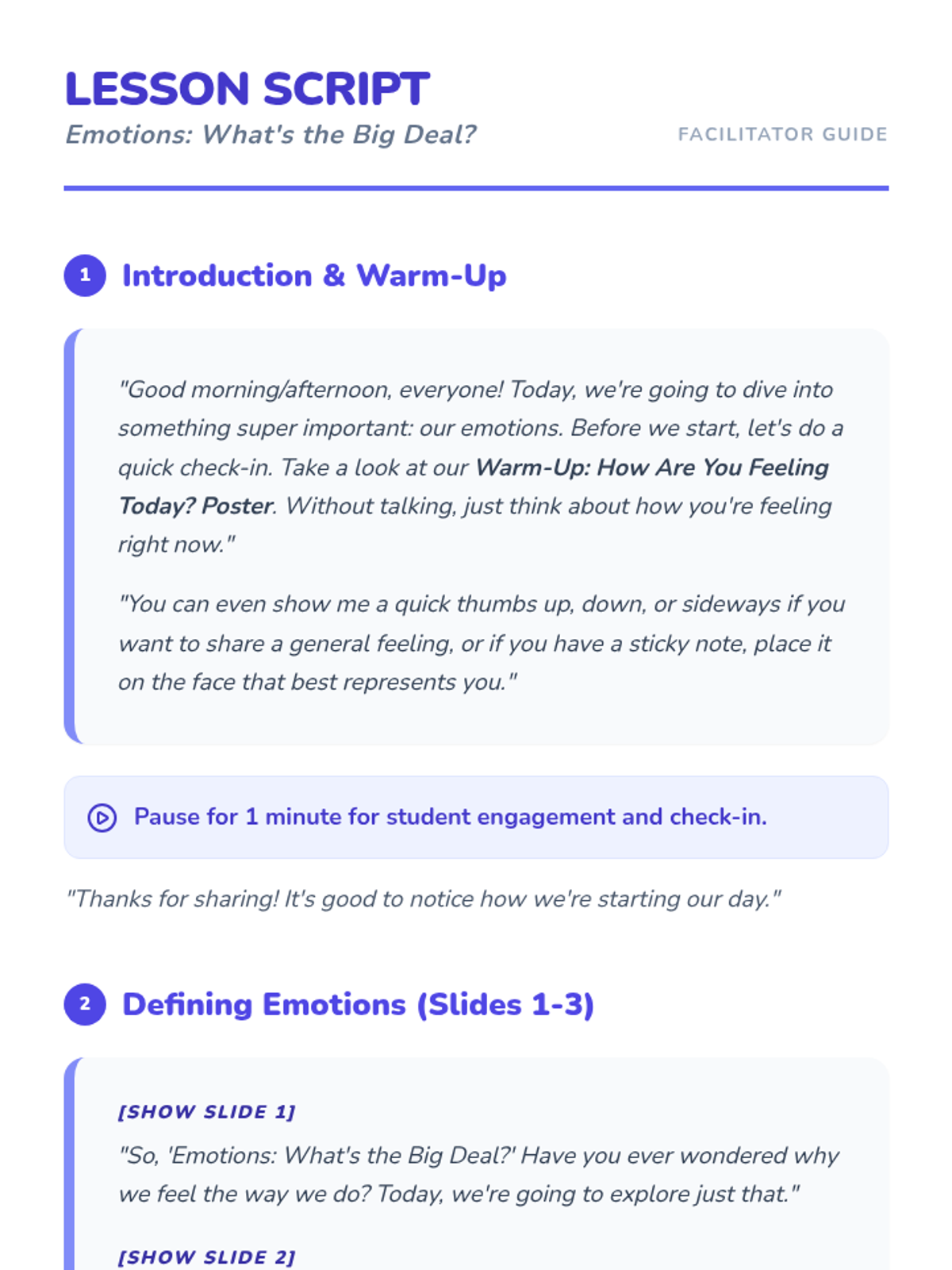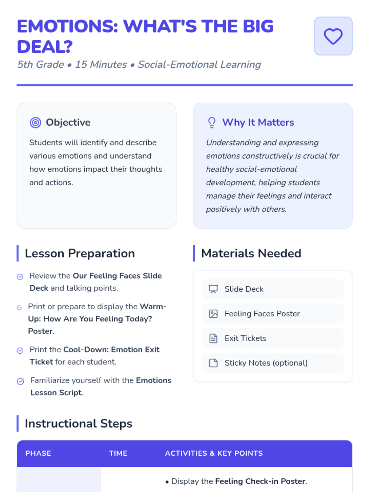 A 15-minute introductory lesson for 5th graders to identify, describe, and manage their emotions effectively.