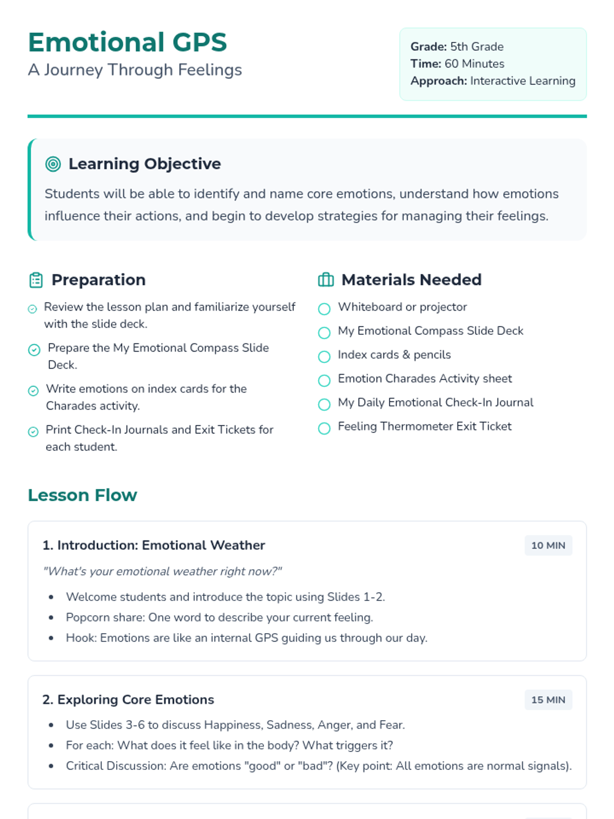 A 60-minute lesson for 5th graders to identify core emotions, understand how they influence behavior, and develop self-awareness using the metaphor of an internal GPS.