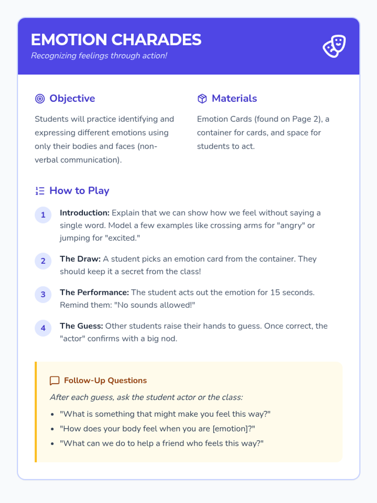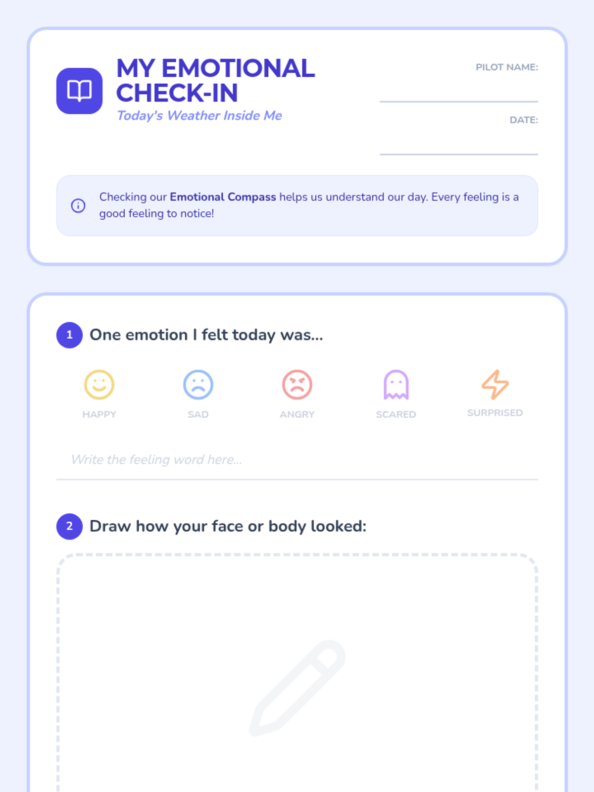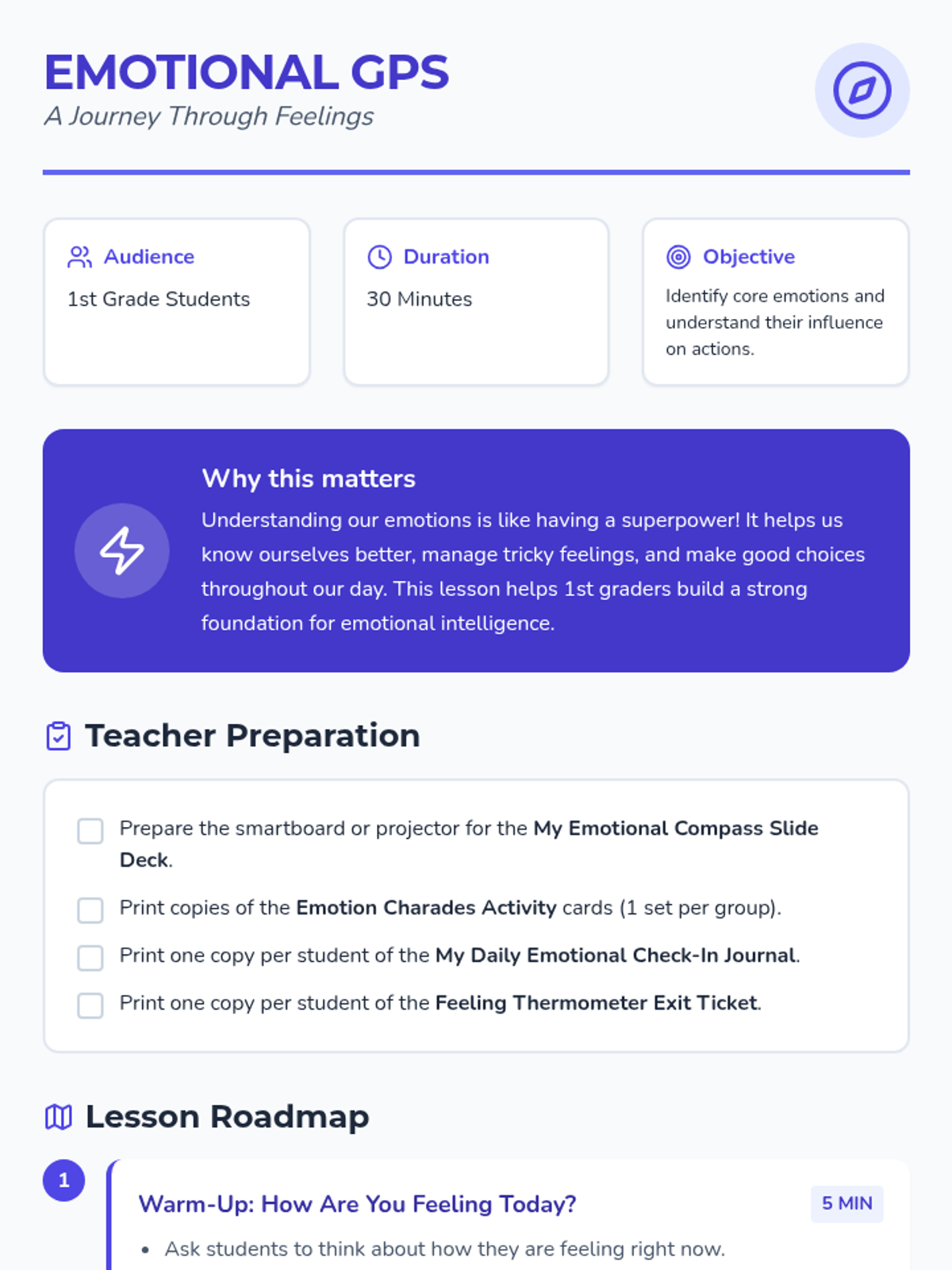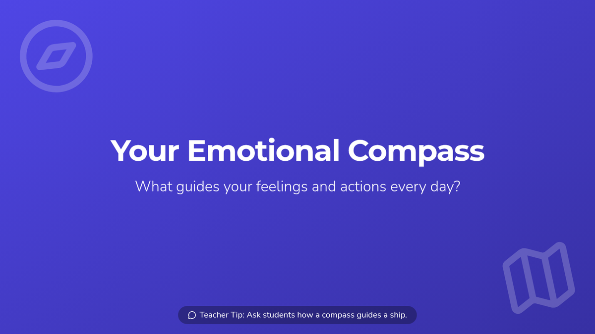 A 1st-grade lesson that uses a 'navigation' metaphor to help students identify core emotions (happy, sad, angry, scared, surprised) and understand how they influence daily behavior. Students participate in discussion, charades, and reflective journaling.