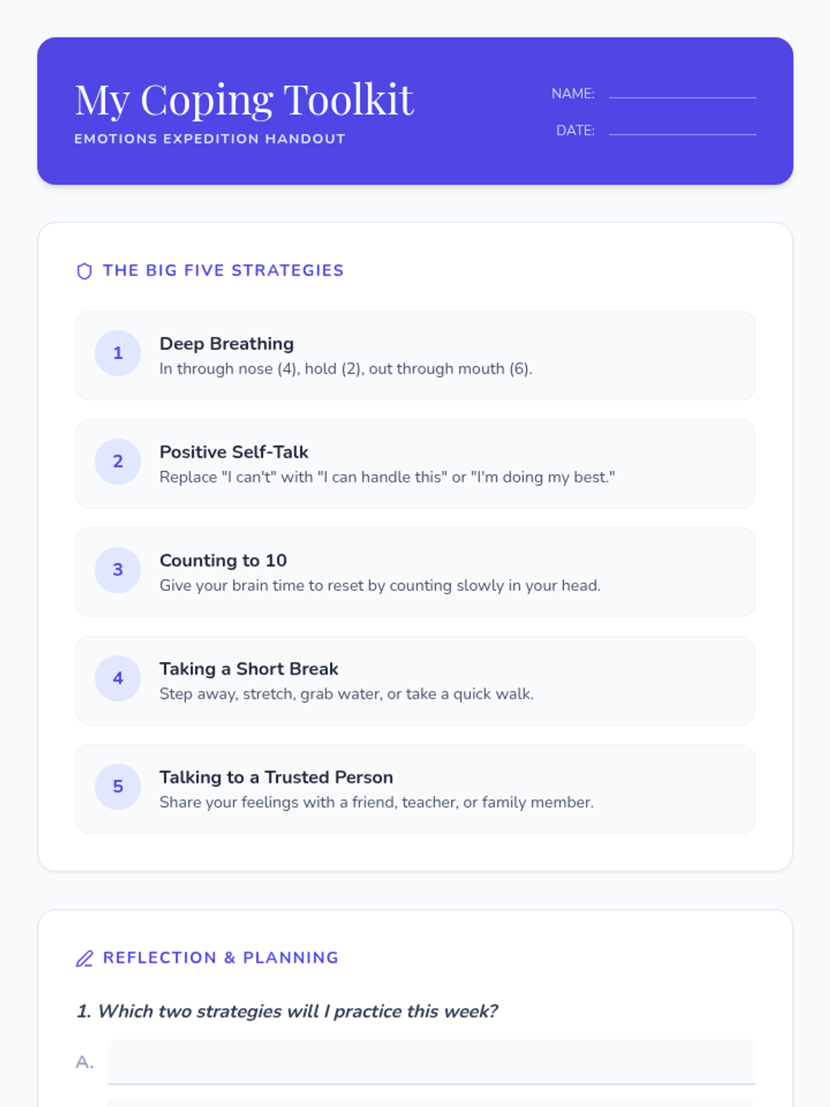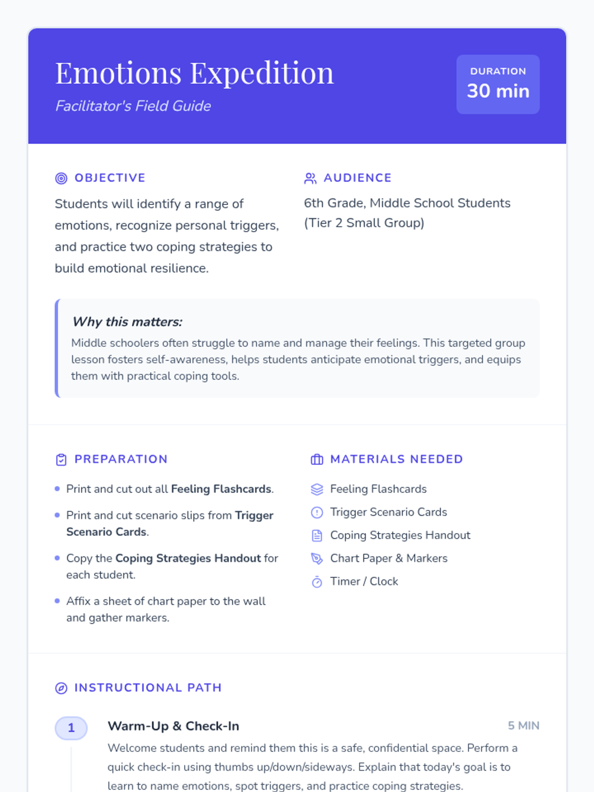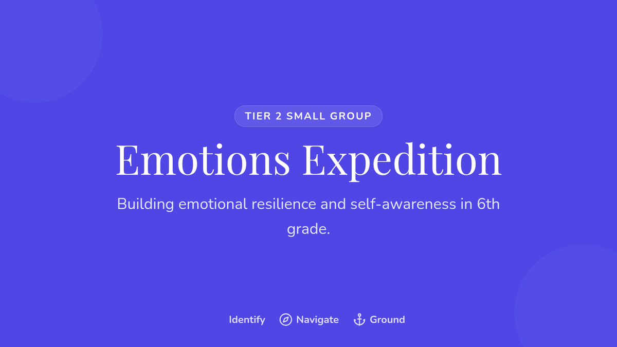 A 30-minute Tier 2 small-group session for 6th graders to identify emotions, recognize triggers, and practice coping strategies to build emotional resilience.