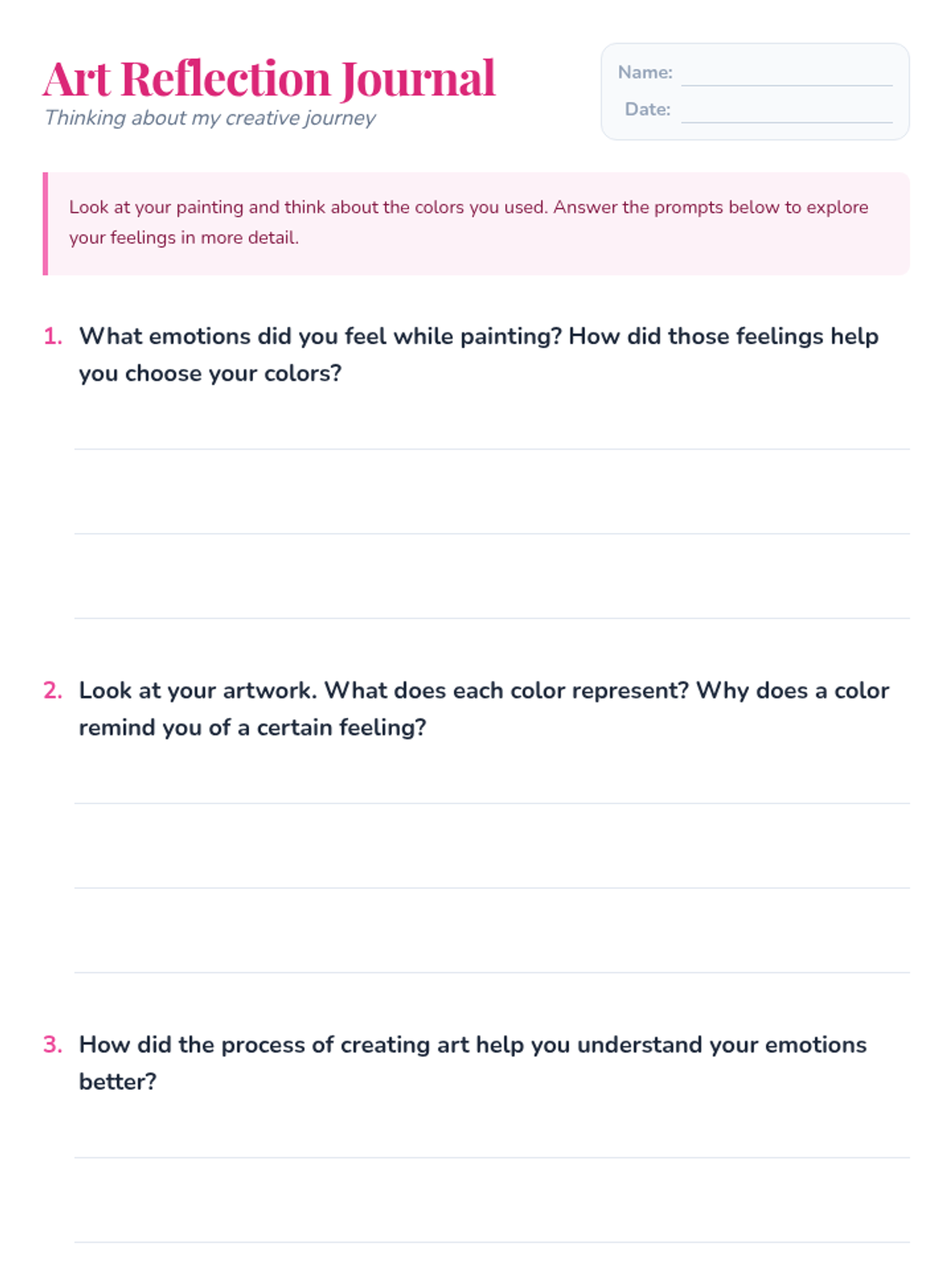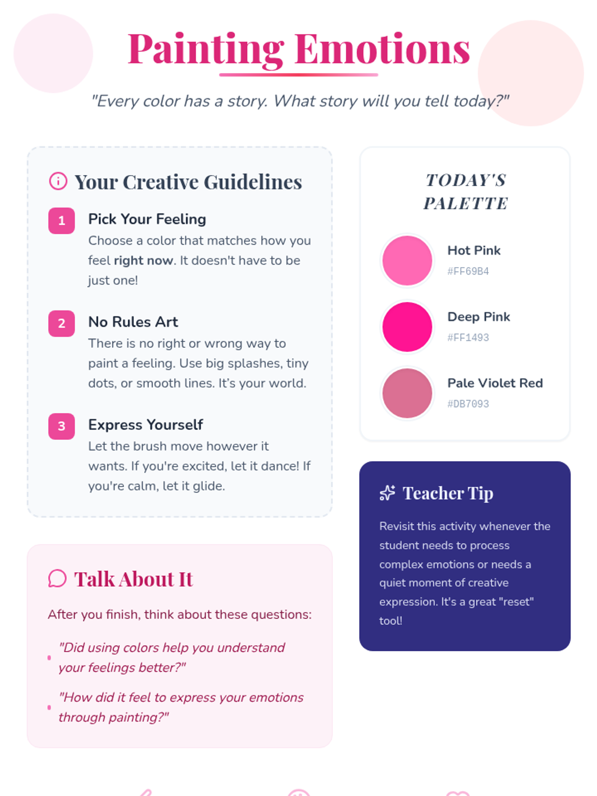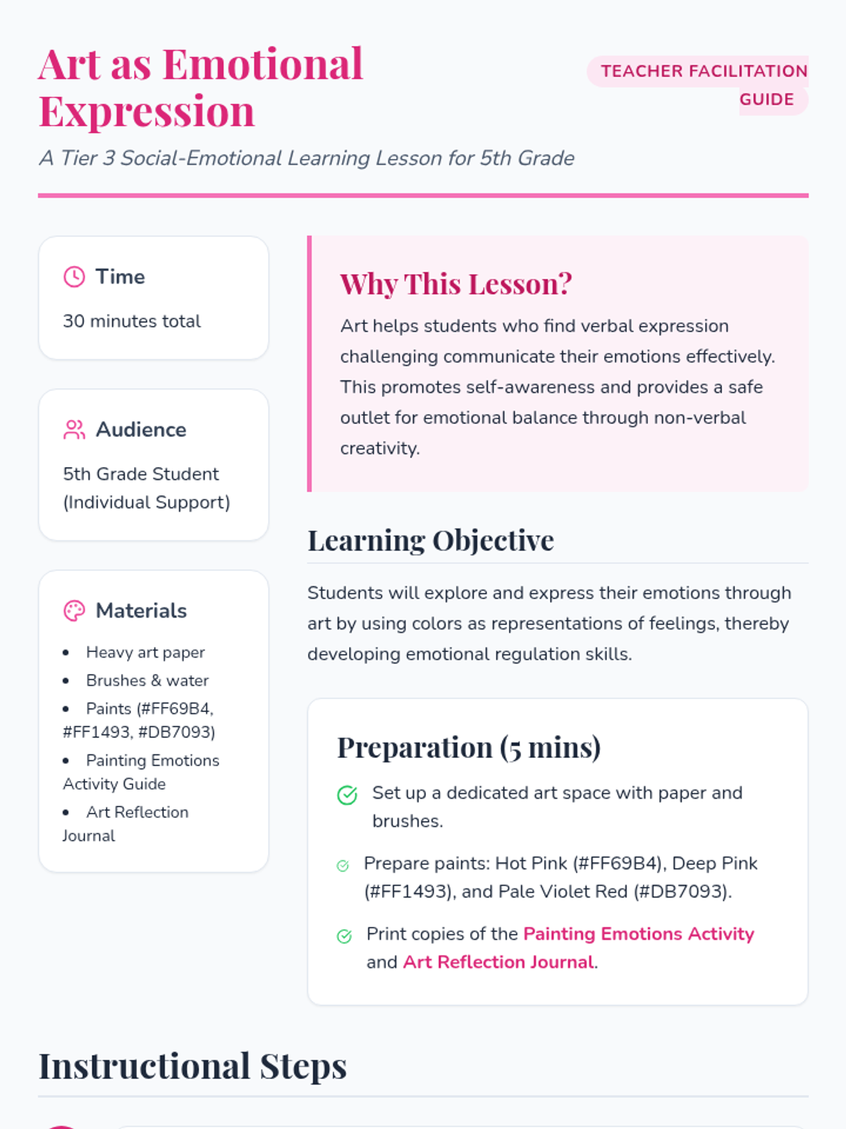 A Tier 3 individual support lesson for 5th grade students to explore and express emotions through artistic color exploration, facilitating emotional regulation for those who find verbal expression challenging.