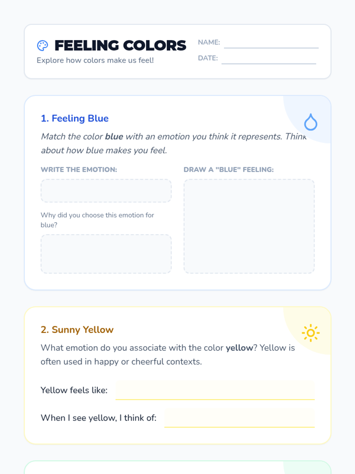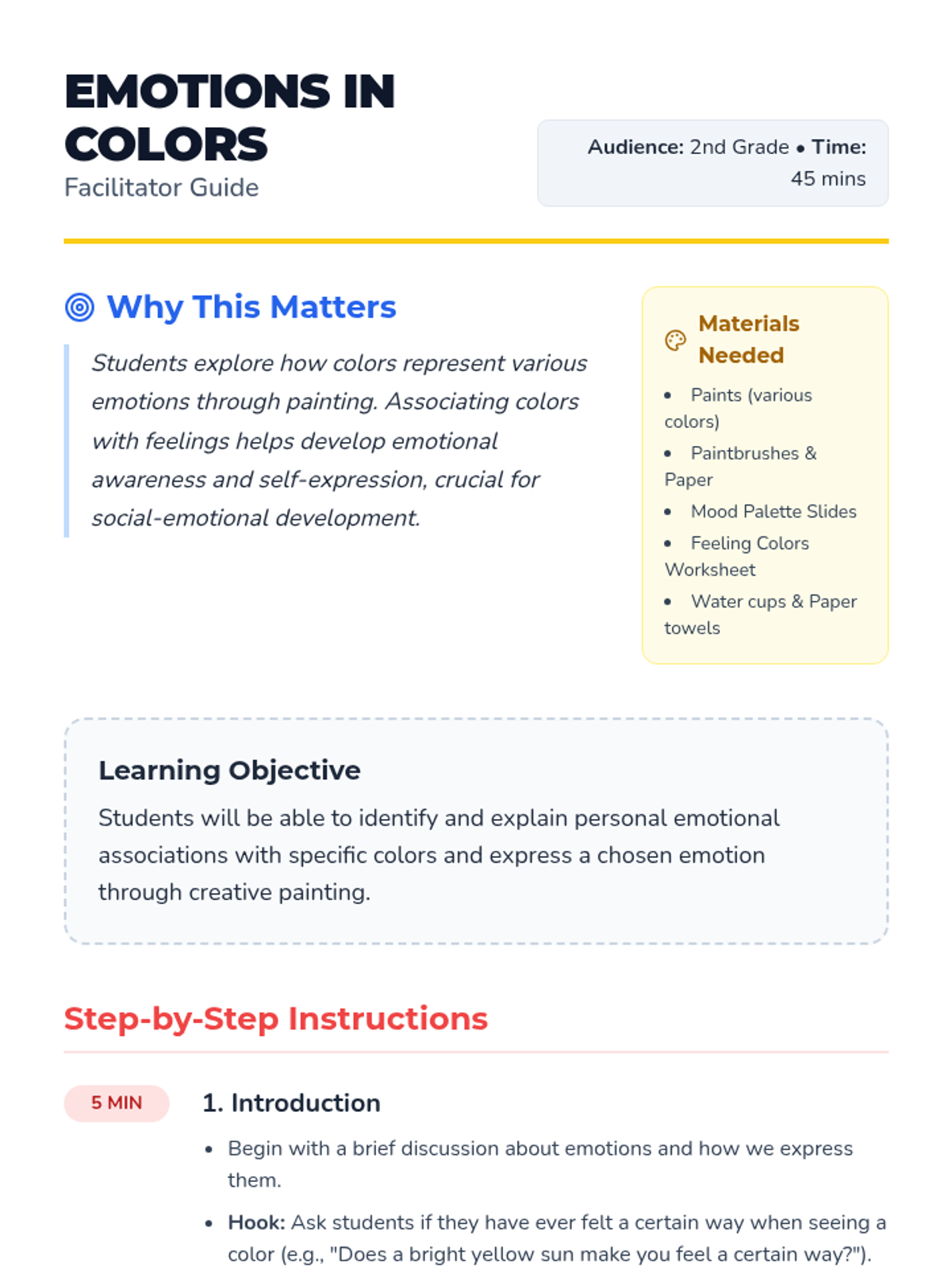 Students explore the connection between colors and emotions through guided discussion, a matching worksheet, and a creative painting activity. This lesson fosters emotional intelligence and artistic expression in 2nd-grade learners.