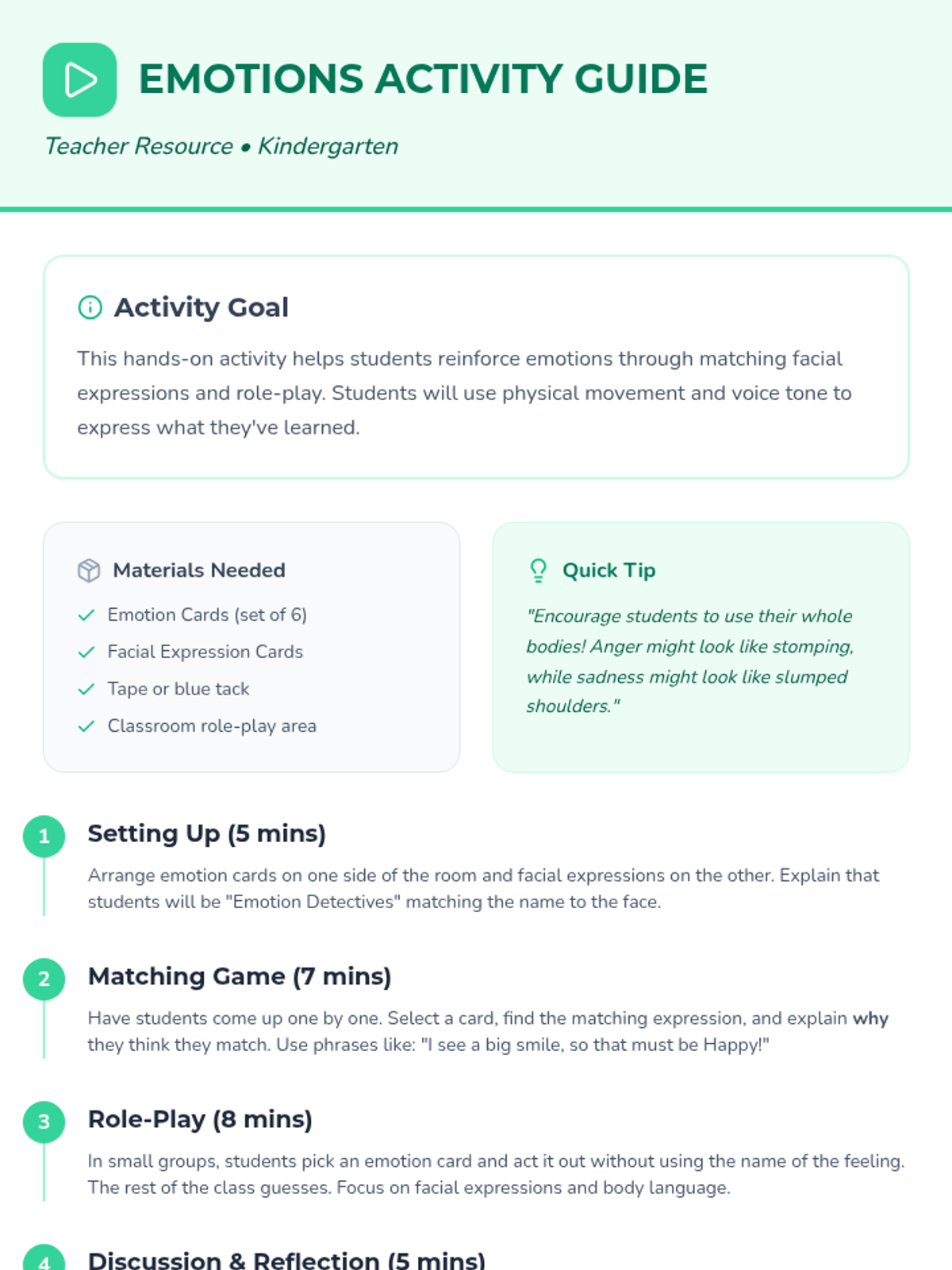 A 30-minute introductory lesson for kindergarteners to identify and express basic emotions using stories, videos, and interactive play.