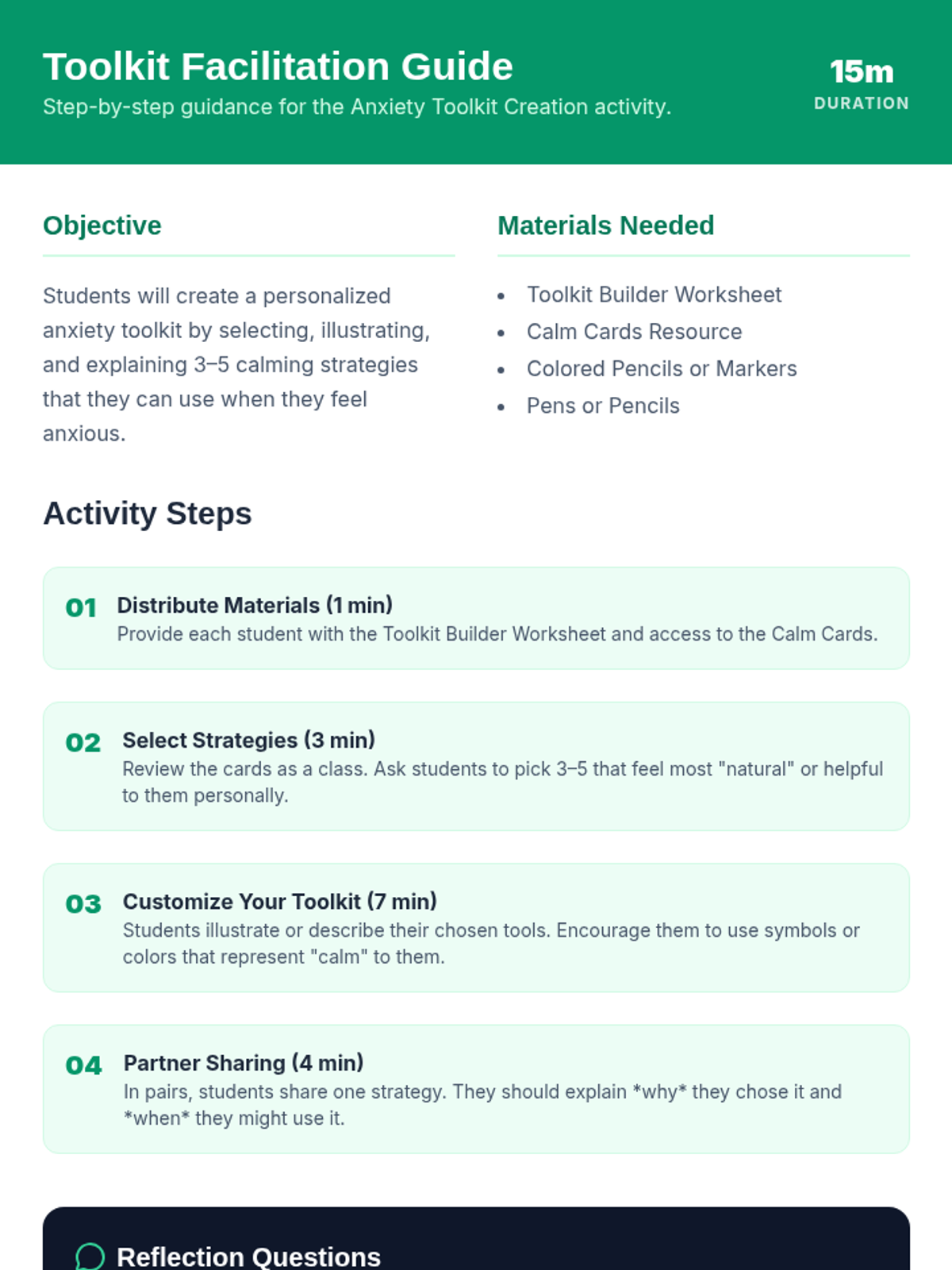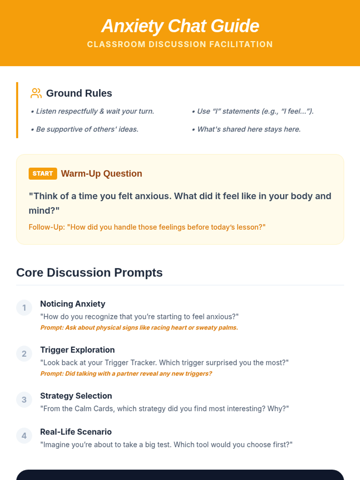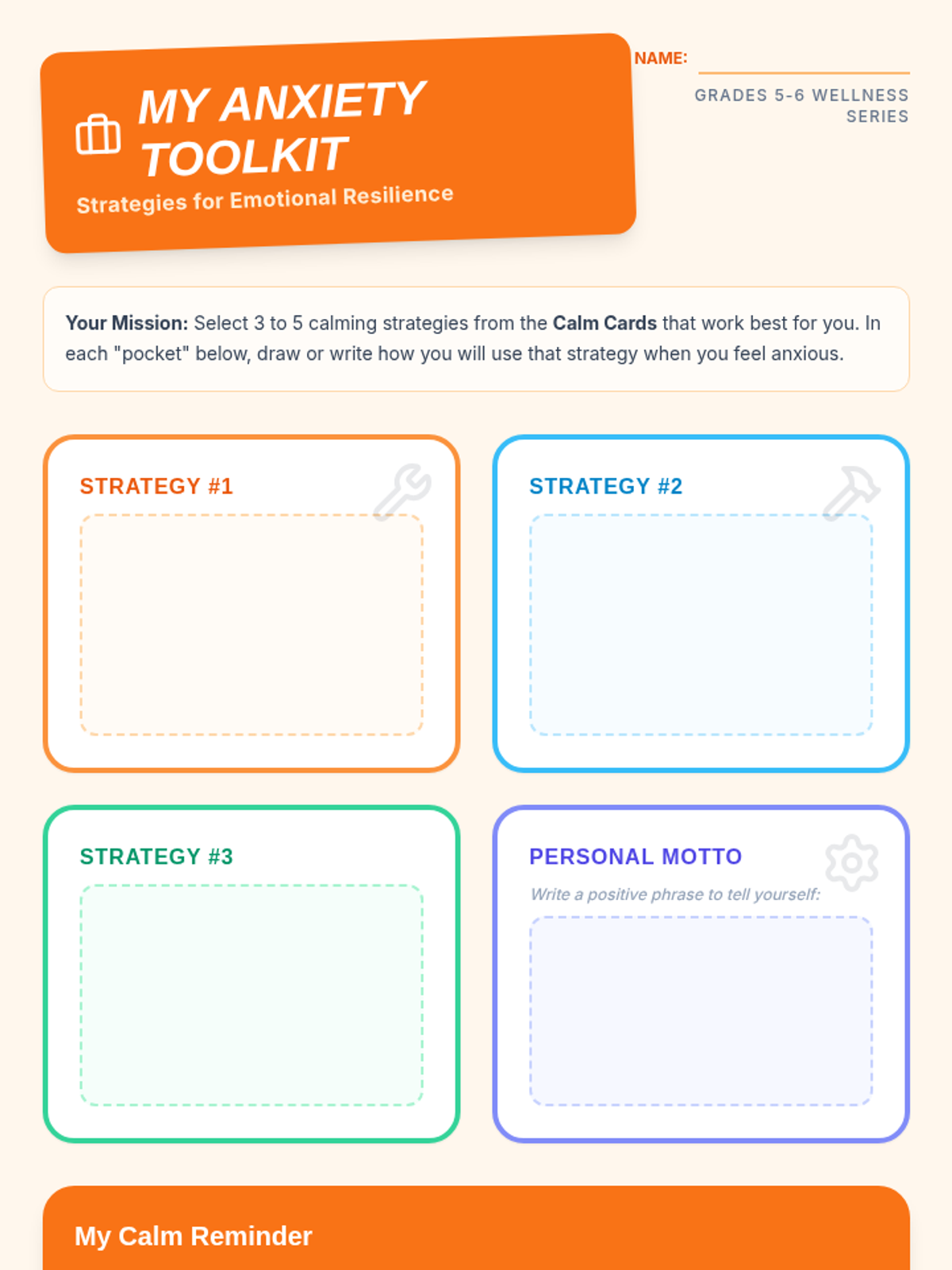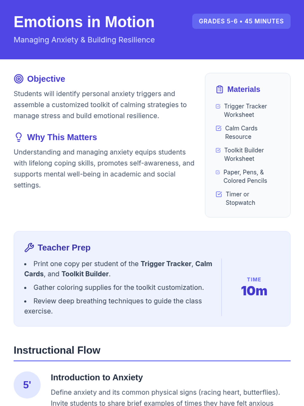 A comprehensive lesson for Grades 5-6 focused on identifying anxiety triggers and building a personalized toolkit of coping strategies to foster emotional resilience.