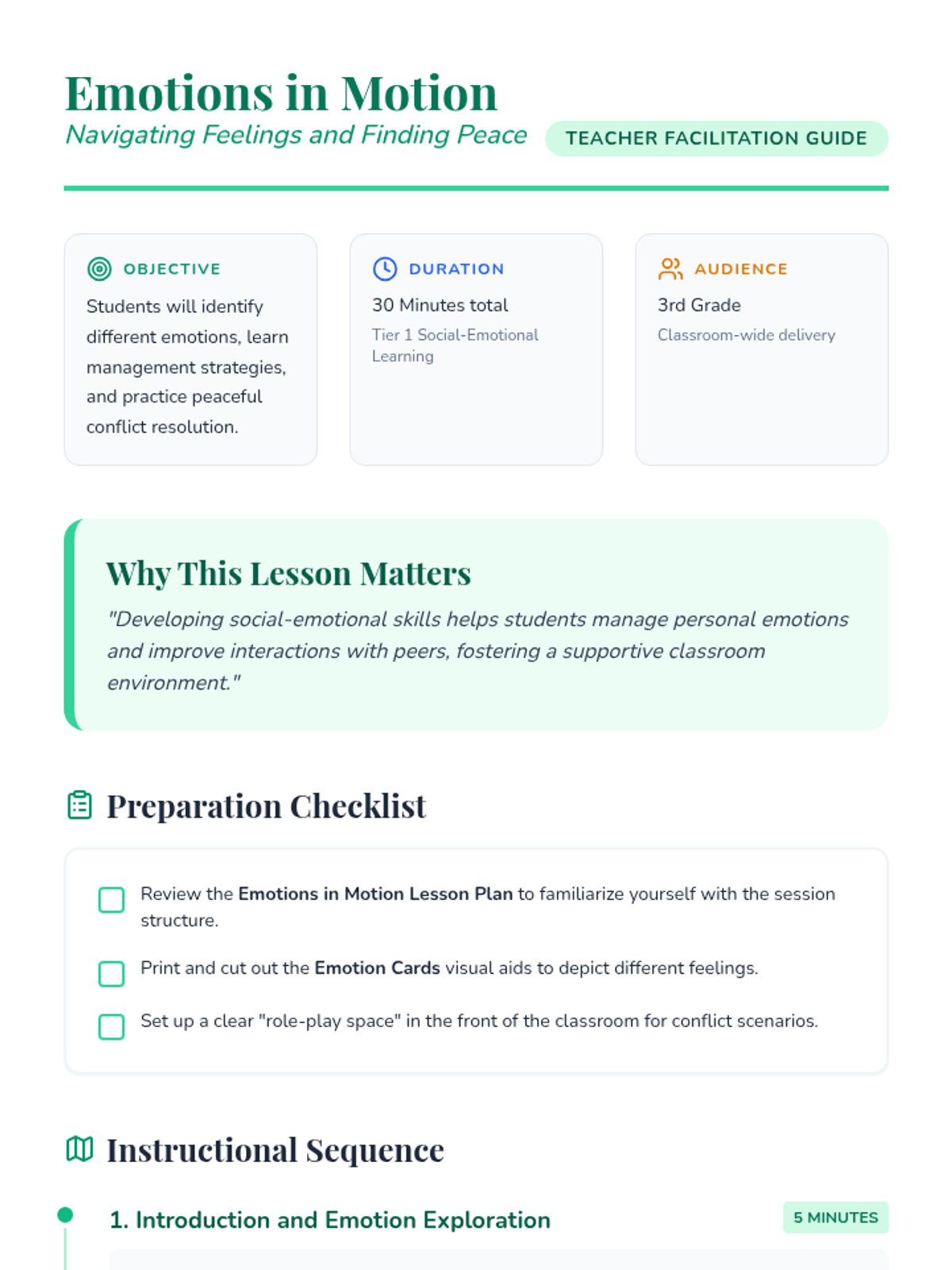 This 30-minute lesson for 3rd graders focuses on managing emotions and conflict resolution through interactive discussion, emotion identification cards, and role-playing scenarios.