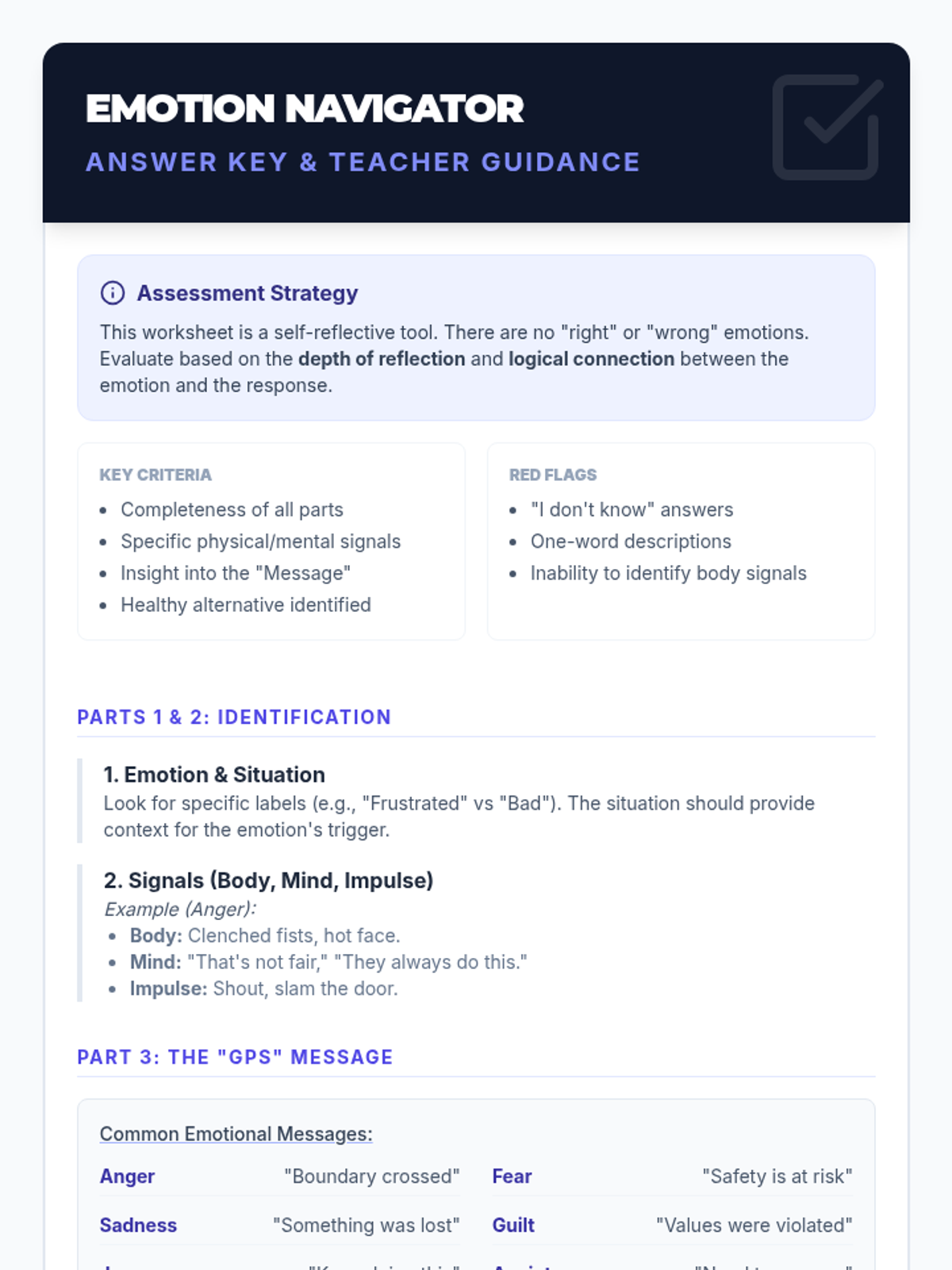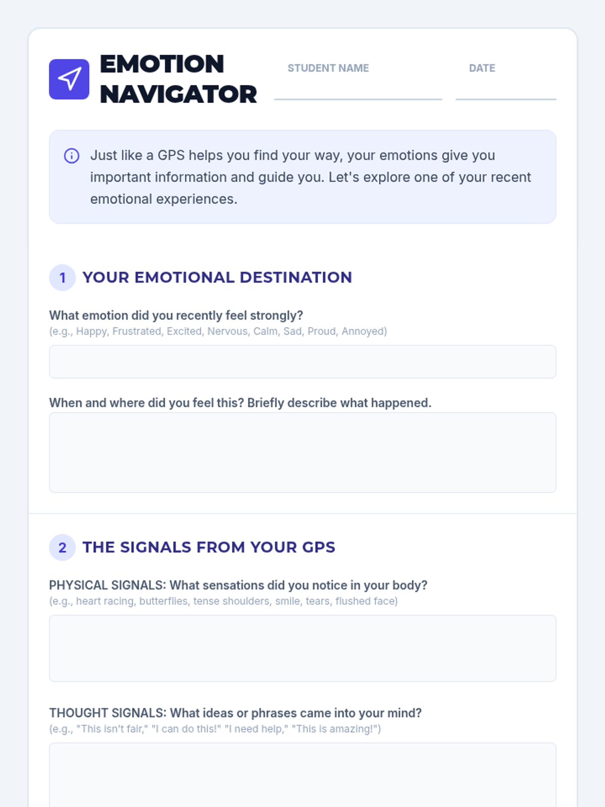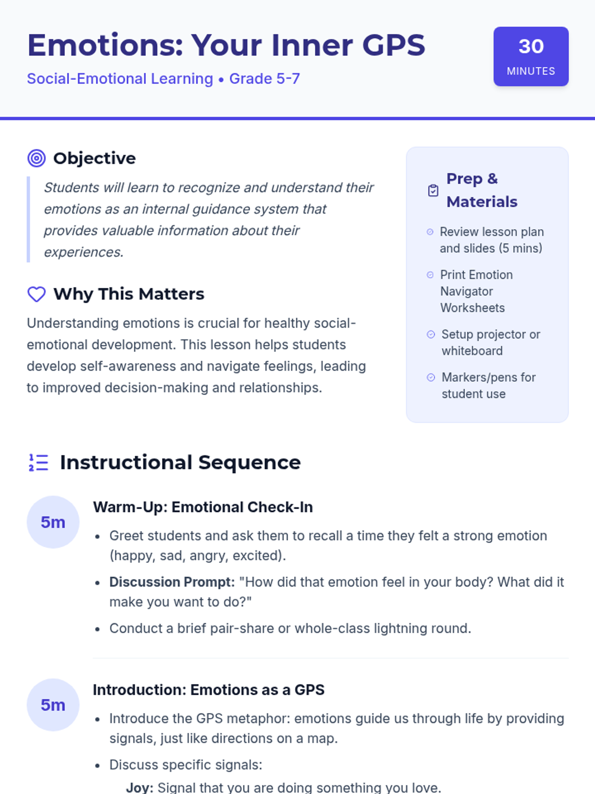 This lesson helps students understand that their emotions act like an internal guidance system (GPS), providing valuable information about their experiences to help them navigate social and personal challenges.