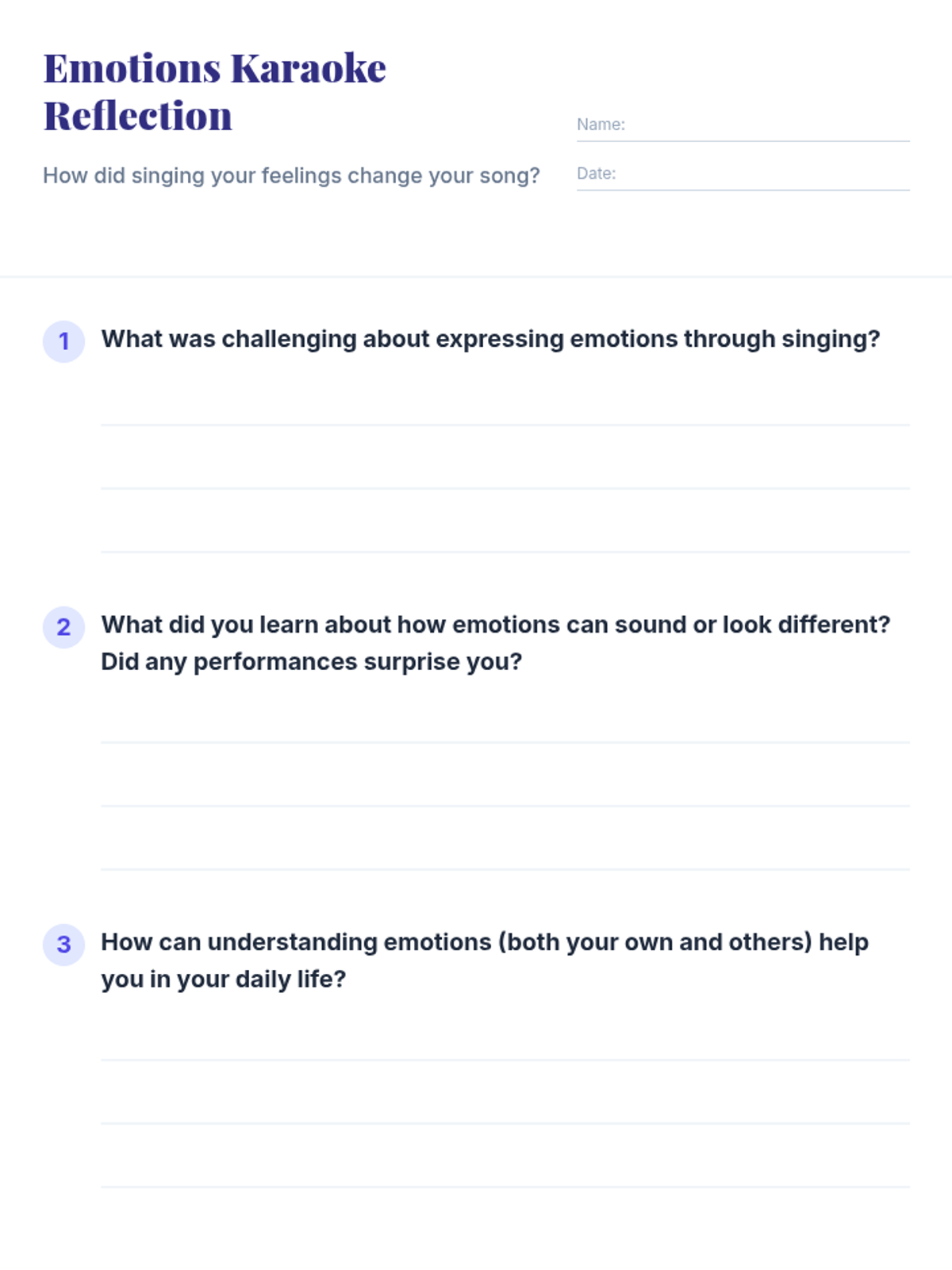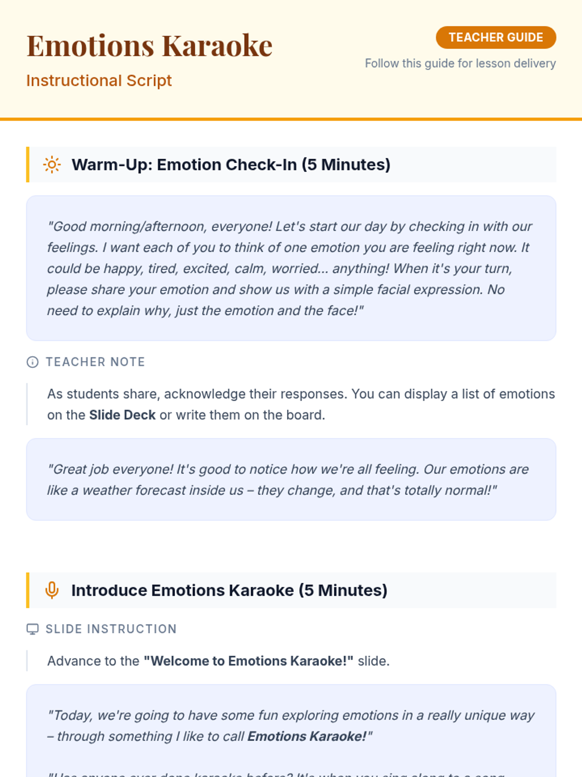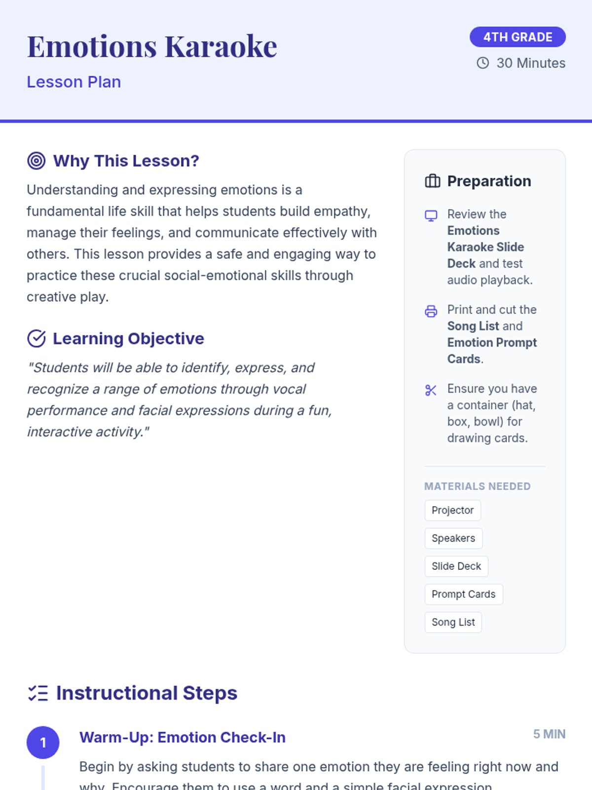 A fun, interactive 30-minute lesson for 4th graders to explore and express emotions through a 'karaoke' activity, fostering social-emotional skills like empathy and communication.