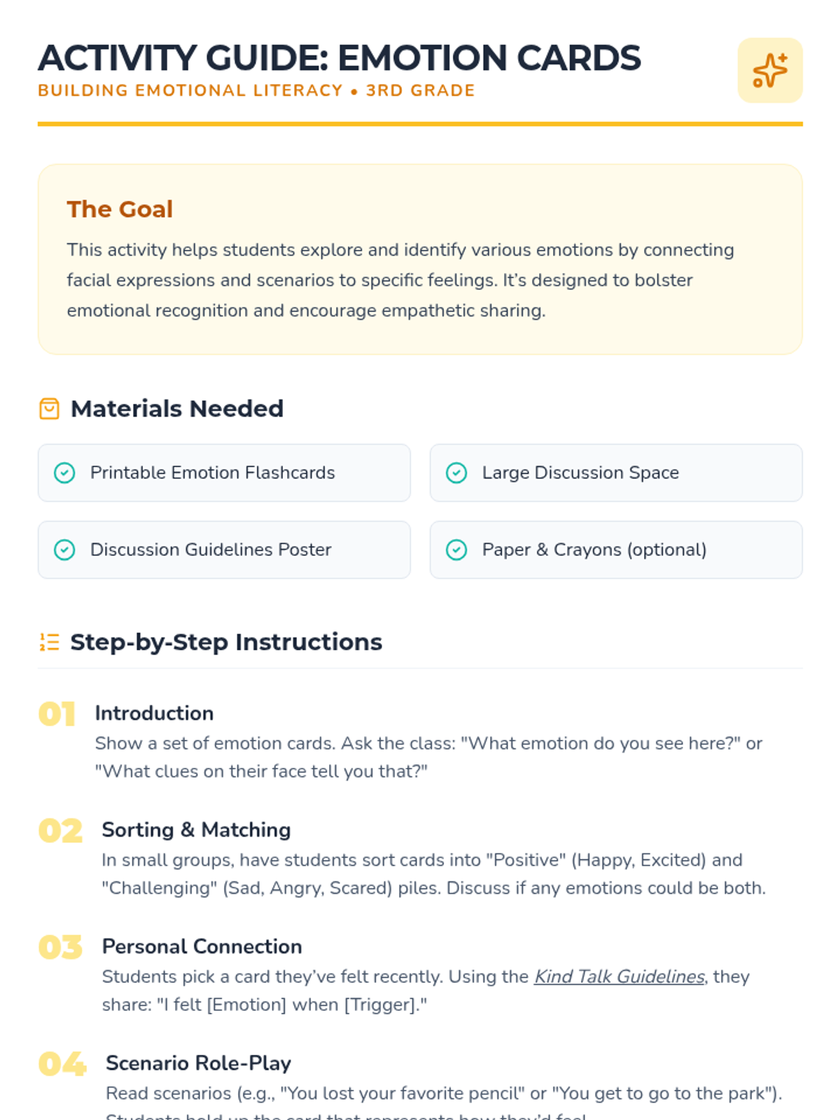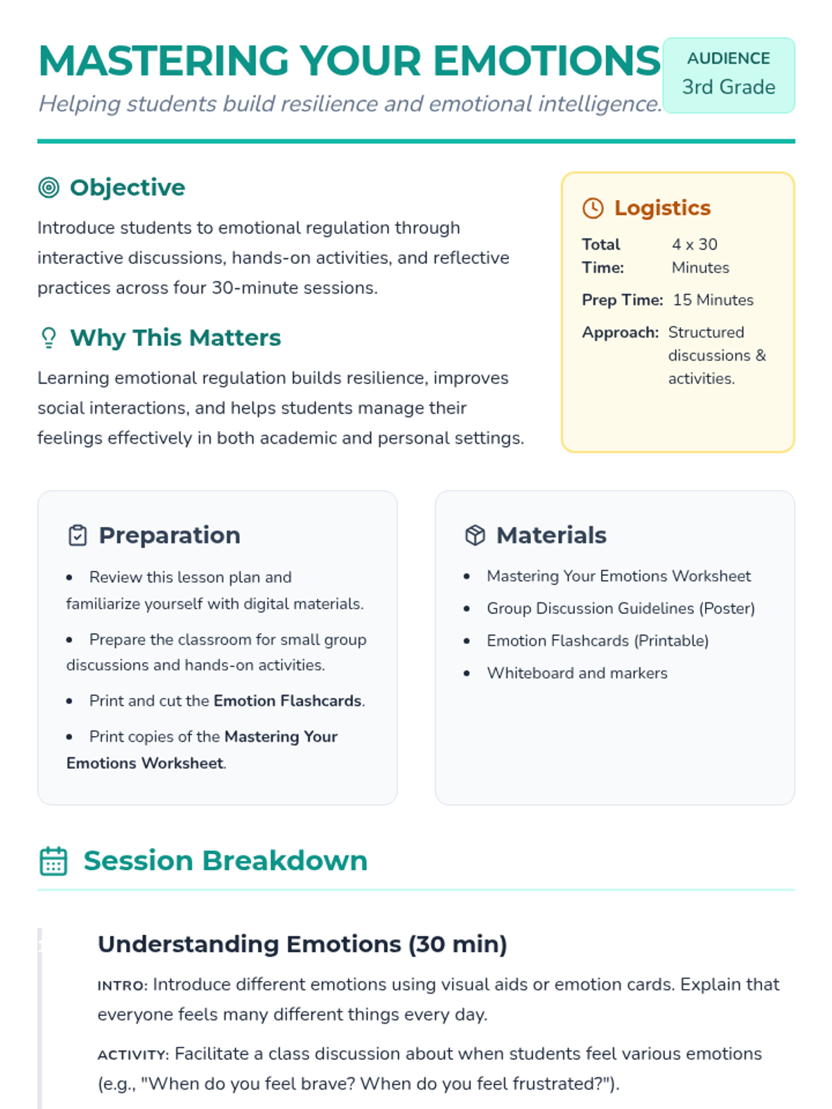 This 4-session lesson introduces 3rd graders to emotional regulation, covering recognition, identification, management, and reflection on their feelings.
