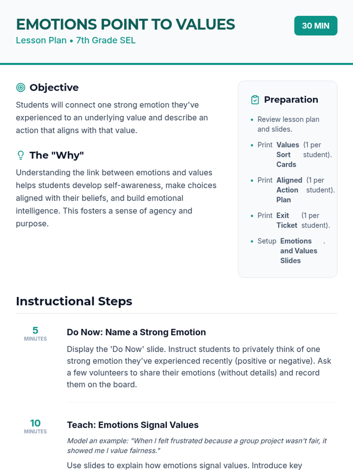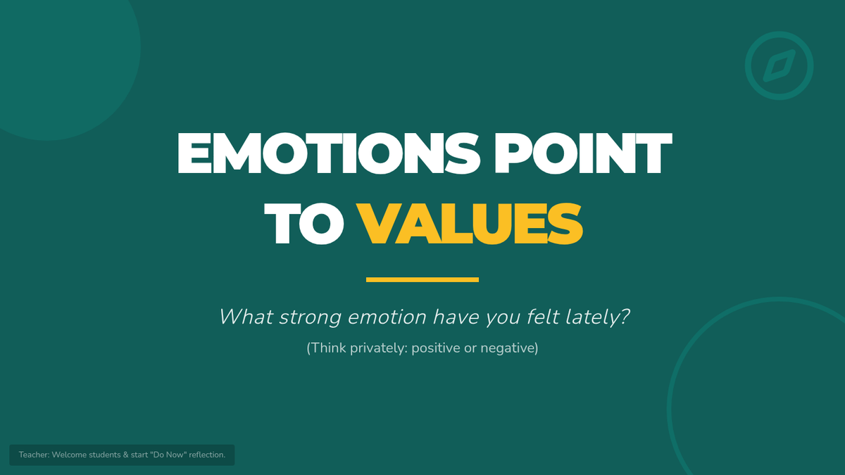 This 30-minute SEL lesson for 7th graders explores the connection between strong emotions and core values, helping students use their feelings as a compass for personal alignment and agency.