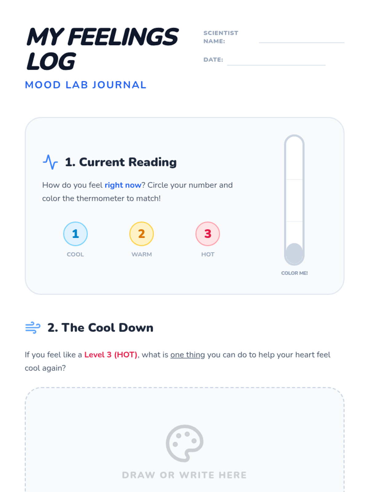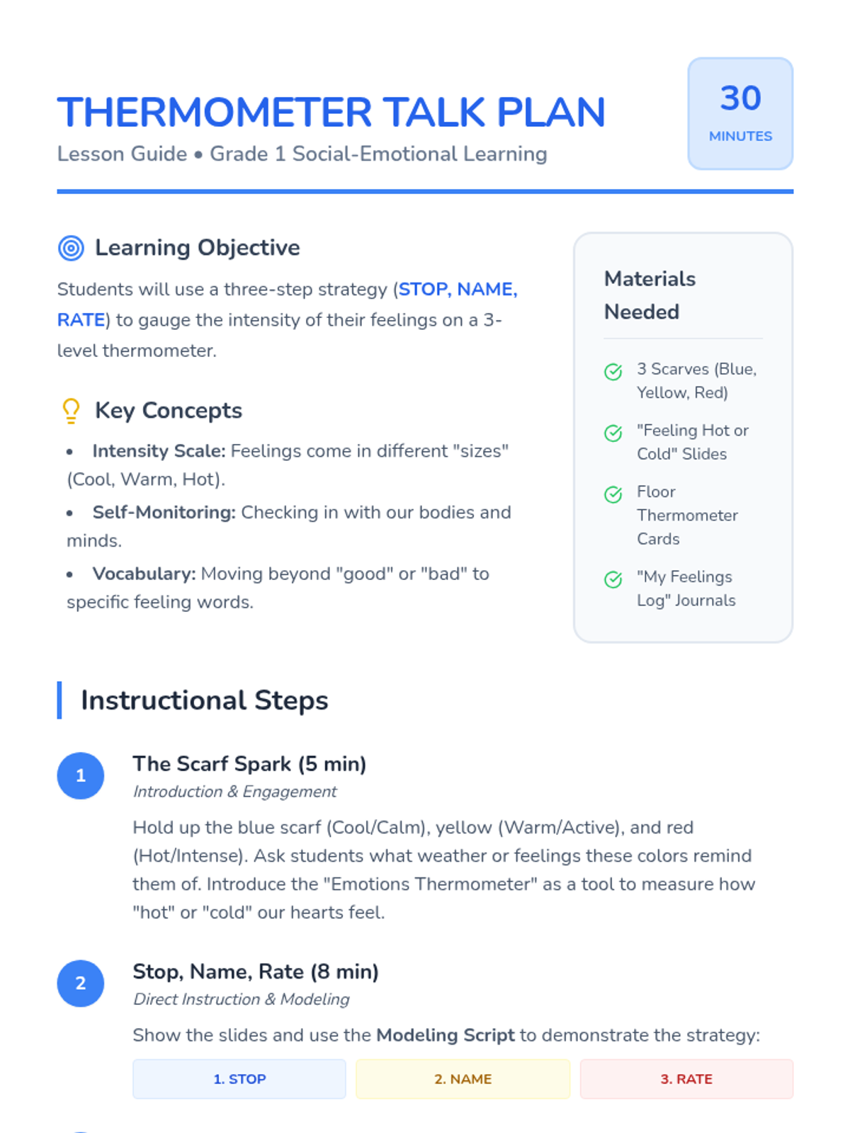 A 1st-grade lesson introducing a three-step strategy (stop, name, rate) to help students identify and measure the intensity of their emotions using a 3-level thermometer visual.