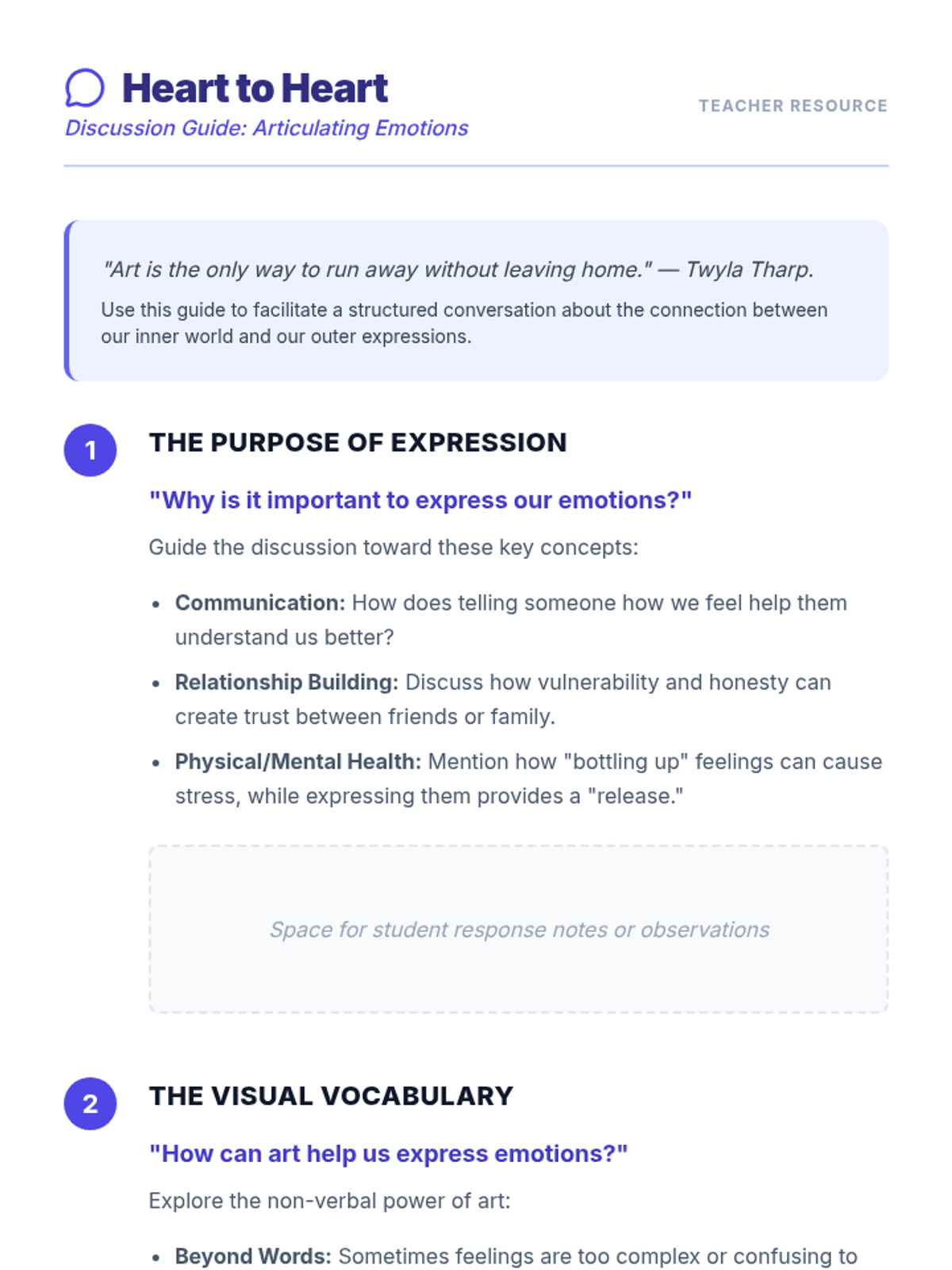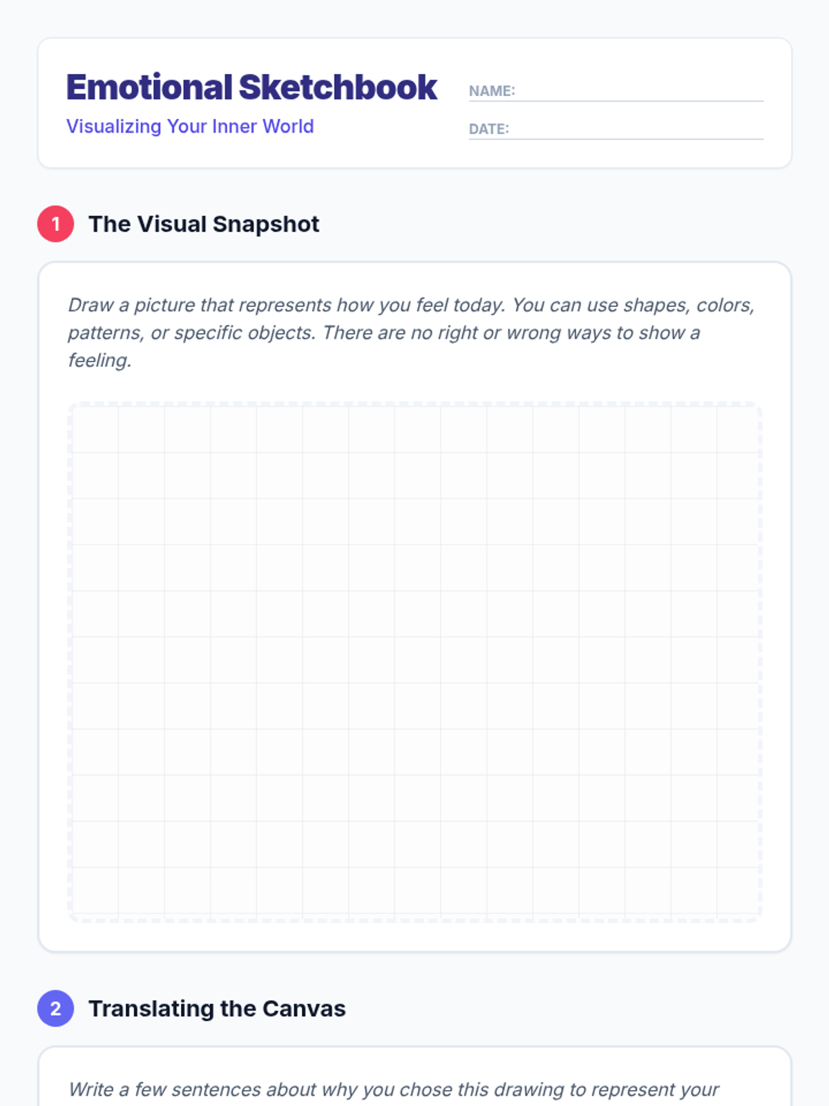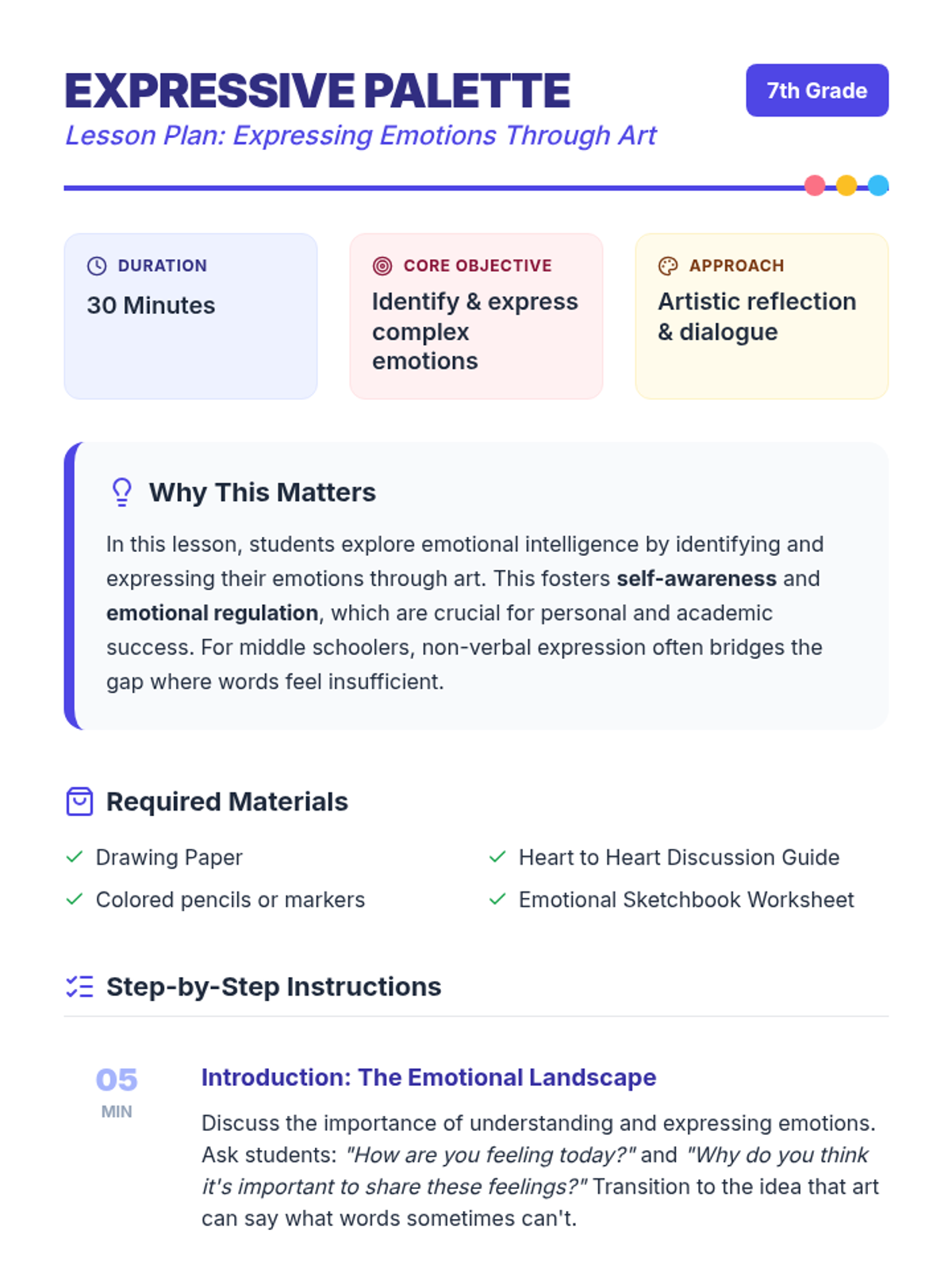 Students explore emotional intelligence by identifying and expressing their emotions through art and discussion, fostering self-awareness and regulation skills.