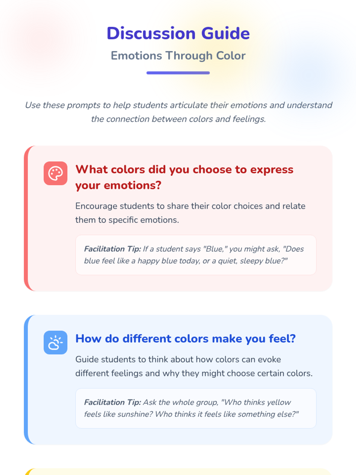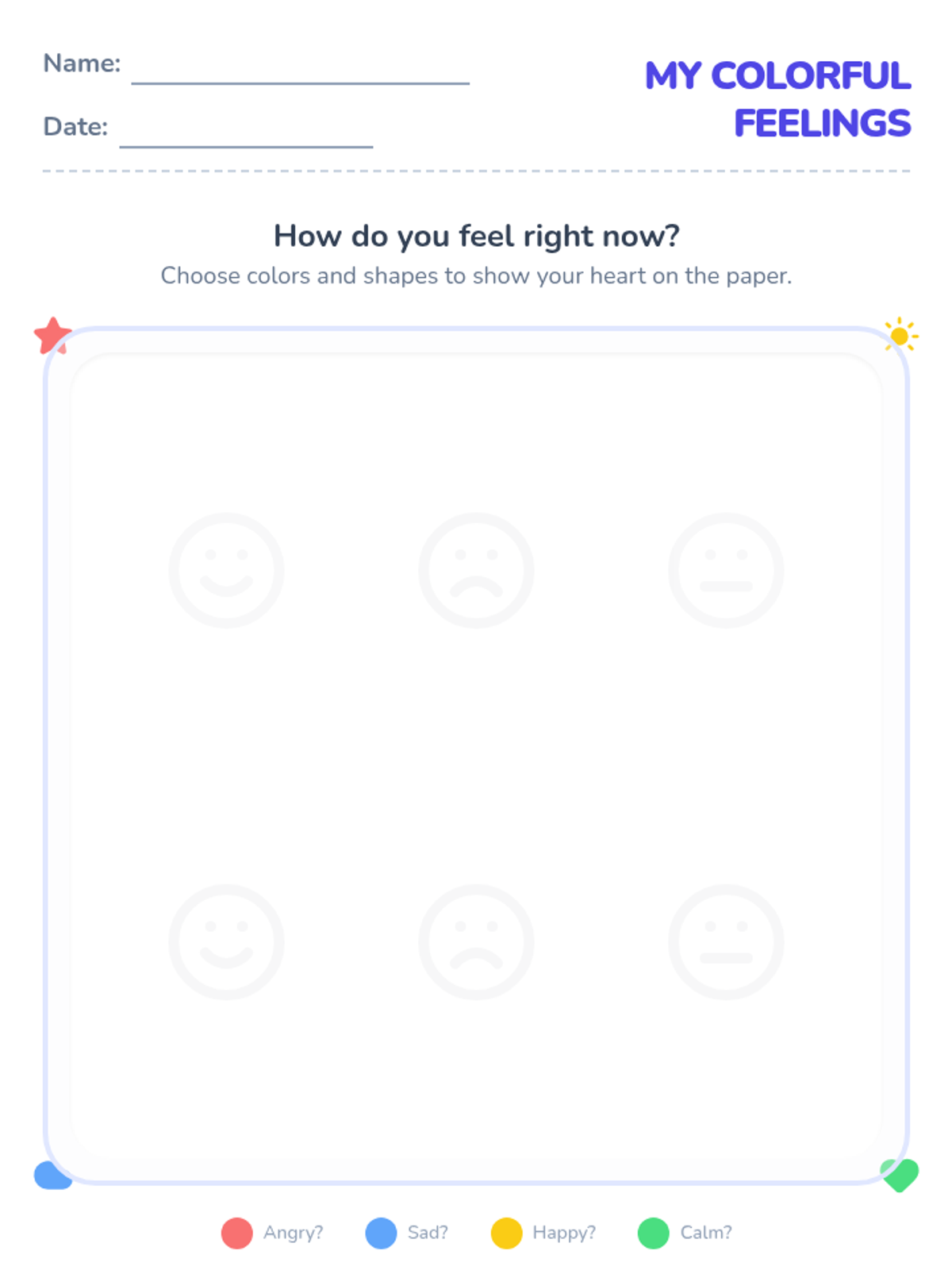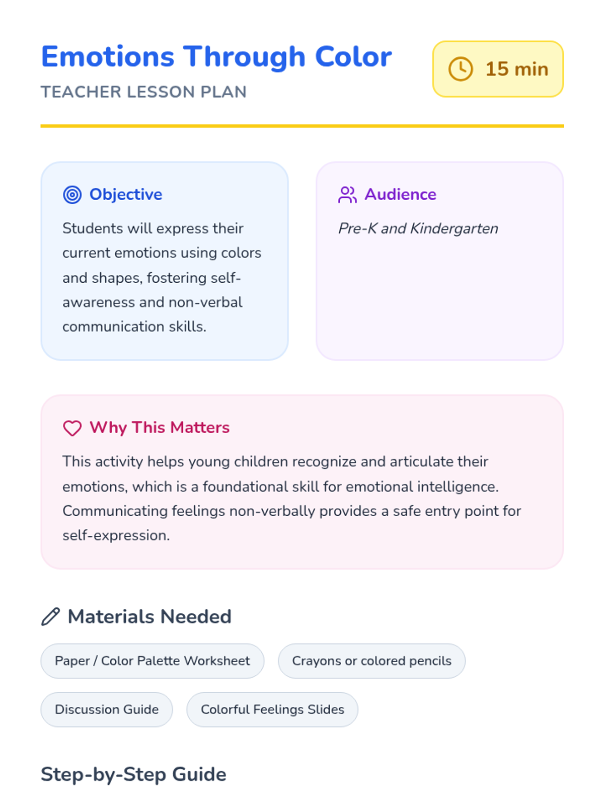 A 15-minute introductory lesson for Pre-K and Kindergarten students to explore and express their current emotions using colors and shapes, building foundational emotional intelligence.