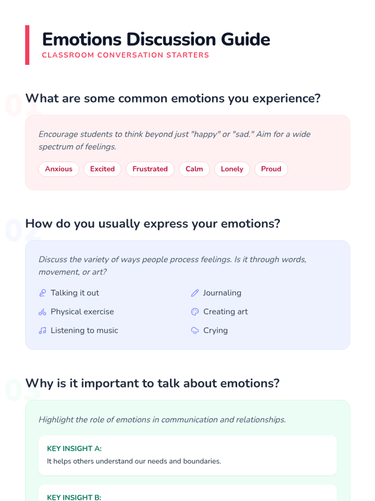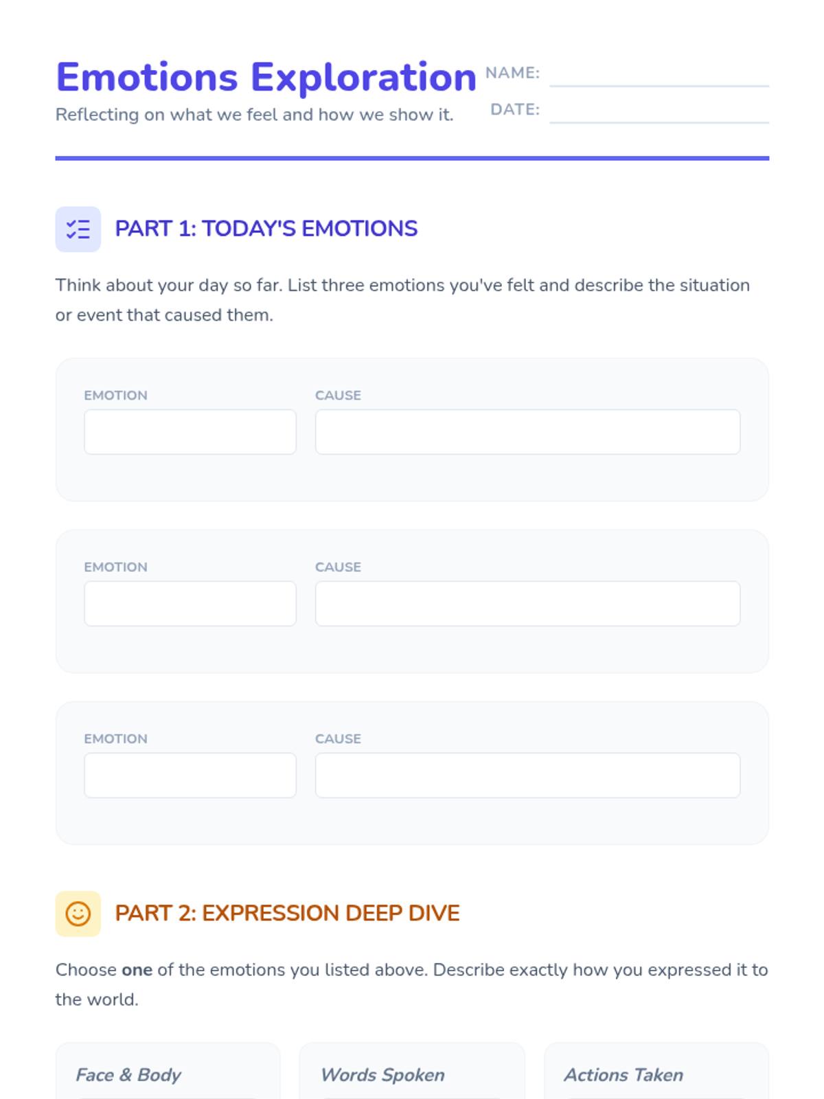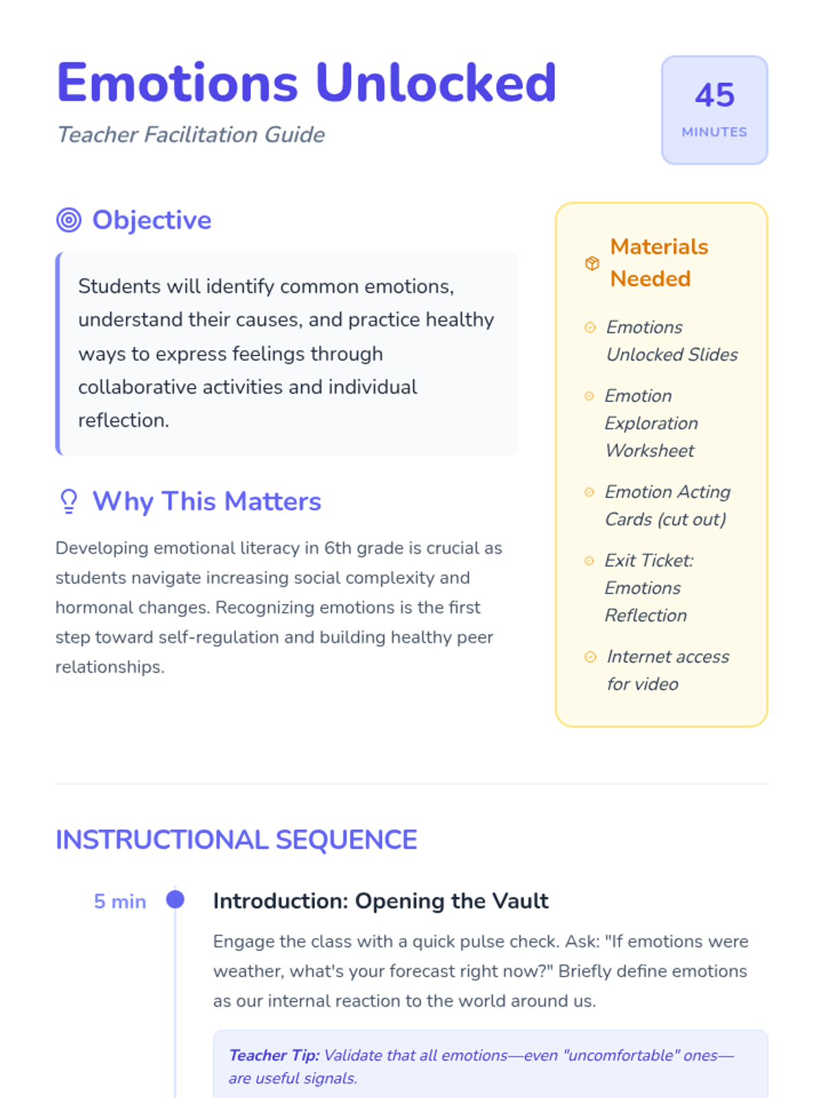 This lesson helps 6th-grade students identify, understand, and express their emotions through a combination of video, interactive games, and personal reflection. Students will develop social-emotional awareness and learn the importance of communicating their feelings.